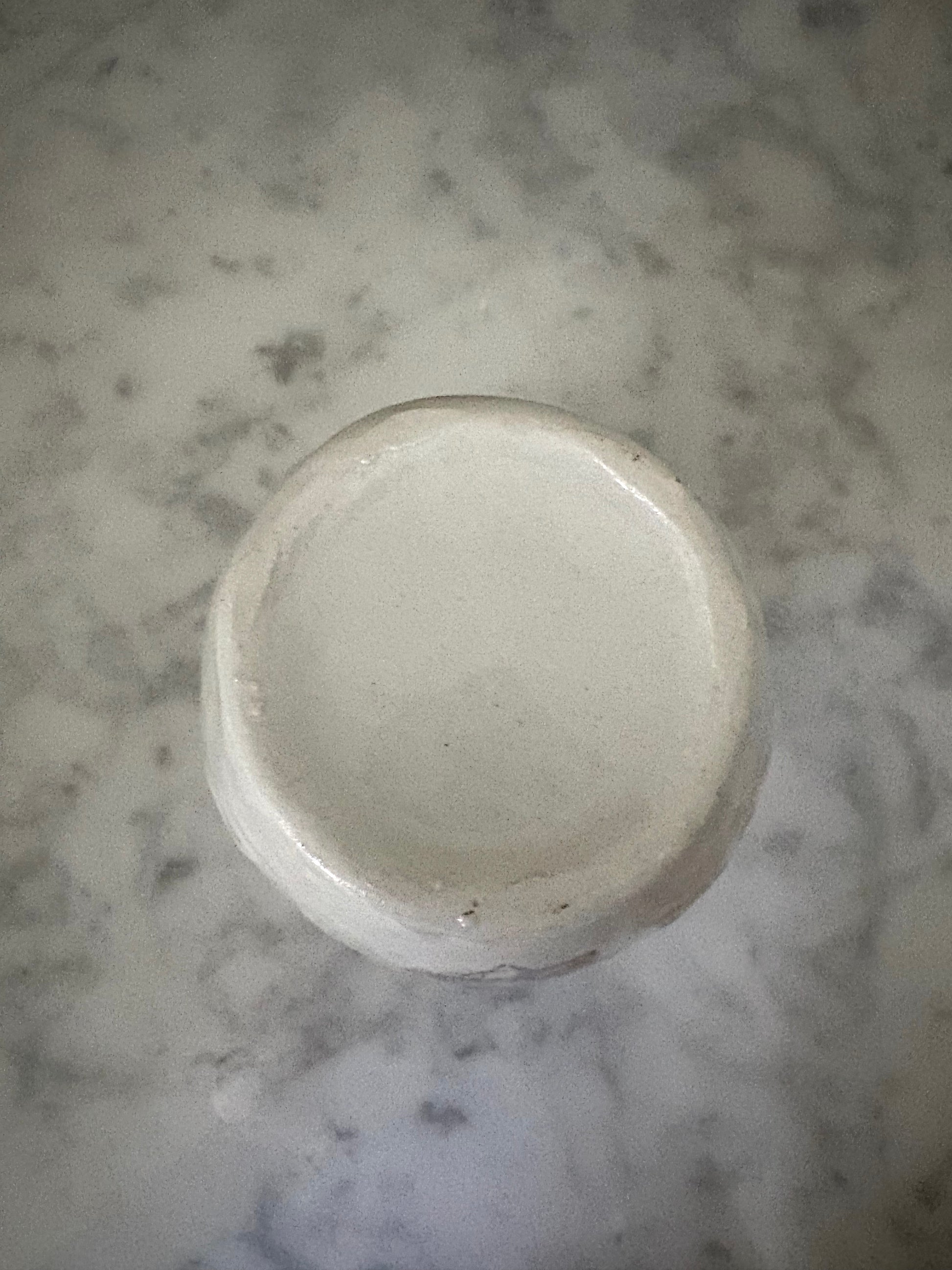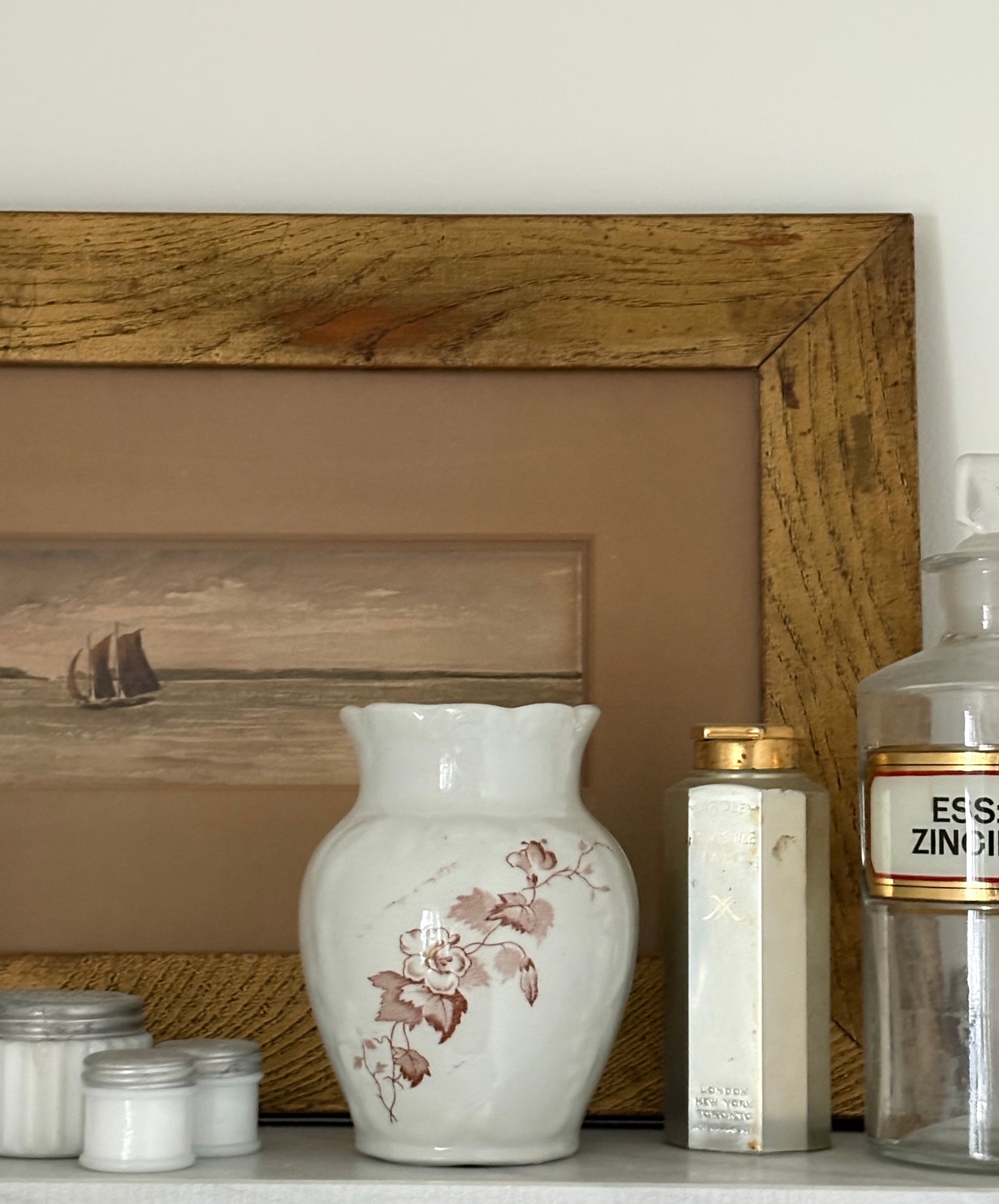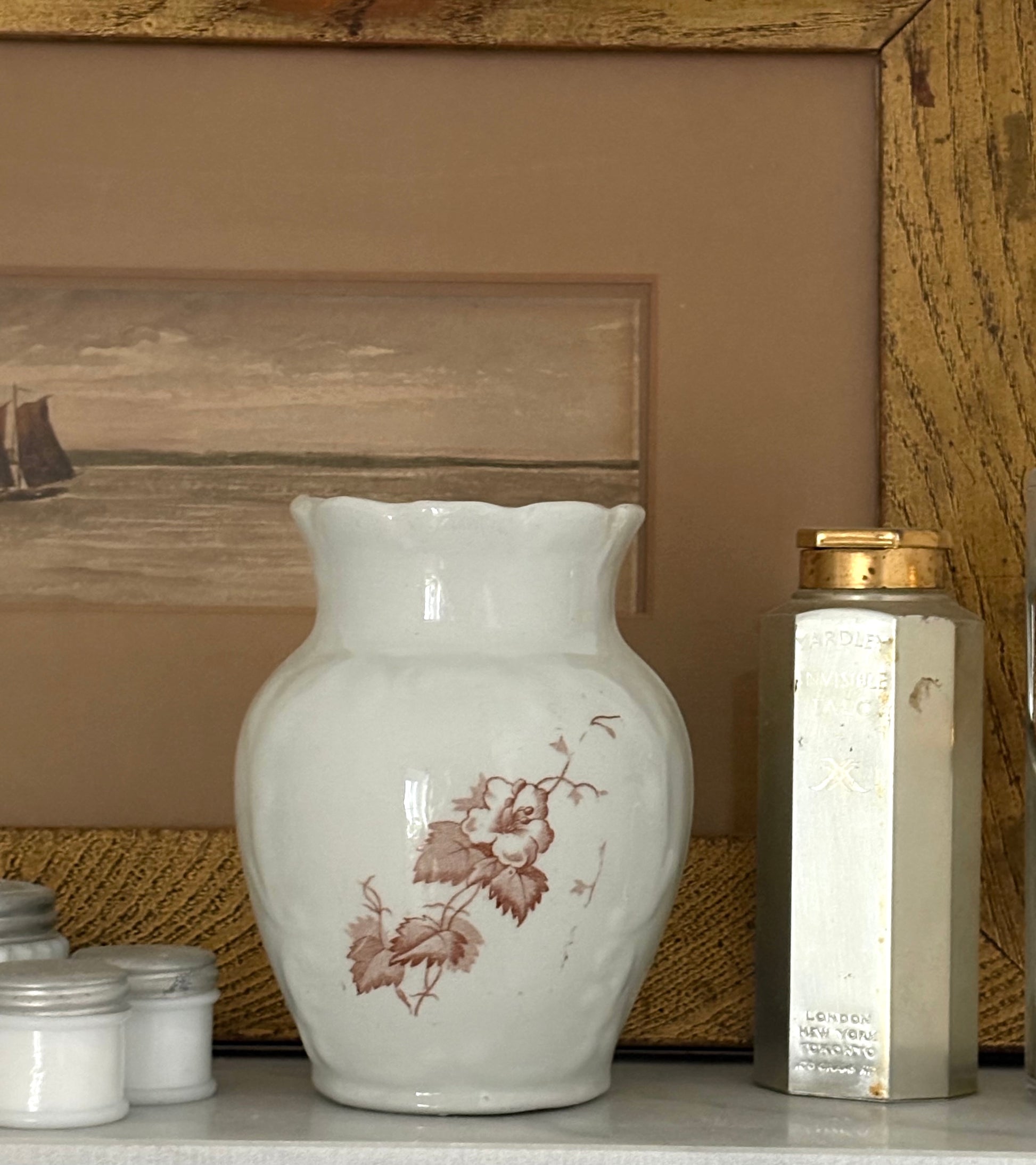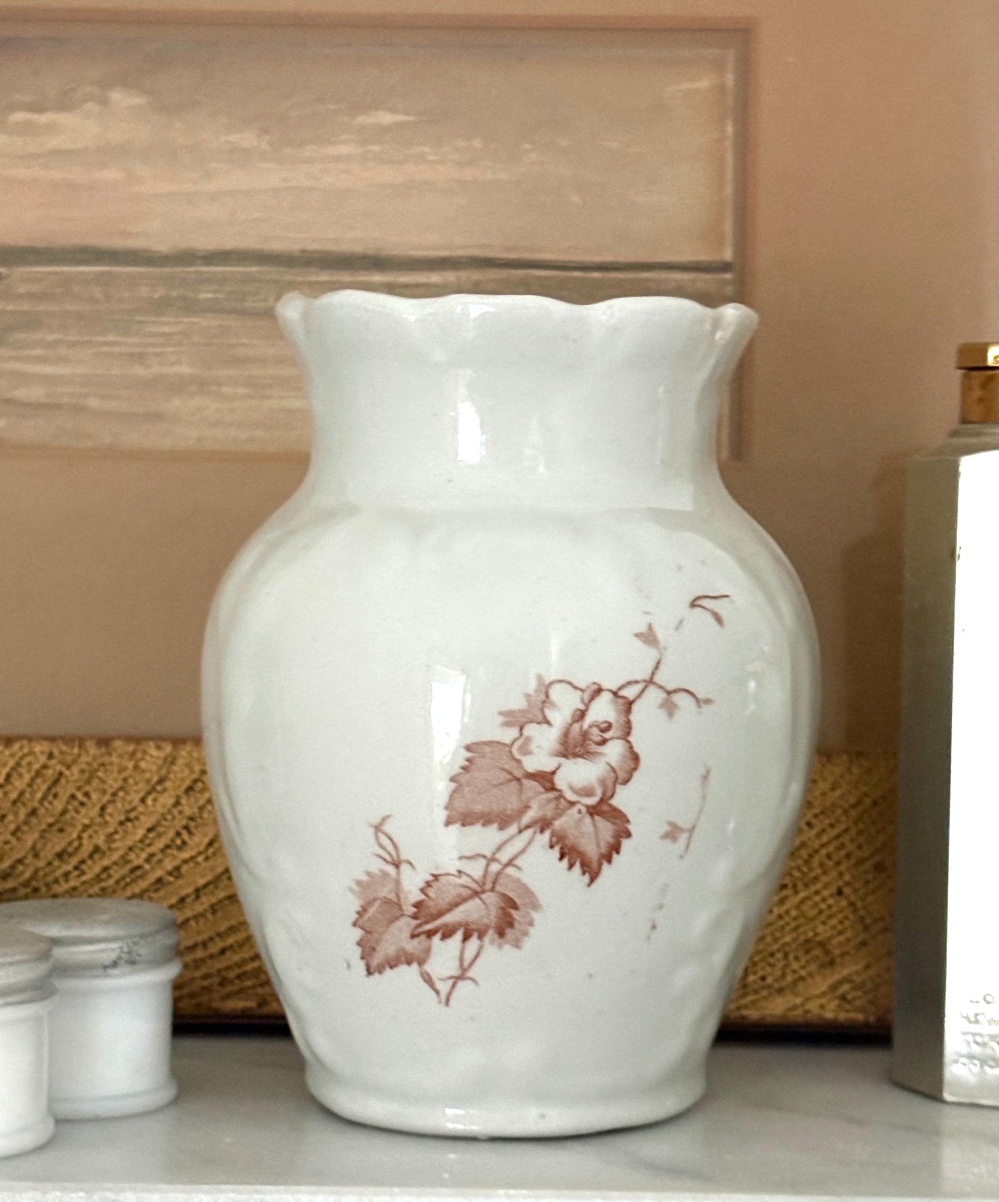 This charming Victorian-era English transferware toothbrush holder has a delicate brown botanical motif of trailing vines on creamy white ironstone, A lovely piece for the bathroom vanity- it easily doubles as a vase for displaying seasonal blooms.
