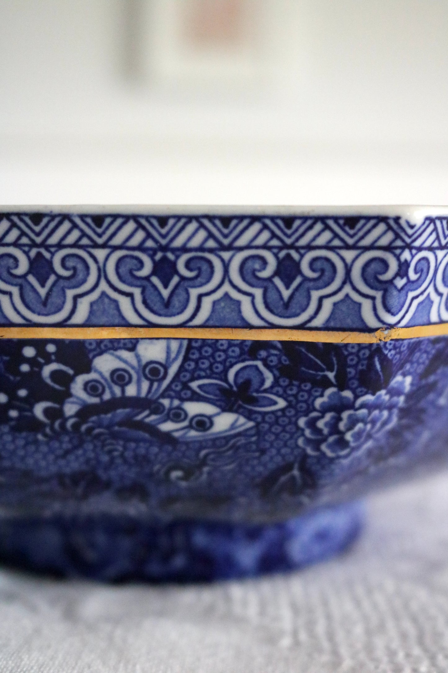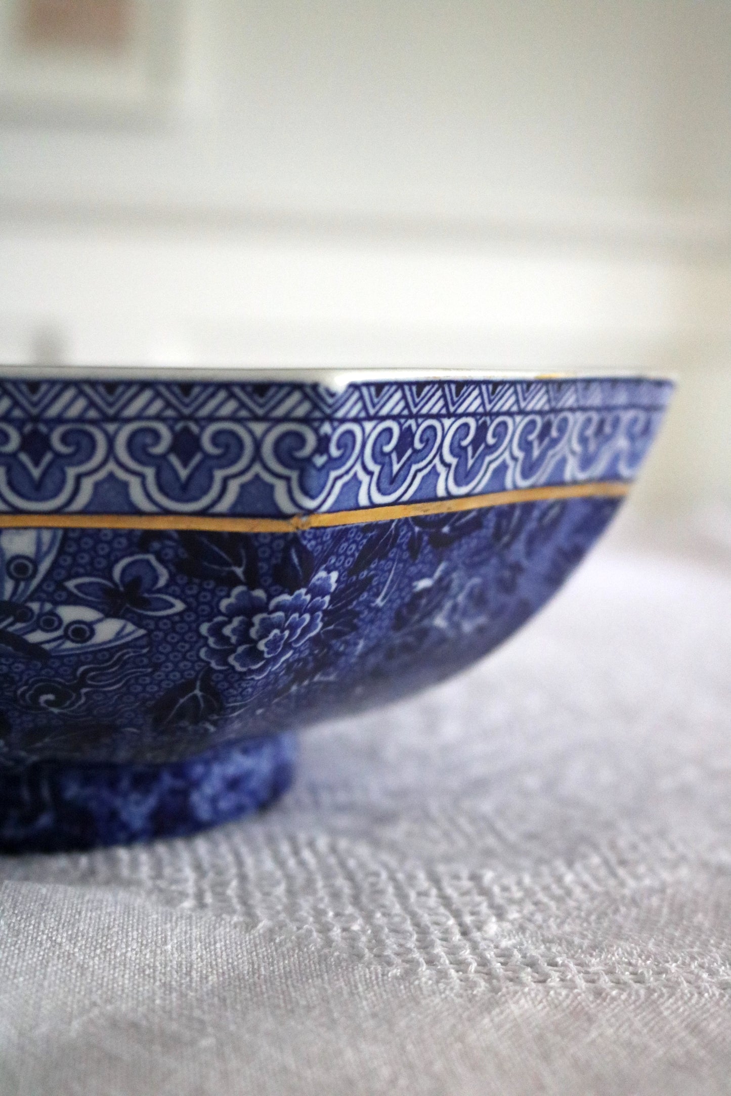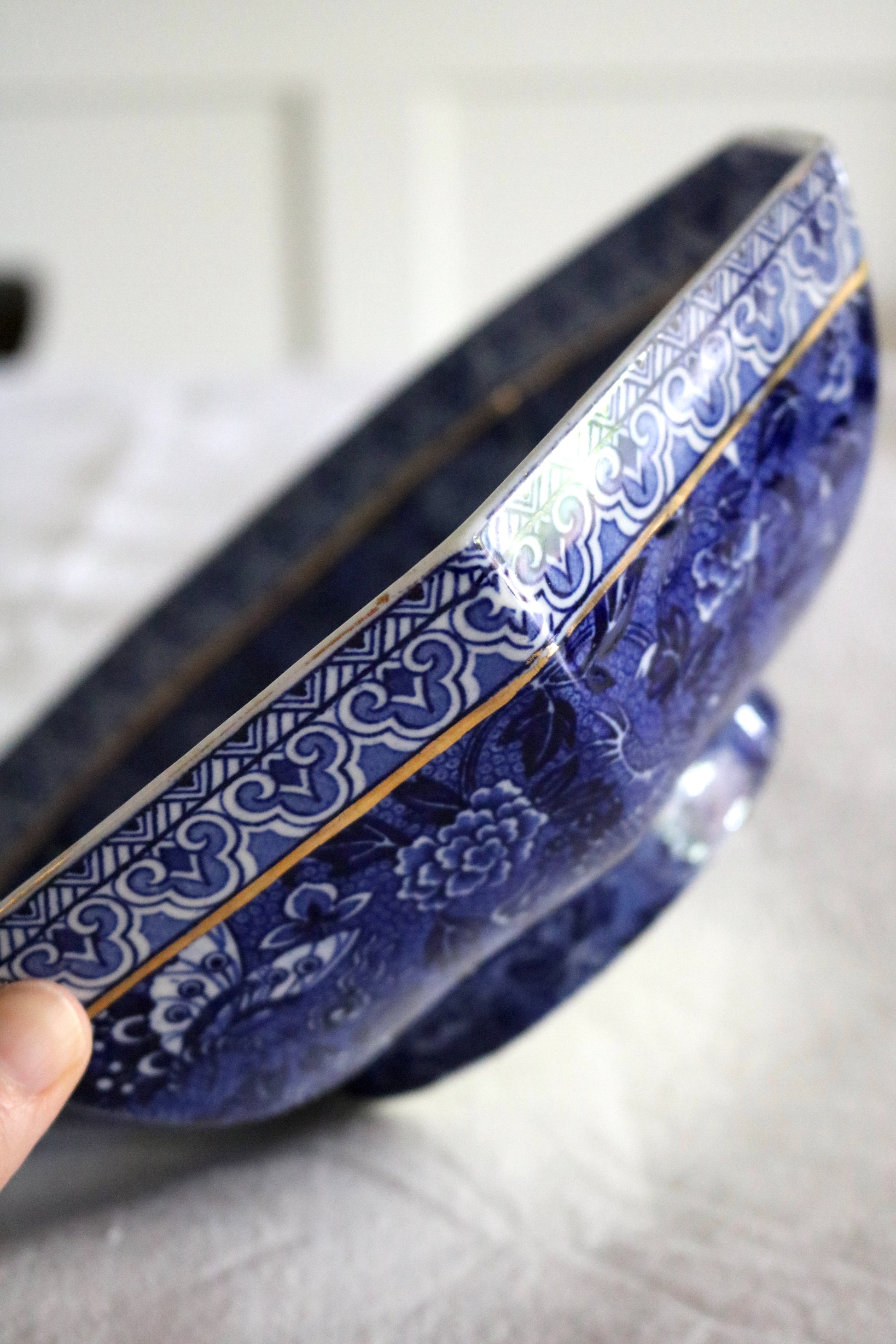 The stunning cobalt blue and white pattern includes flowers, butterflies and dragons. There is a gilded band on inside and outside of bowl.