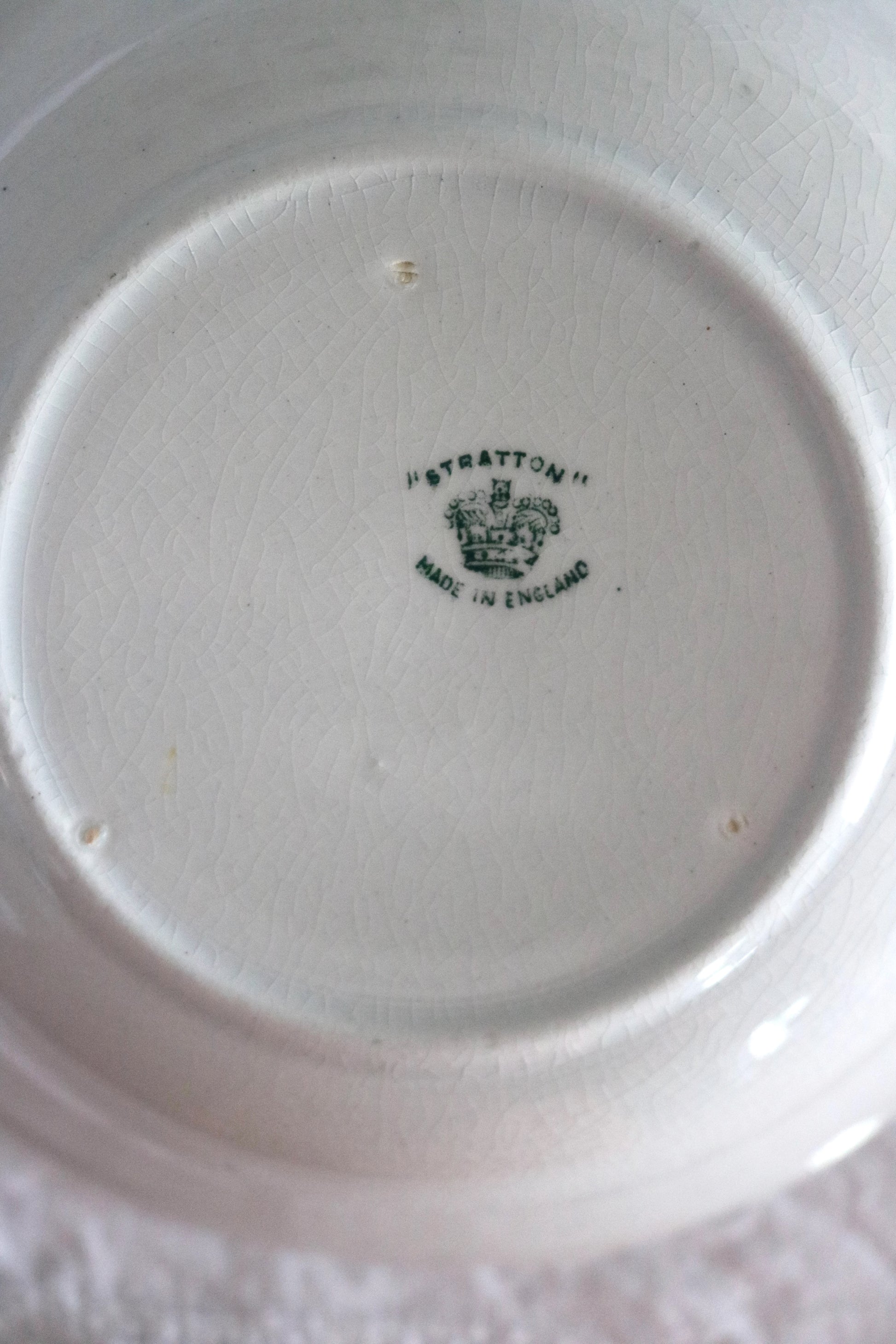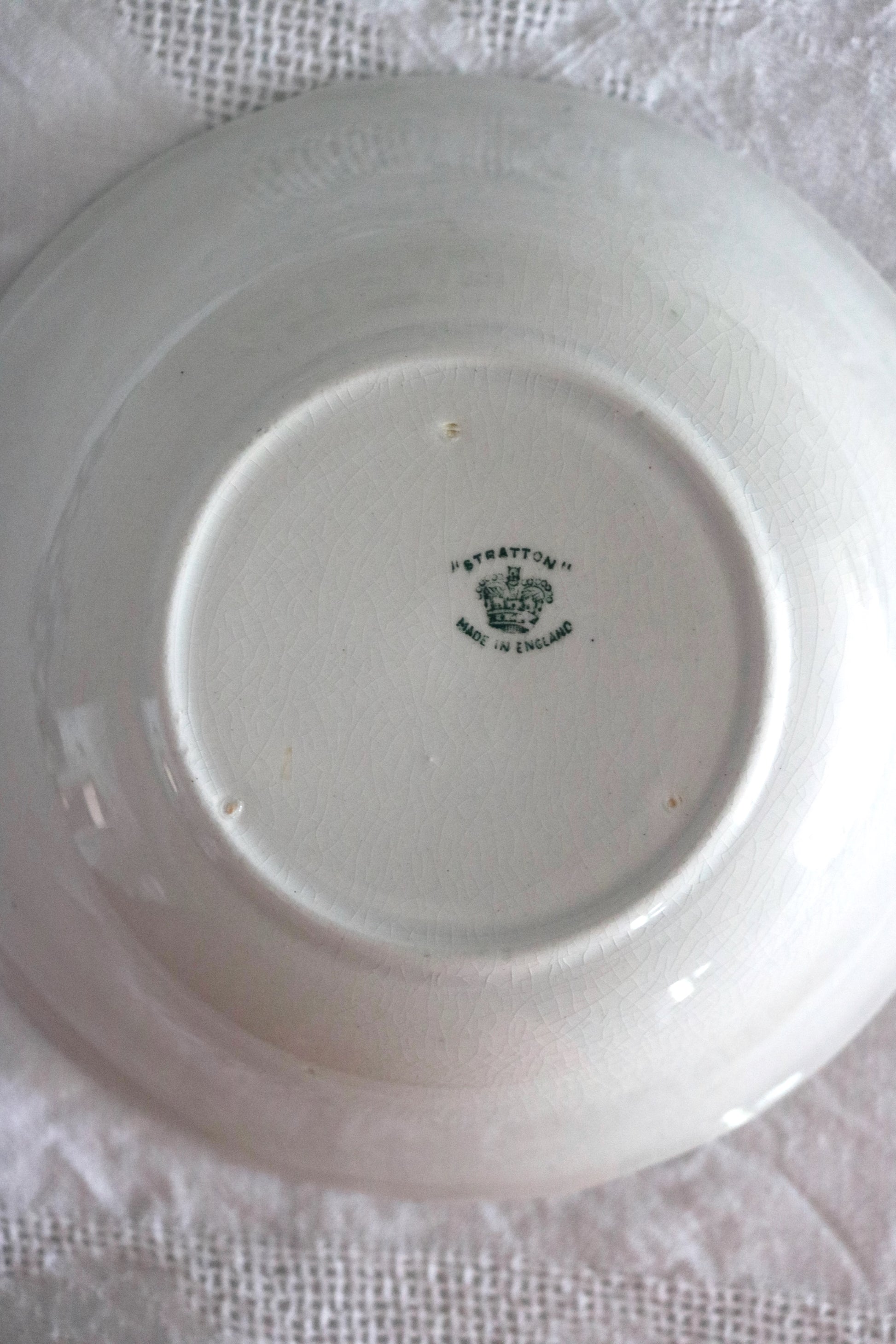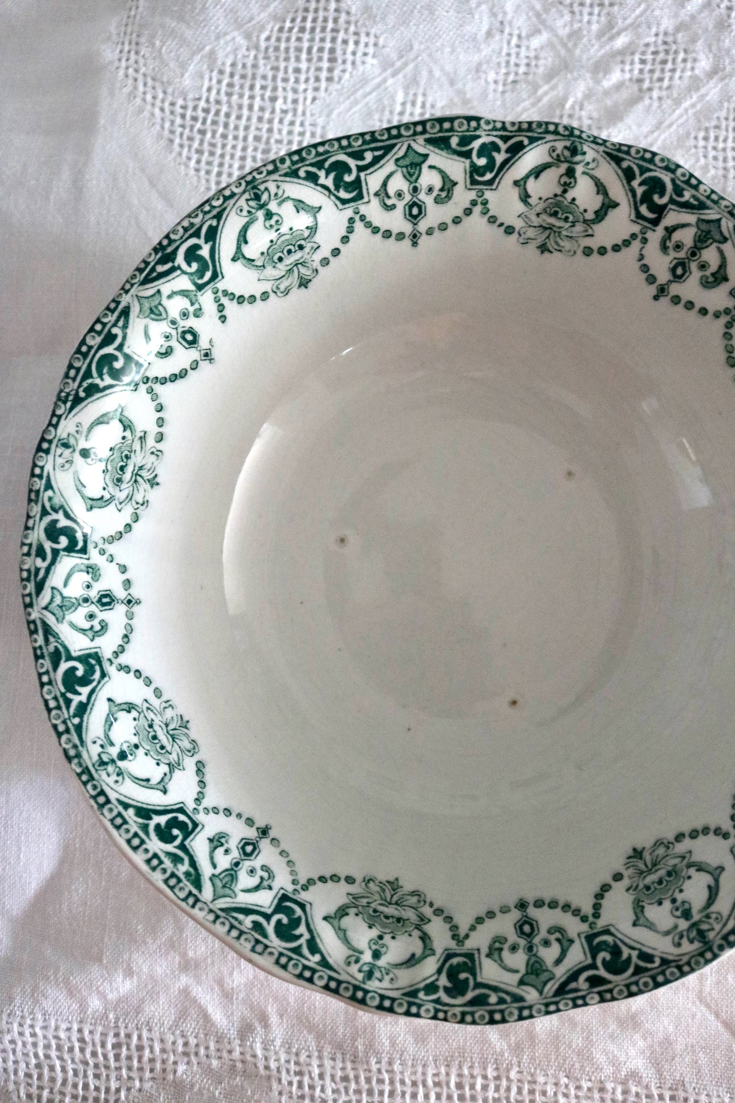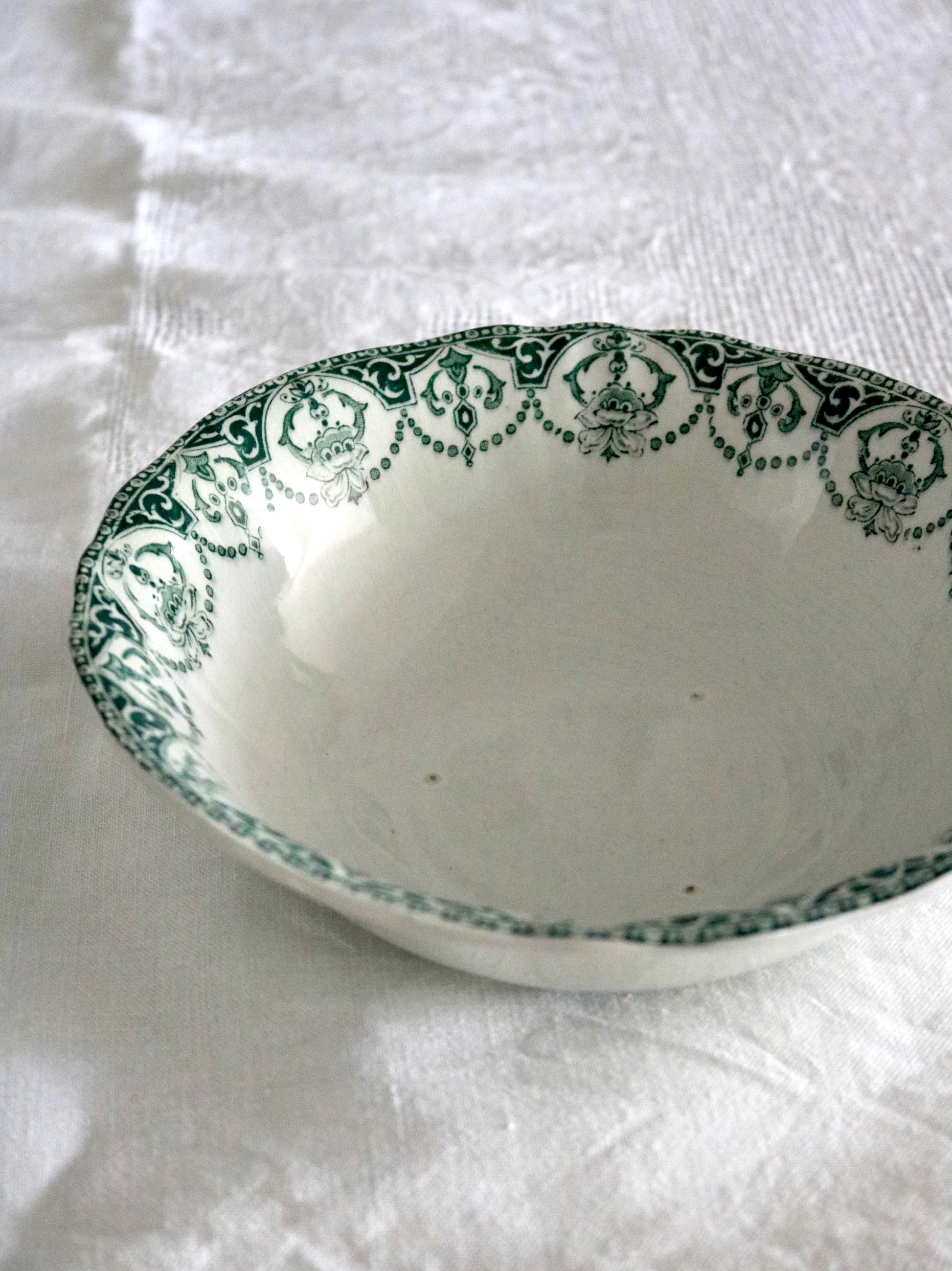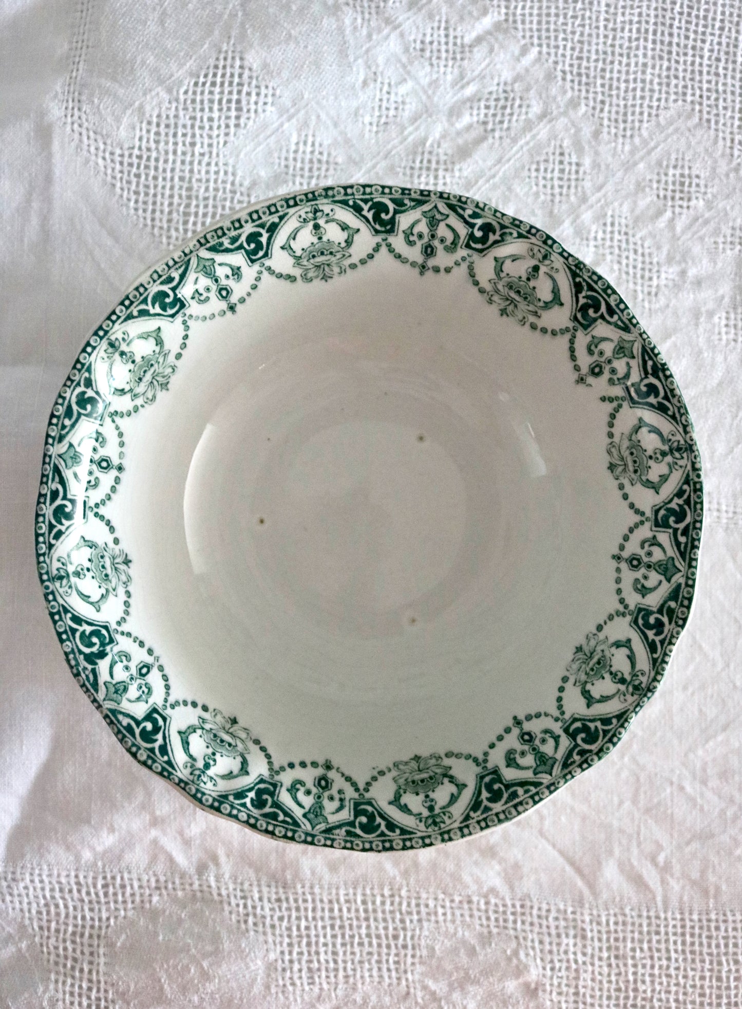 Antique English transferware bowl with a pretty green floral transfer pattern on white. Makes a lovely fruit bowl or display piece.