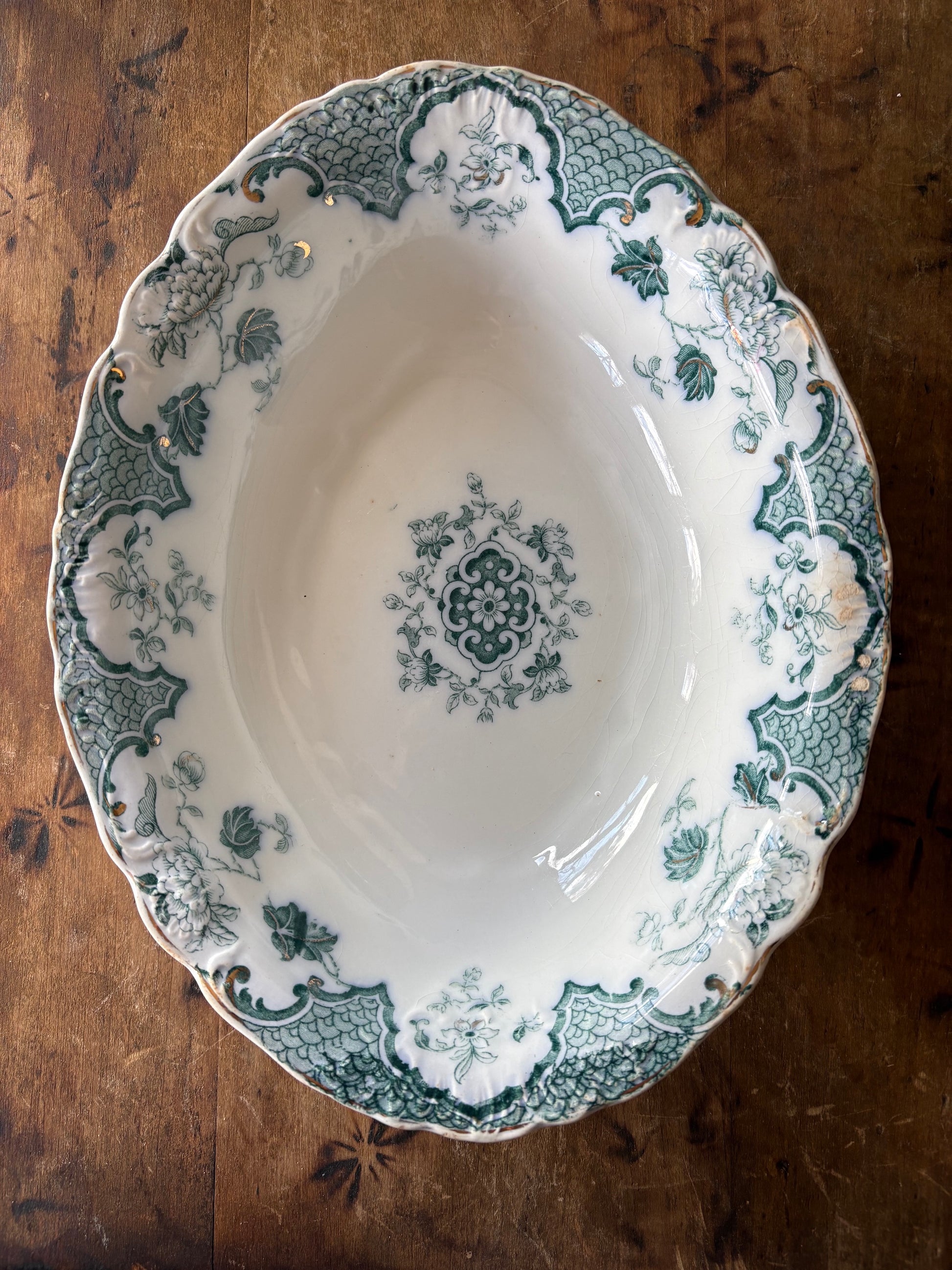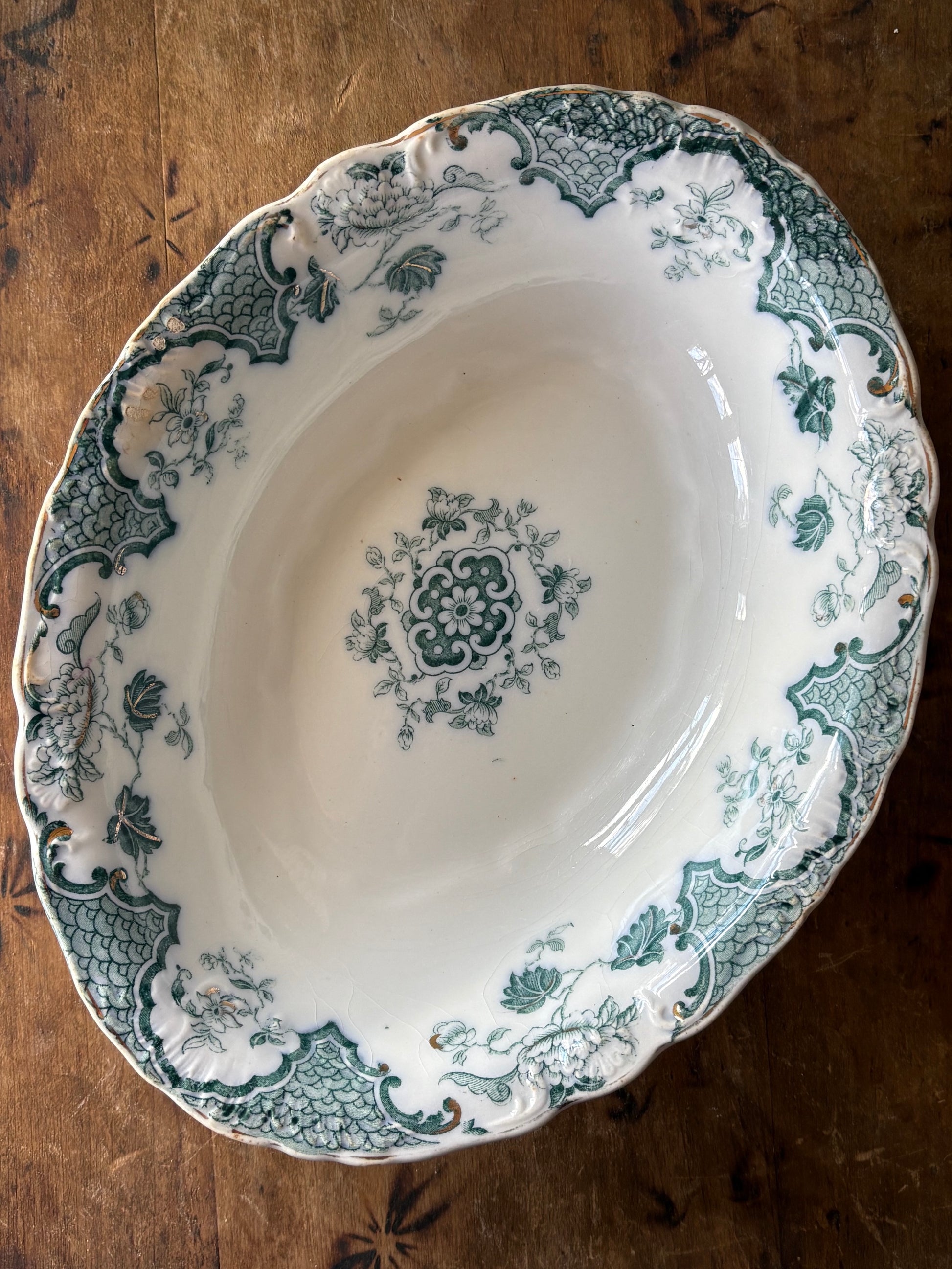 Lovely antique English teal blue transferware dish with a decorative gilded and softly scalloped edge, with pretty floral and scroll designs also displayed on exterior sides of dish.