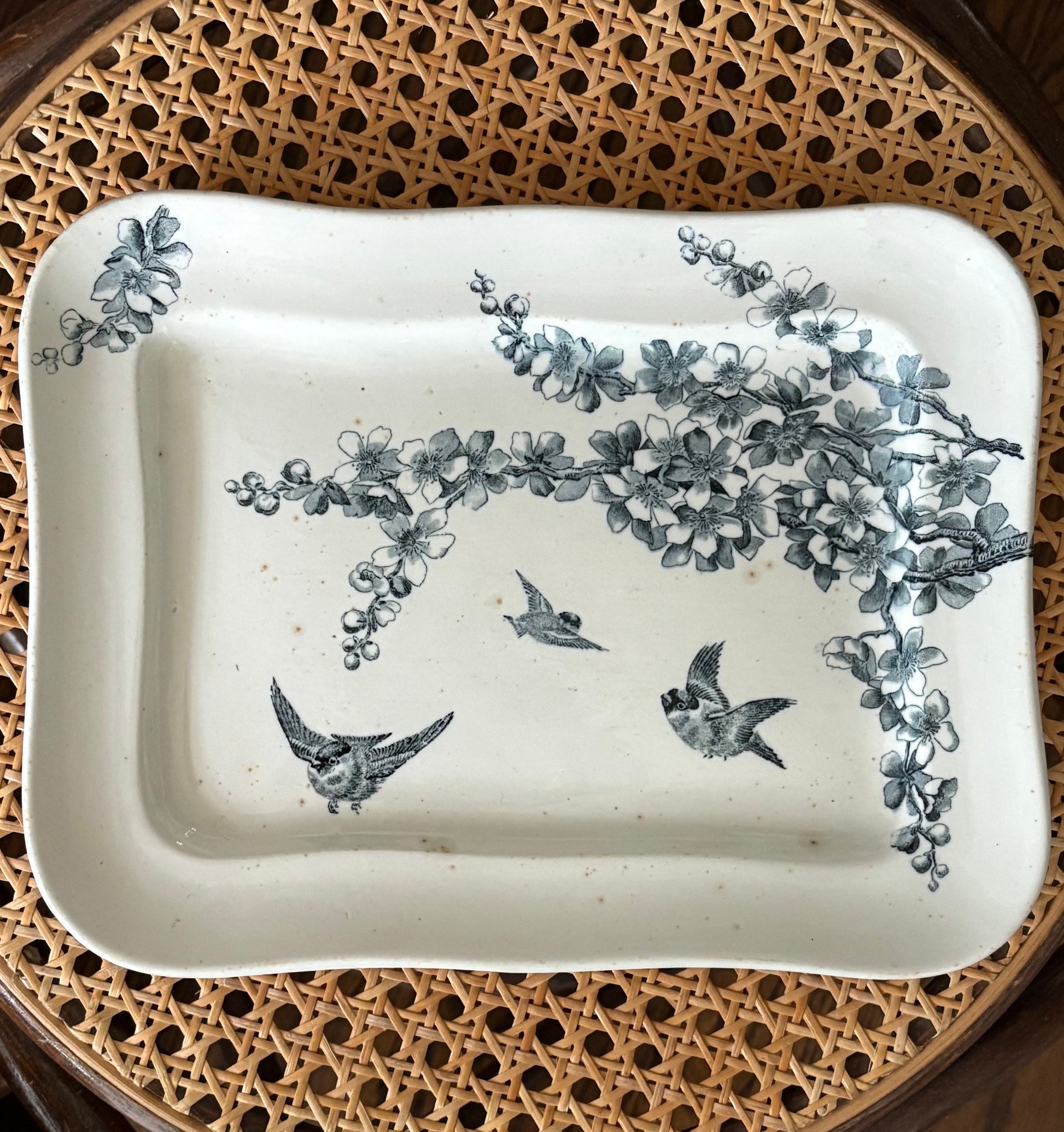 This charming Victorian aesthetic design blue transferware ironstone platter made by George Jones & Sons in Stoke-on-Trent depicts birds amongst flowering branches. The mark dates this piece to the late 19th century. A rare find.
