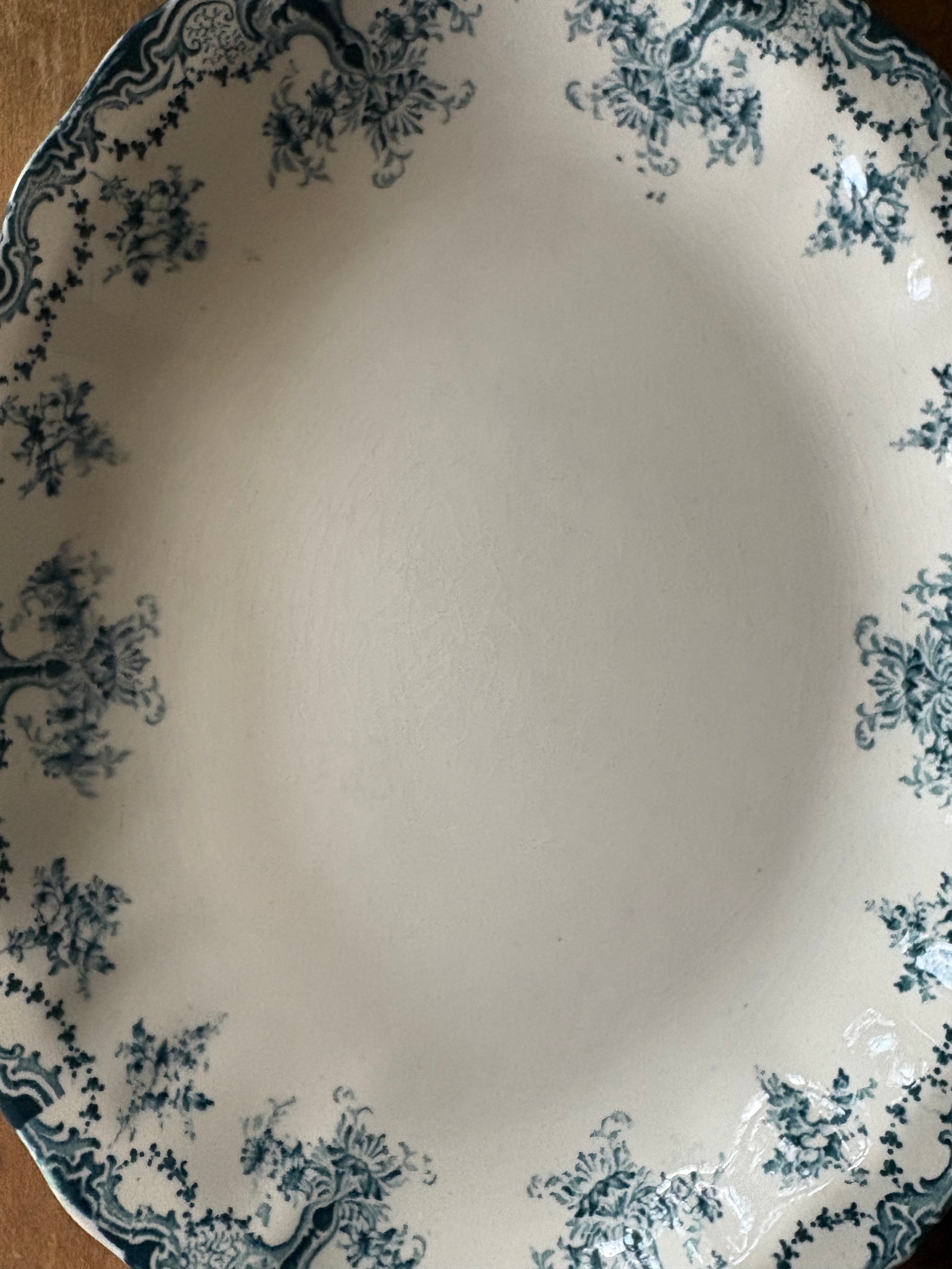 A lovely antique English transferware platter with teal blue floral decoration. A unique oval shape with gently scalloped edge. Made by Upper Hanley Pottery CO. in Stoke-on-Trent England in the Alliance pattern. Perfect for your holiday table or as wall decoration. Dates to 1894-1900.