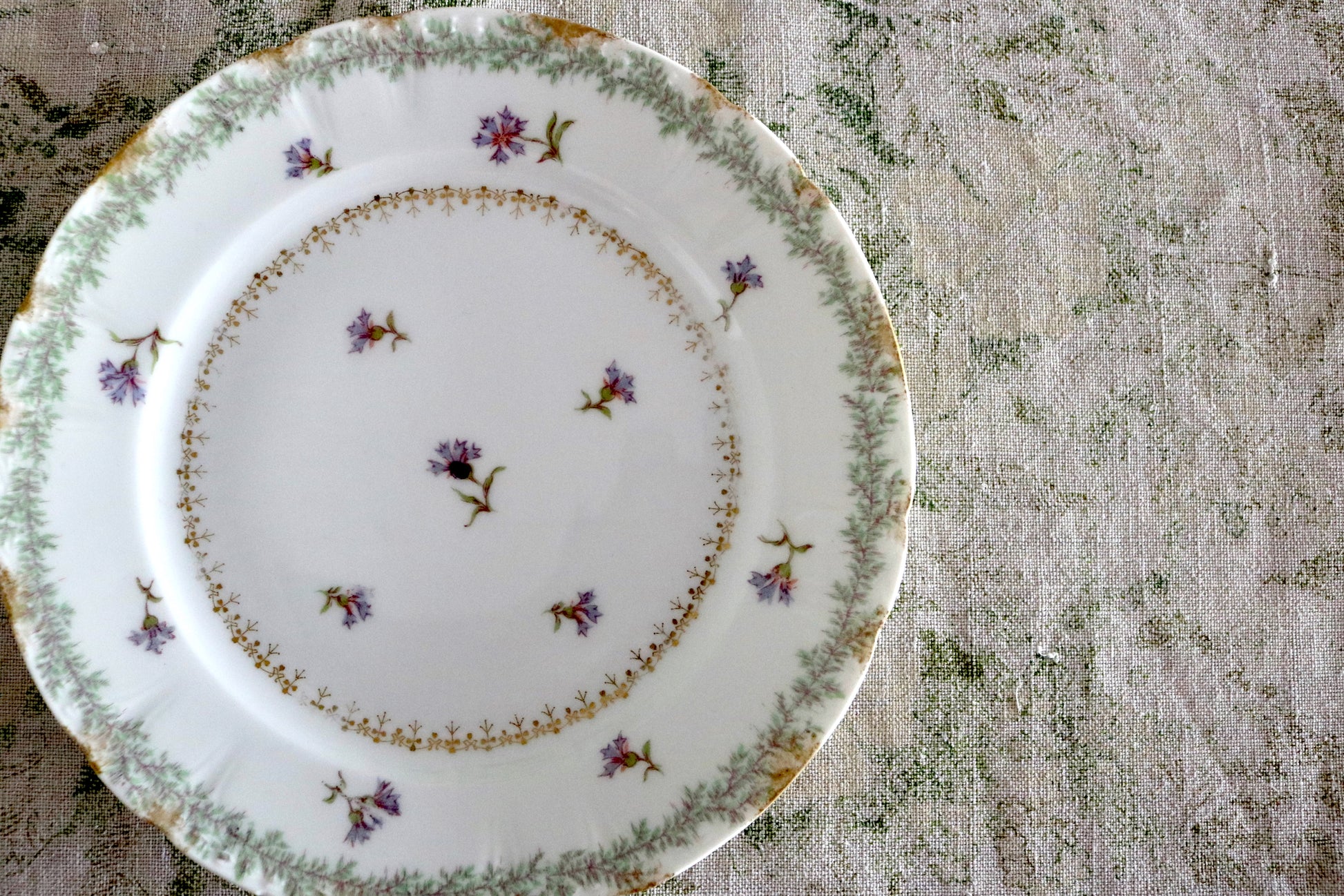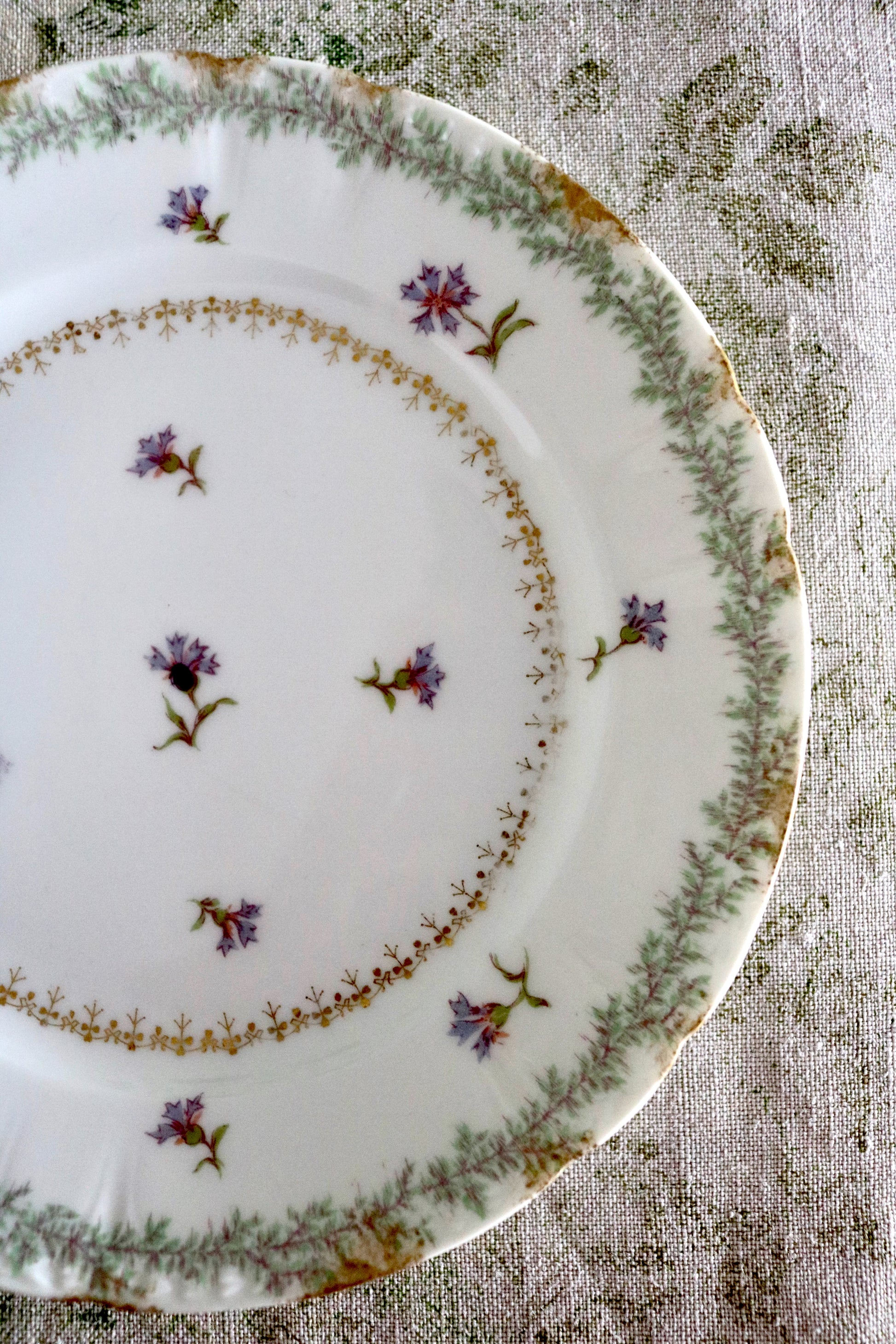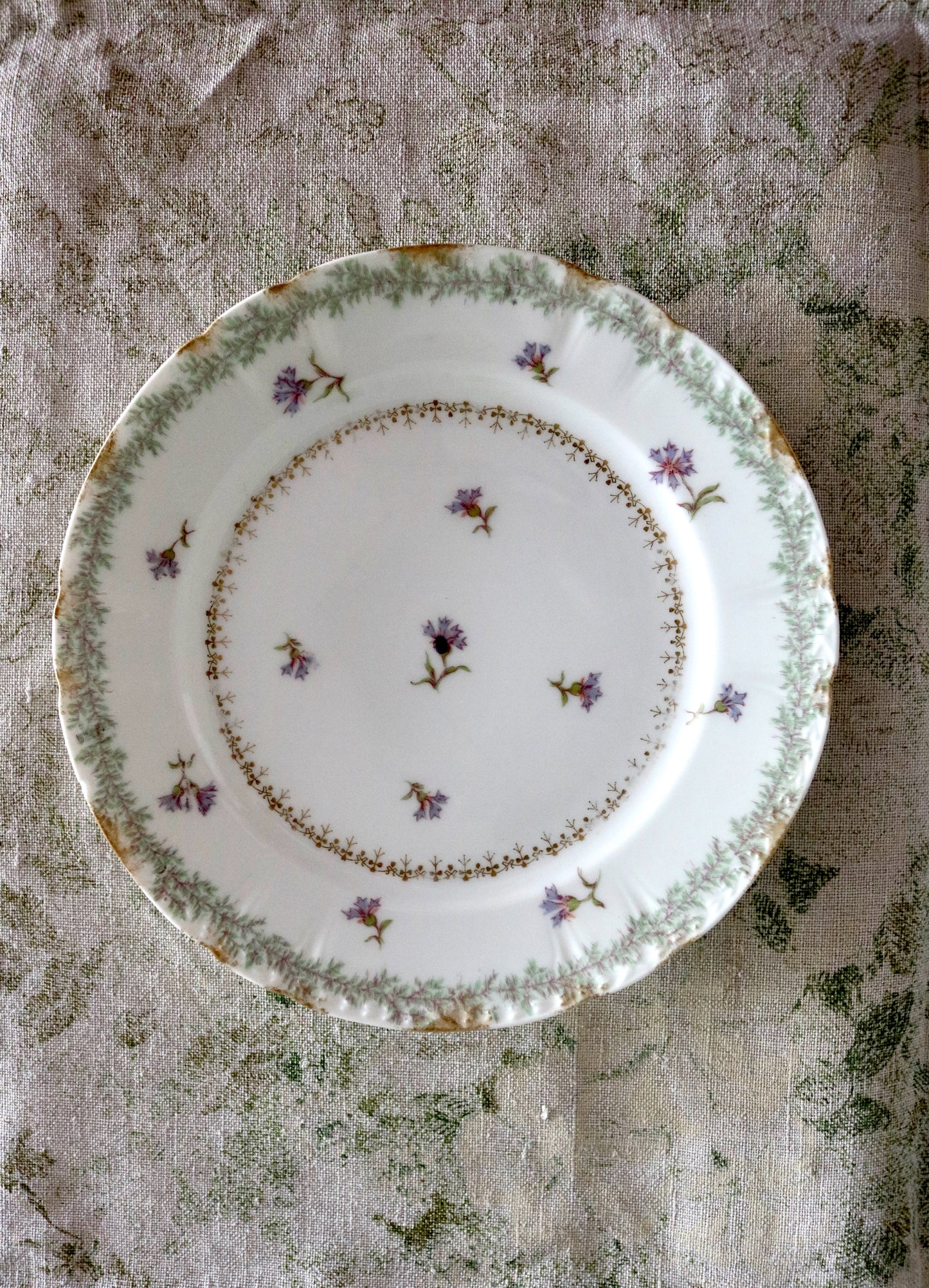 A lovely antique Limoges plate with a pretty lavender colour ditzy floral pattern, possibly cornflowers, on a white background with gold details on interior rim and edge.