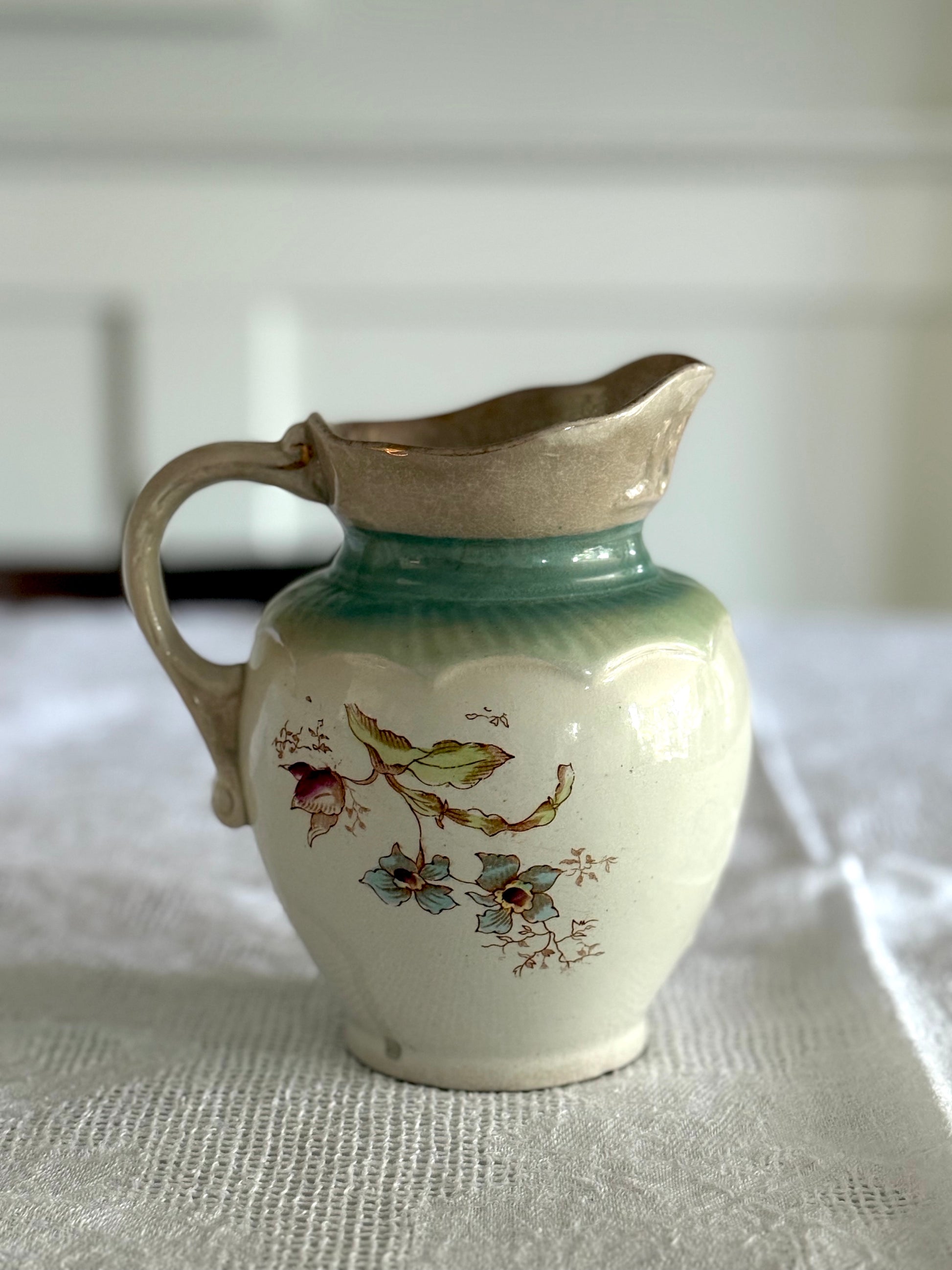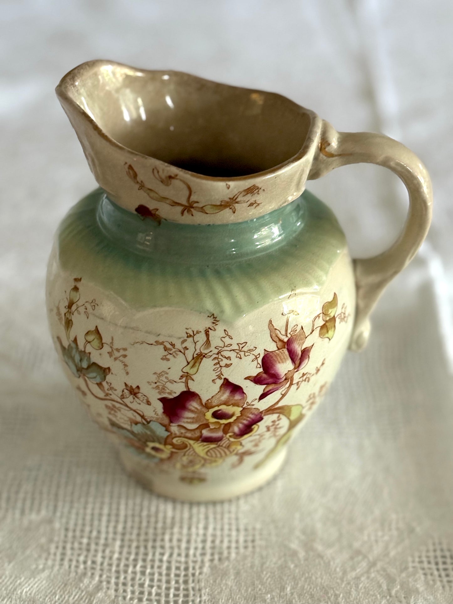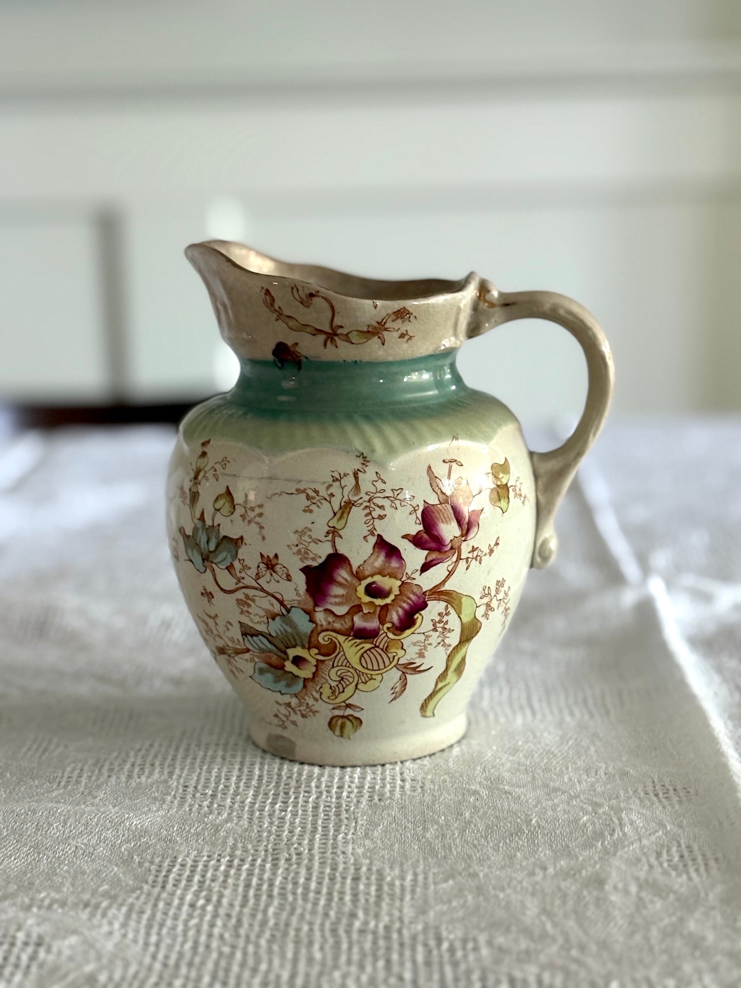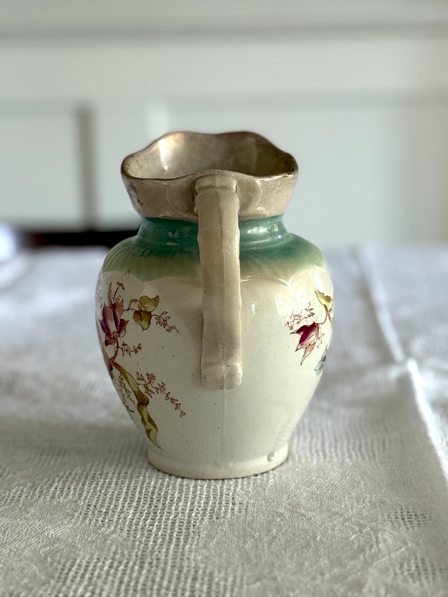 This pretty antique jug has beautiful transferware flowers in a lovely soft palette of robins egg blue, green, plum and light brown with yellow highlights on white with gilded details. Perfect for your summer blooms.