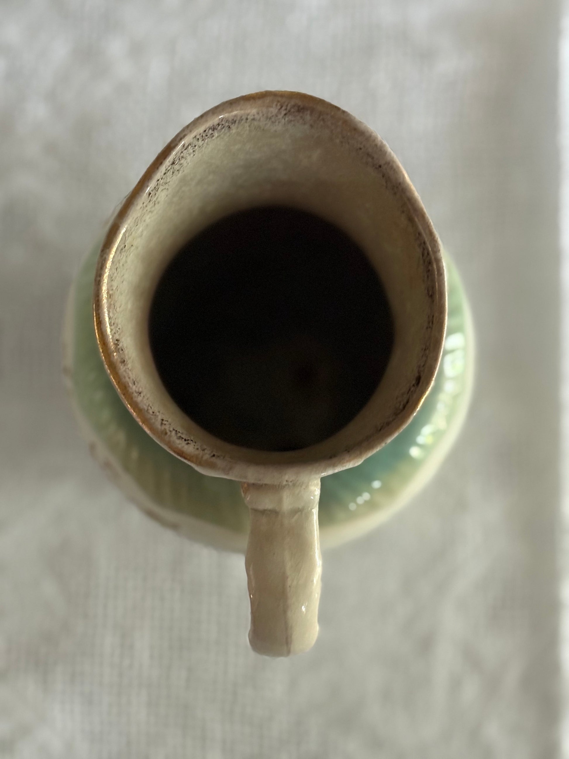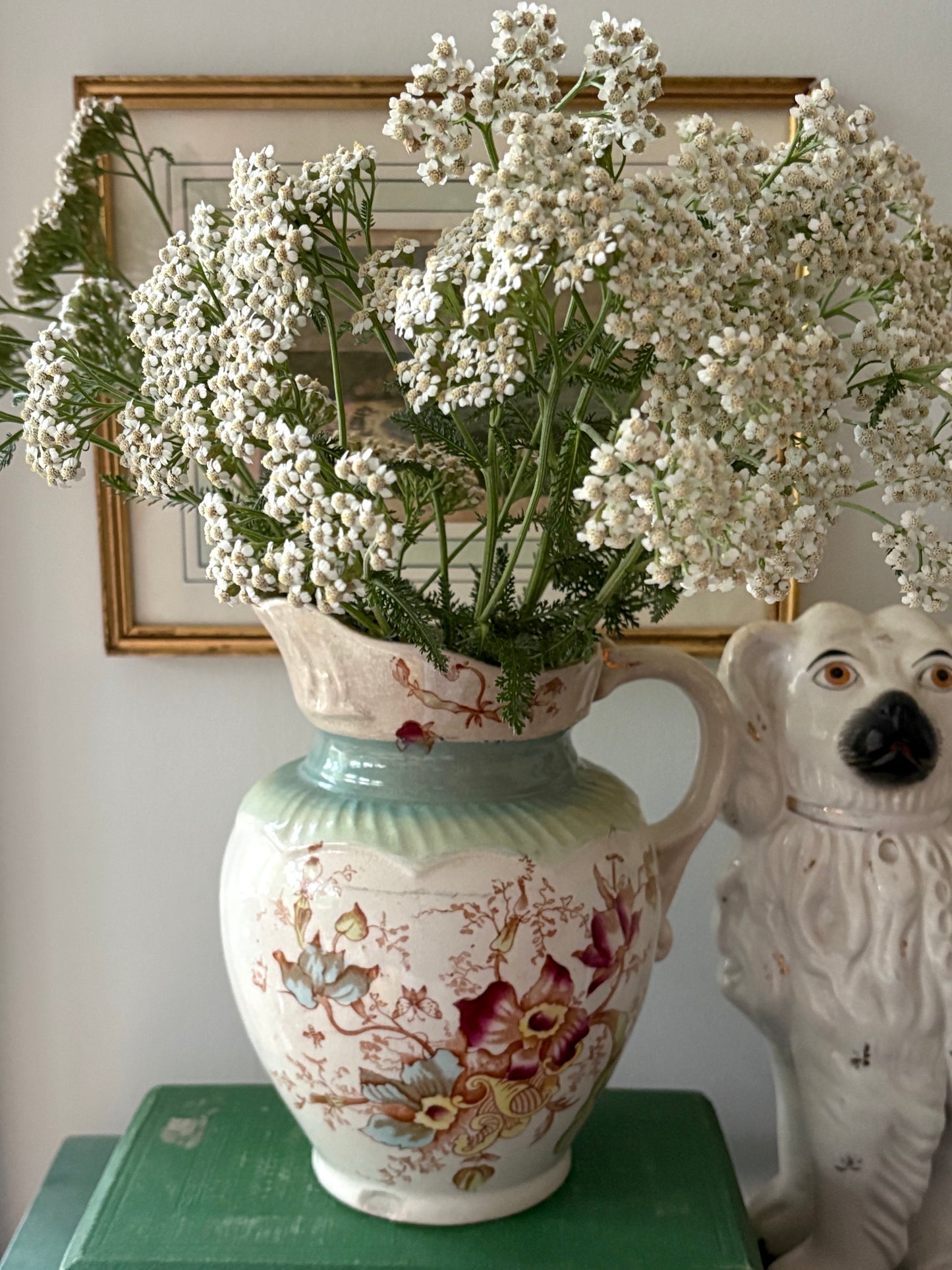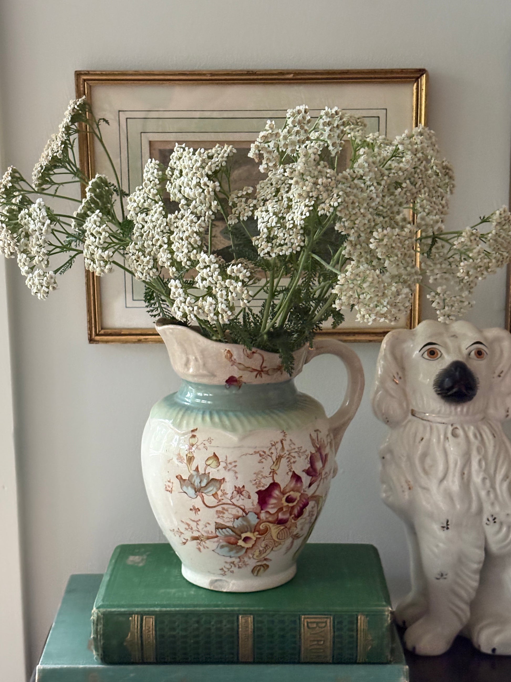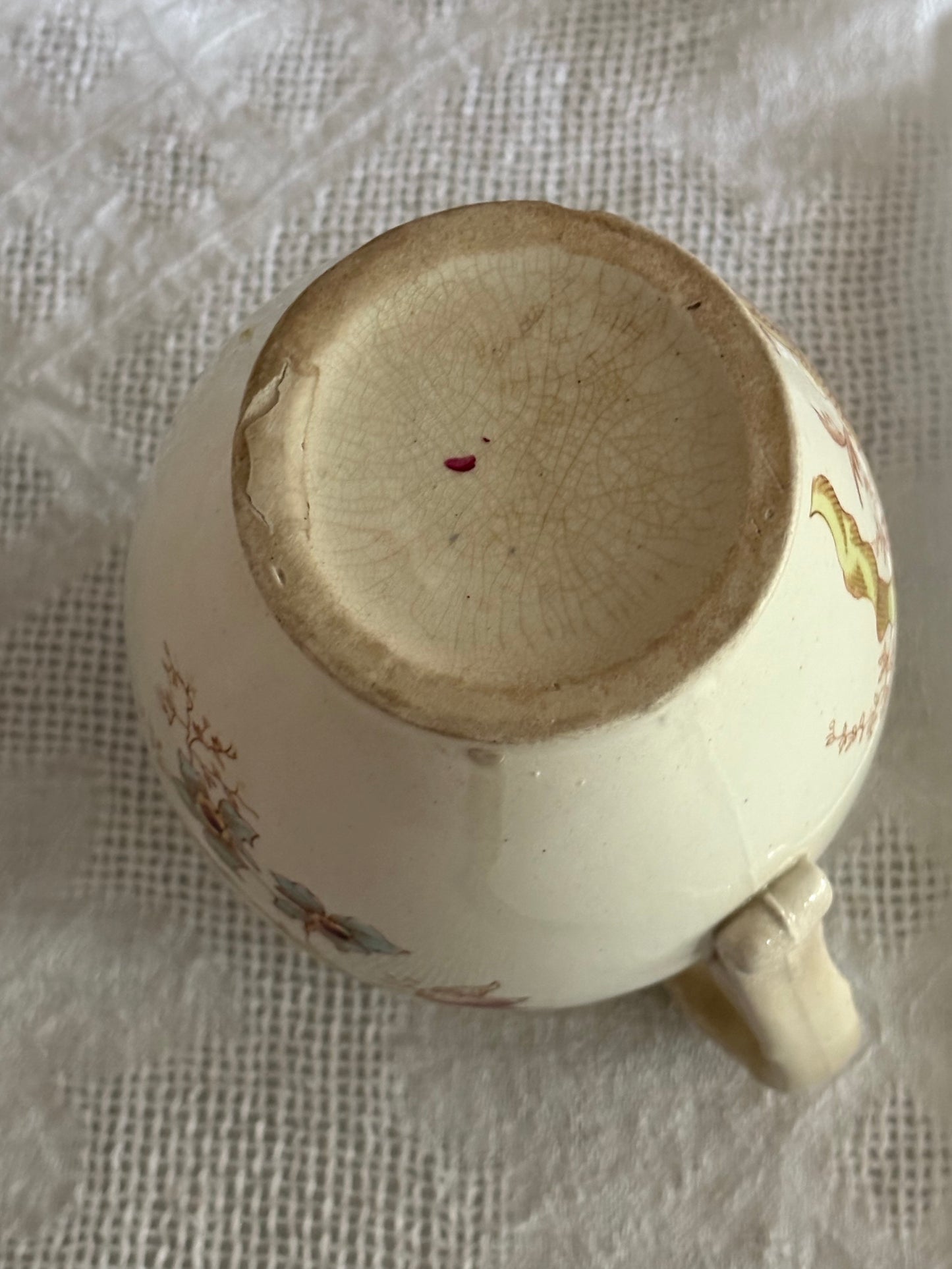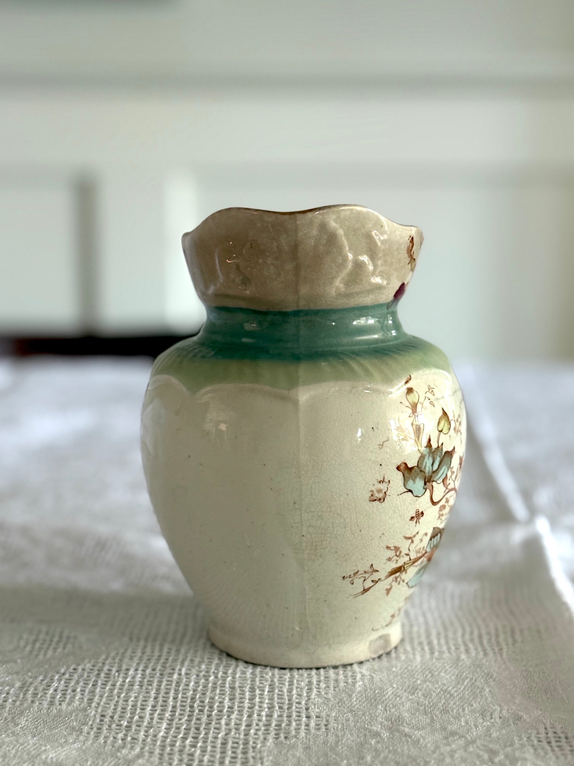 This pretty antique jug has beautiful transferware flowers in a lovely soft palette of robins egg blue, green, plum and light brown with yellow highlights on white with gilded details. Perfect for your summer blooms.