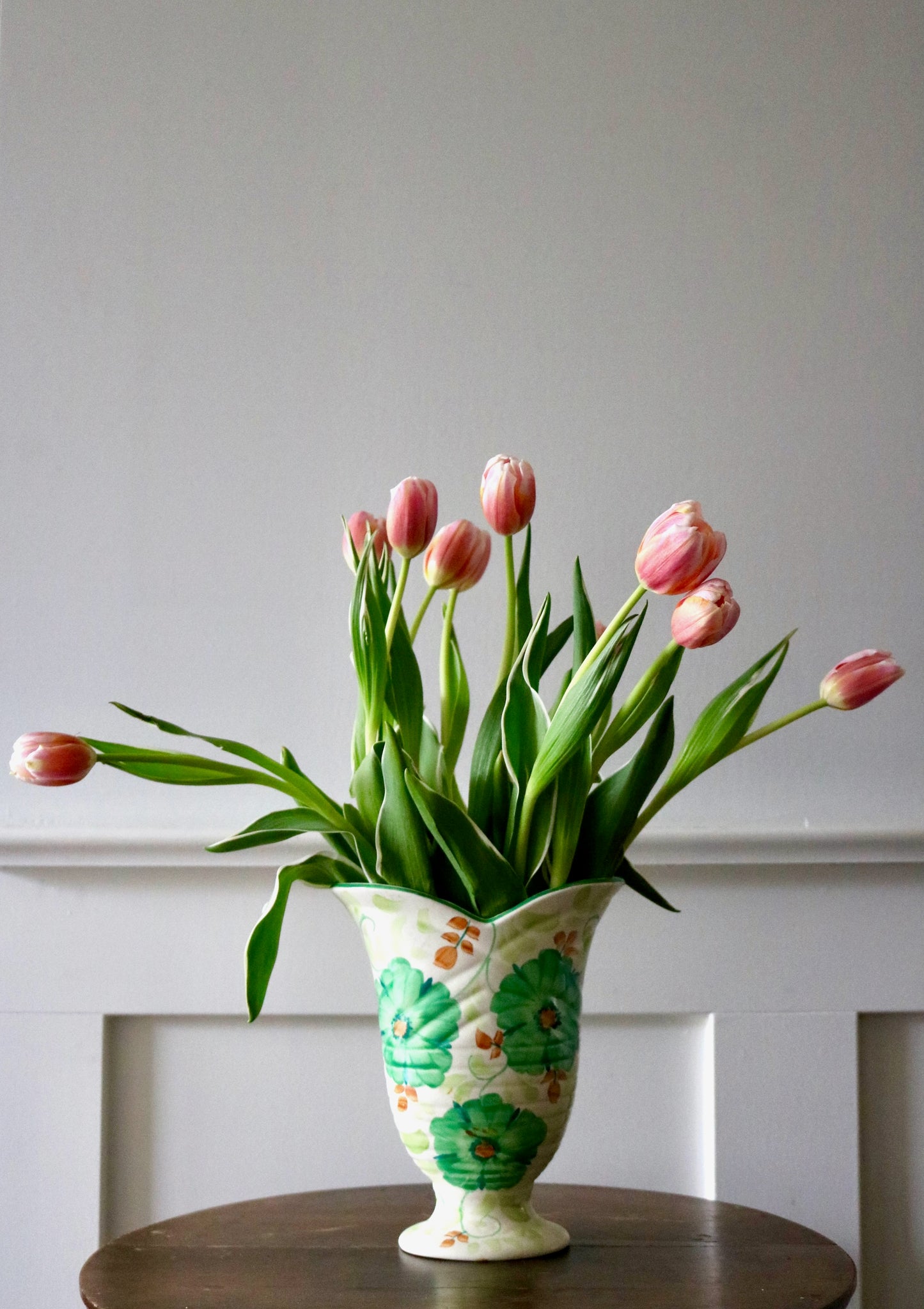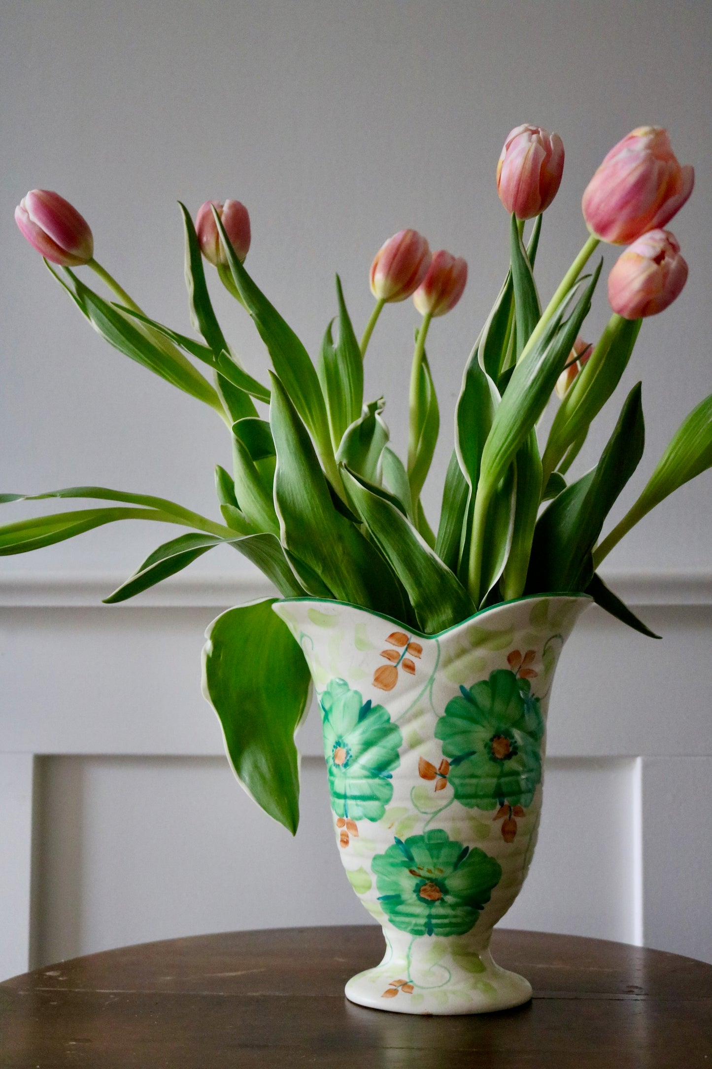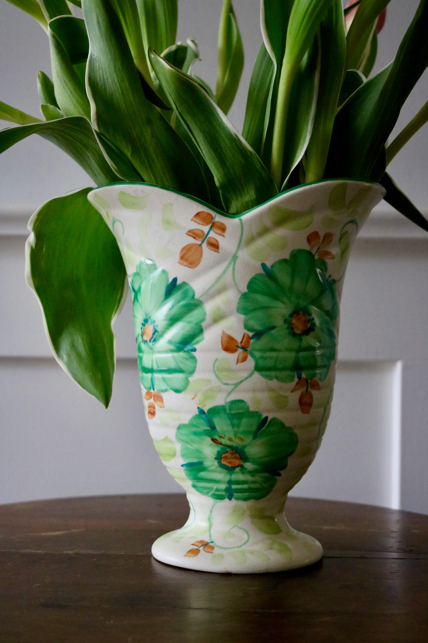 Pretty floral Beswick footed vase perfect for cut blooms. Lovely shape and hand painted green flowers with peach and lighter green leaf details on an ivory background. Likely art deco era with a fabulous Bloomsbury-esque feel. A unique find!