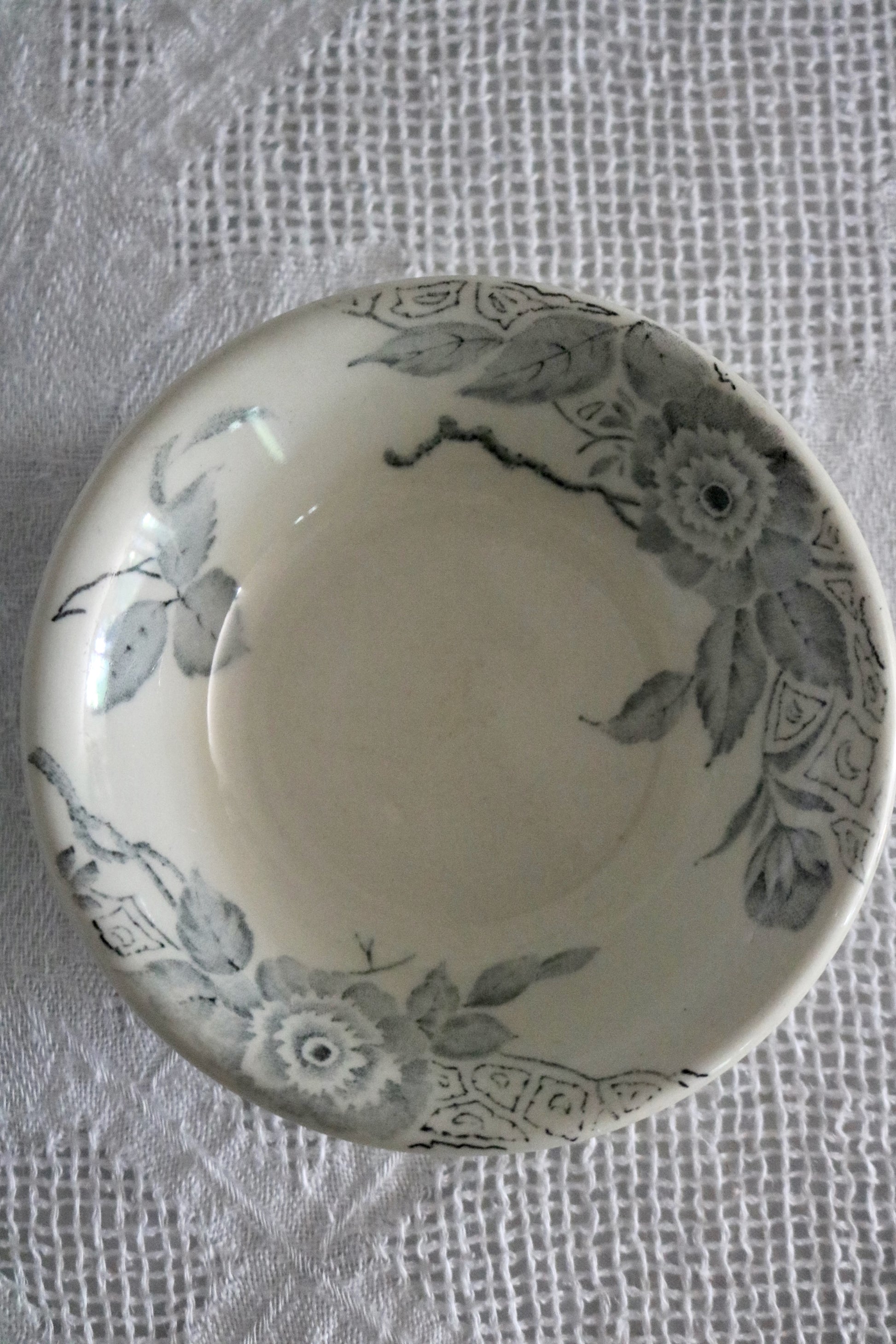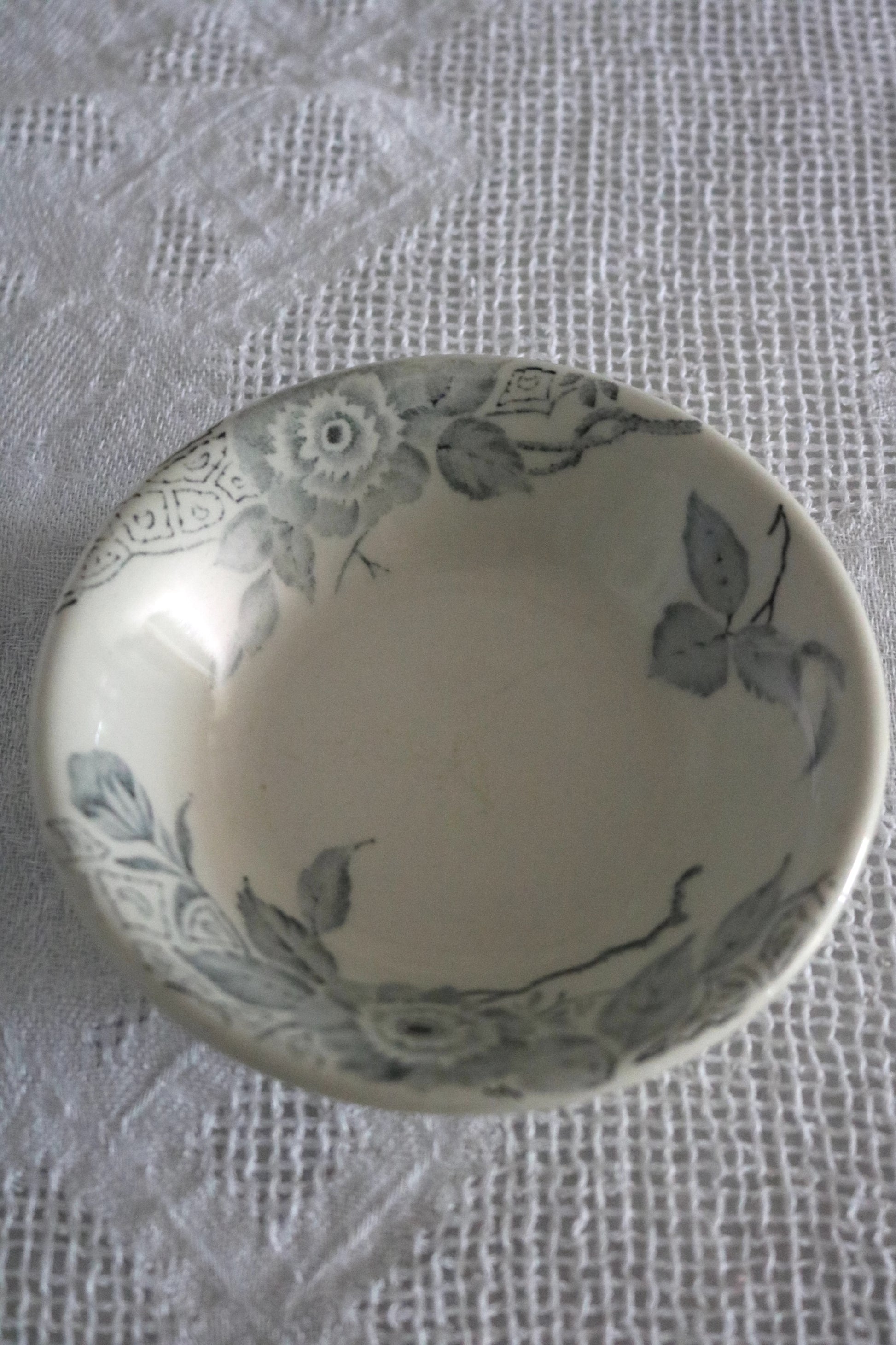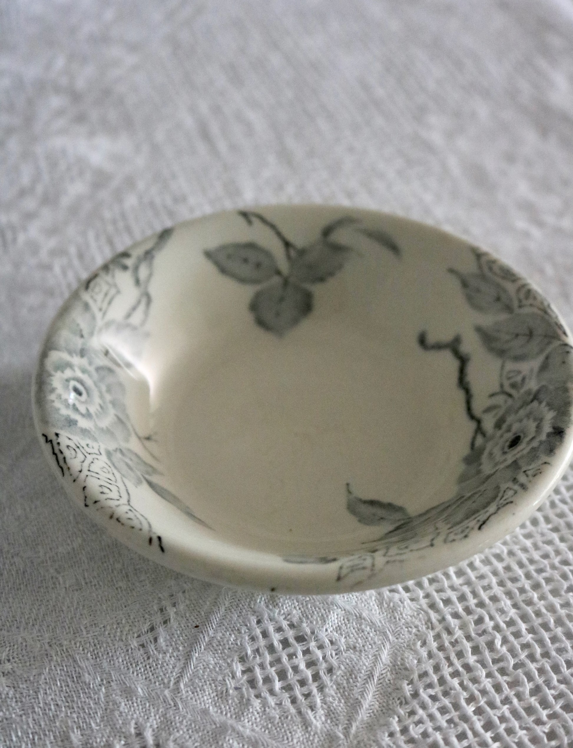 Here is a pretty pale inky blue/grey floral transferware bowl. Perfect for having pinch of salt at hand, serving pickles, nuts ++