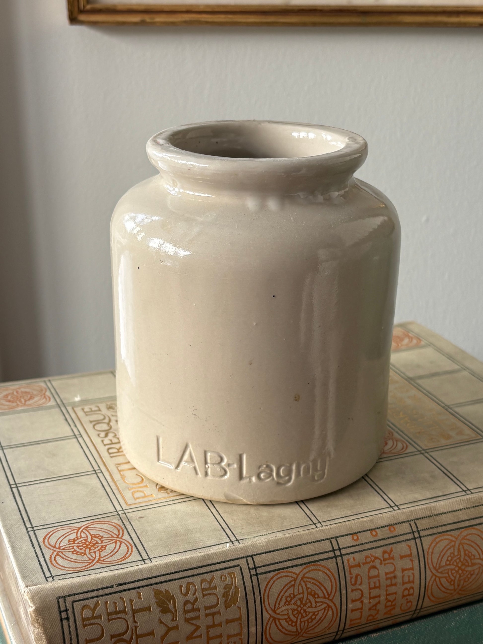 A charming French stoneware mustard crock in a lovely oatmeal glaze brings character to your countertop, Made by LAB Lagny pottery . Known as a "Moutarde de Meaux Pommery Crock” they can be beautifully lined up on a shelf or countertop and are equally versatile for holding cutlery, brushes and flowers.