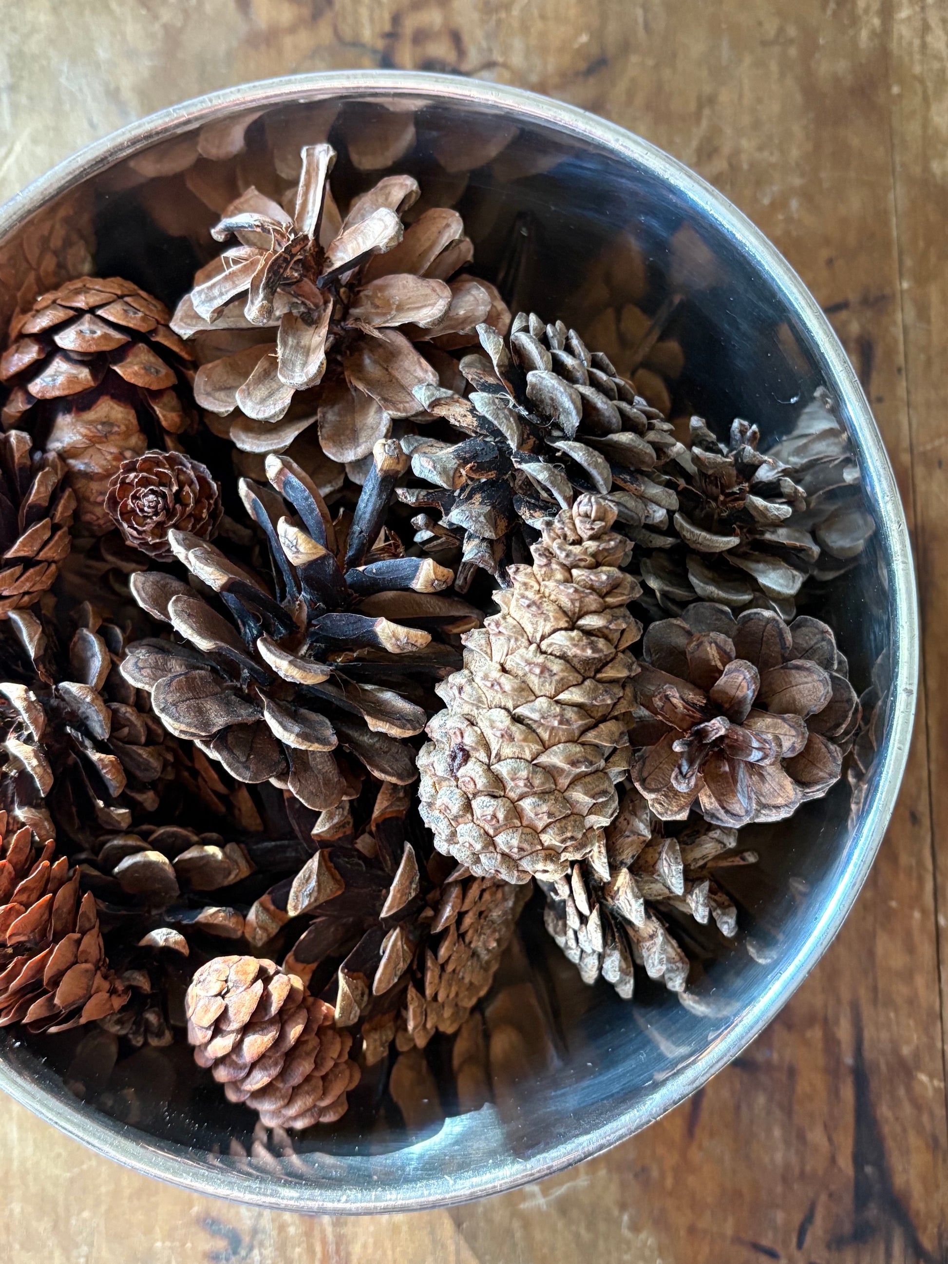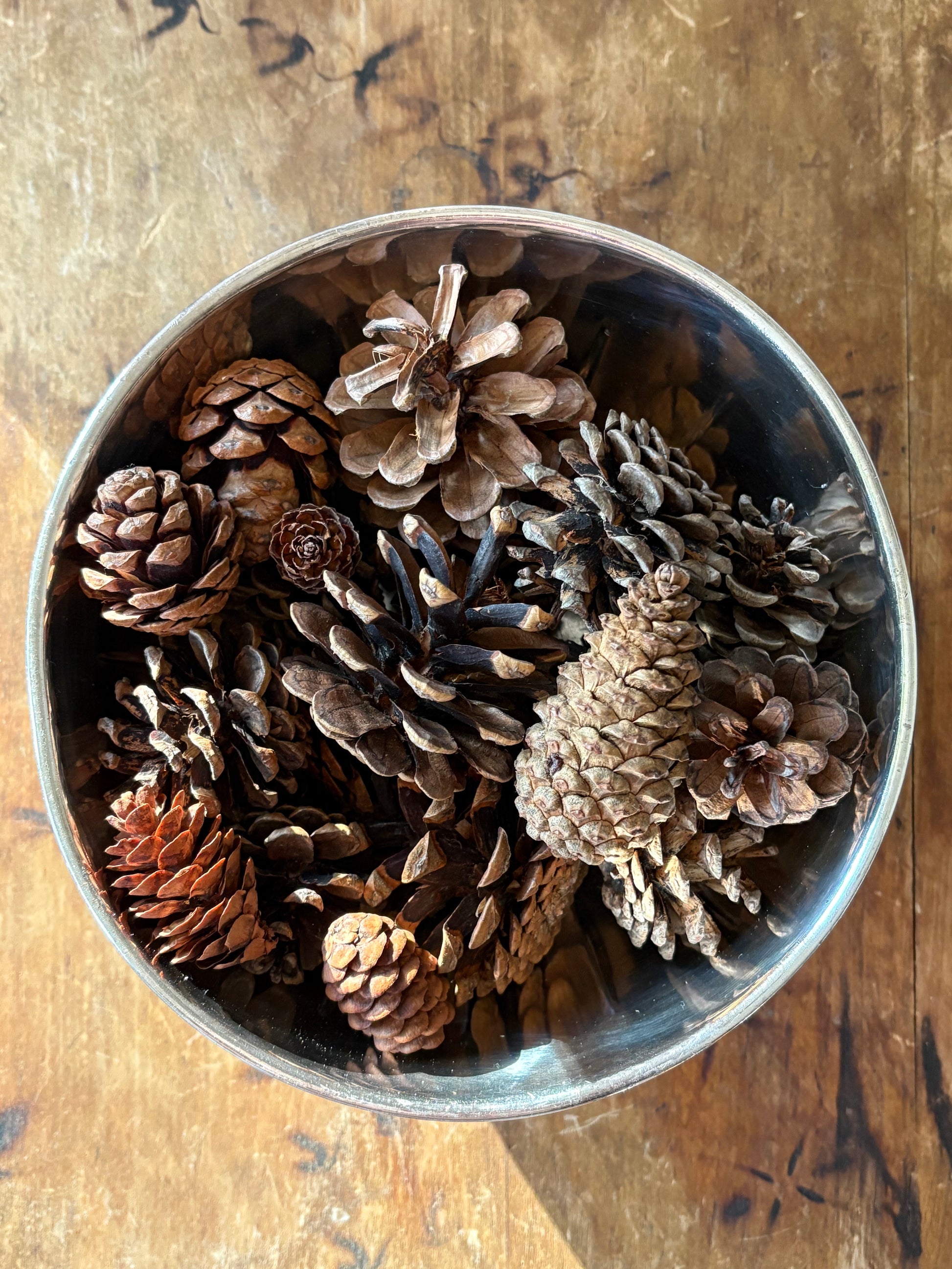 A lovely vintage round silver-plate footed bowl. Fill with holiday ornaments, pinecones or clementines.