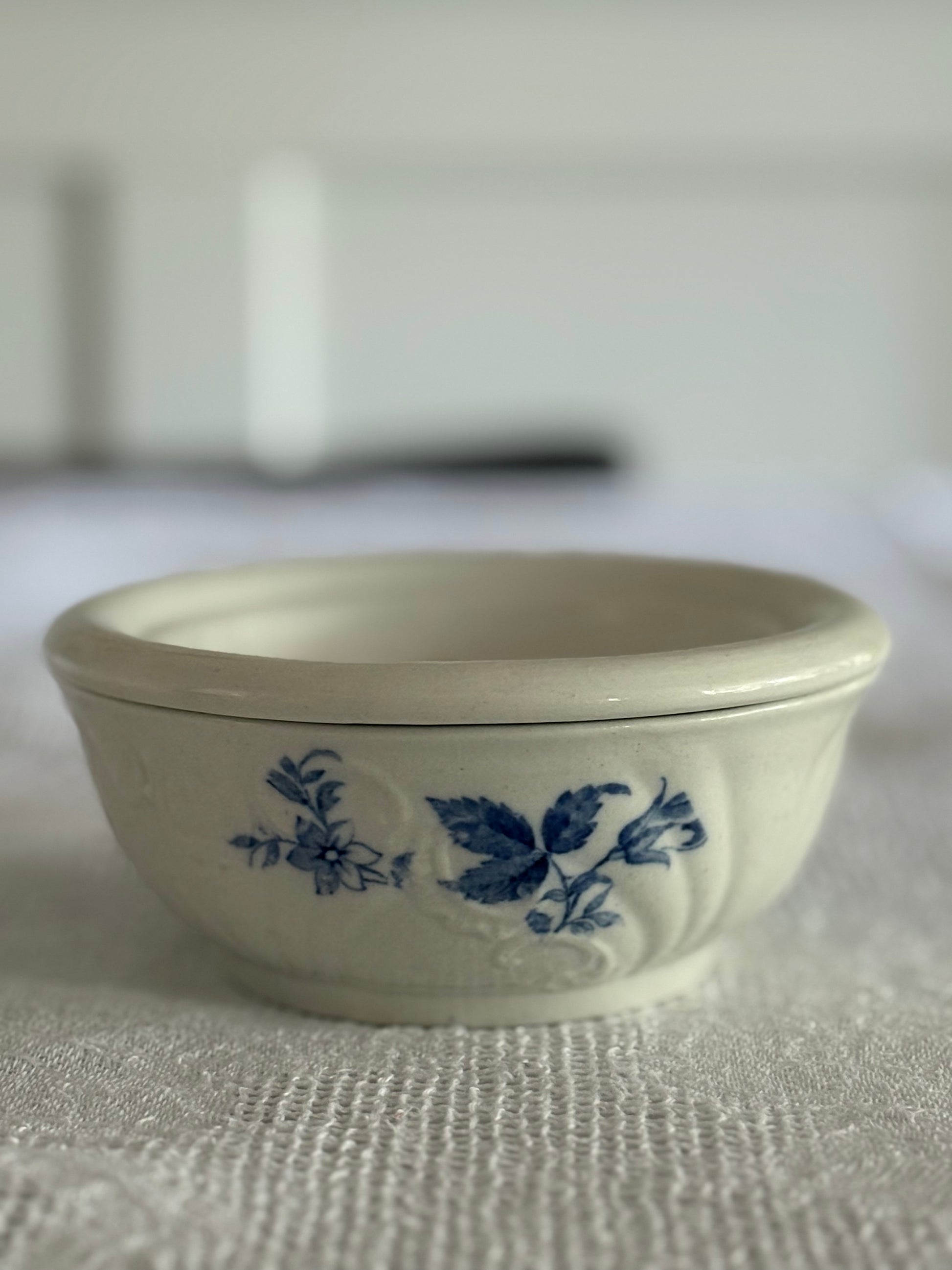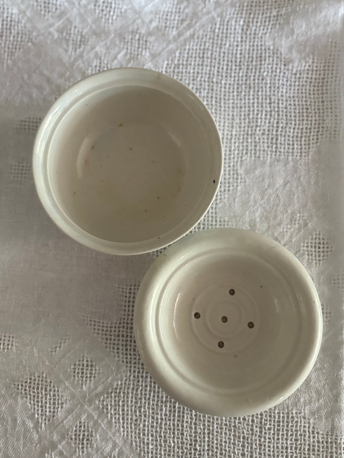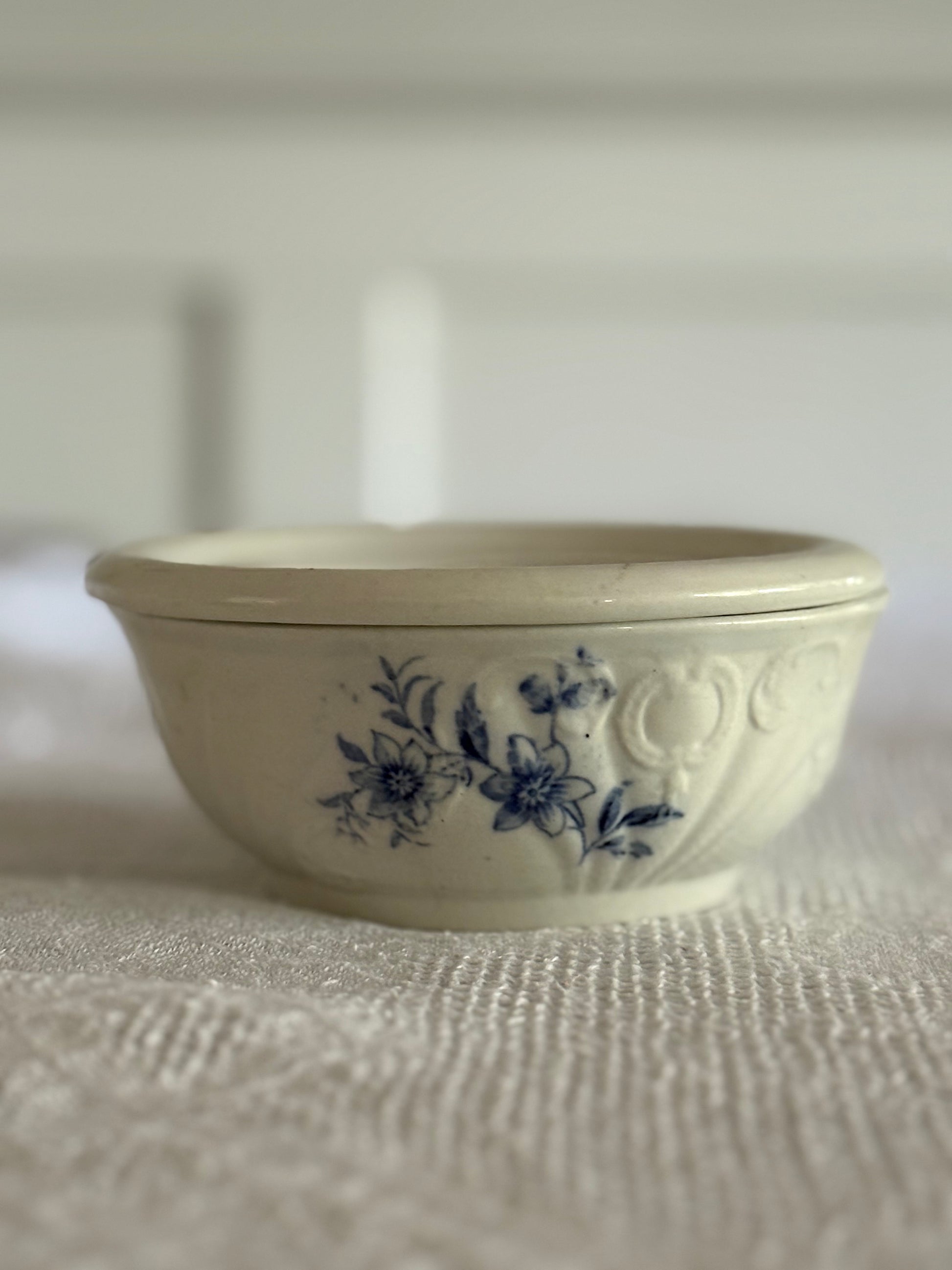 A charming antique English two-piece soap dish with pretty blue floral transfer pattern.
