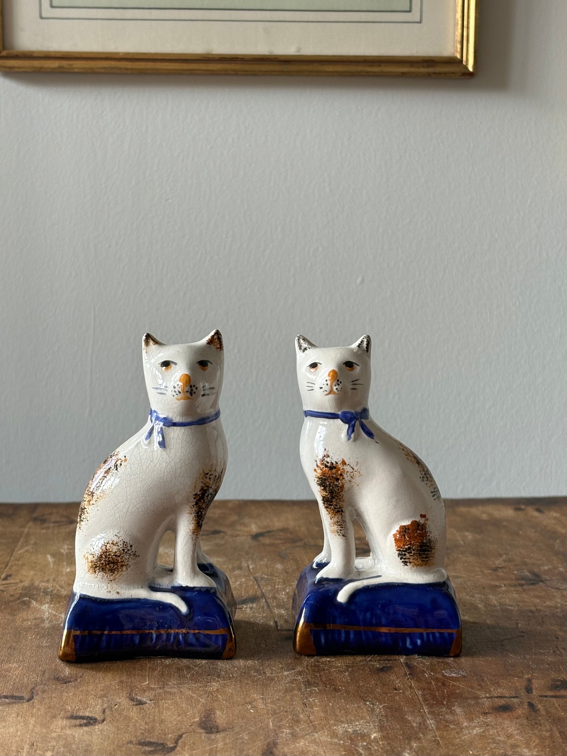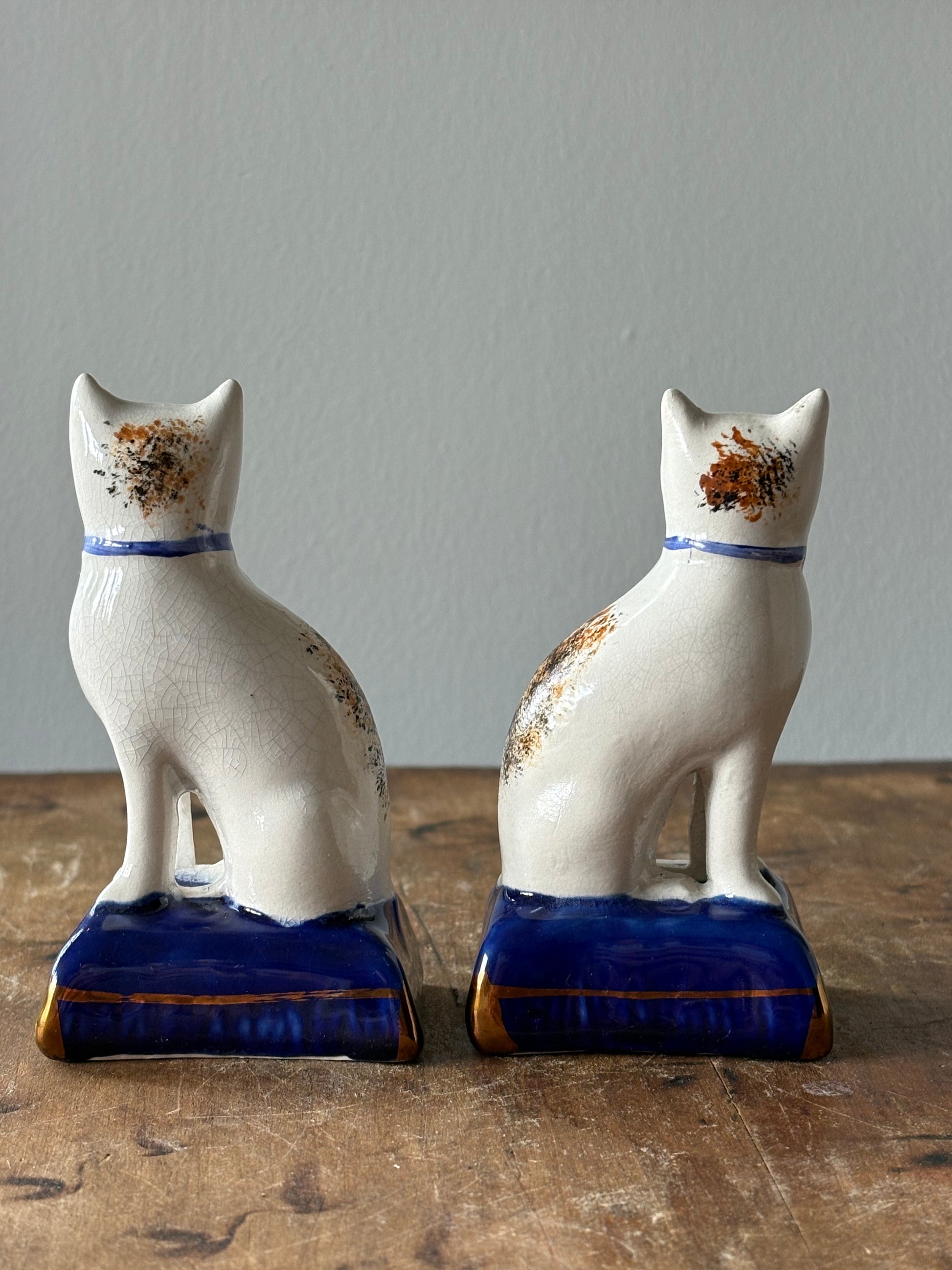 A charming pair of small vintage Staffordshire cats (right and left facing) on rich cobalt blue cushions with gold gilt highlights. Hand painted faces with sponged calico markings in brown, orange/ochre and black with gold accents, and wearing sweet blue bow tied collars.