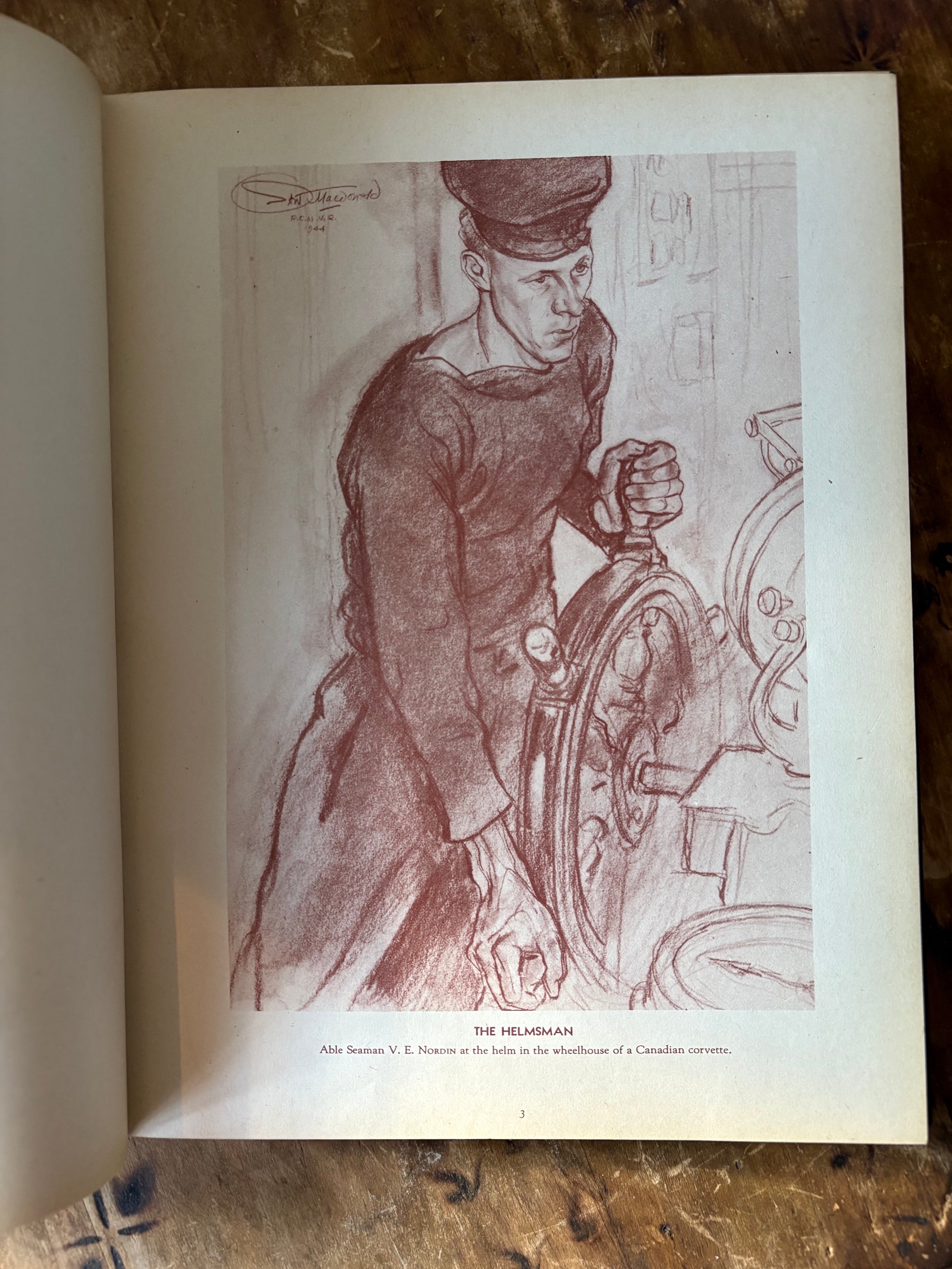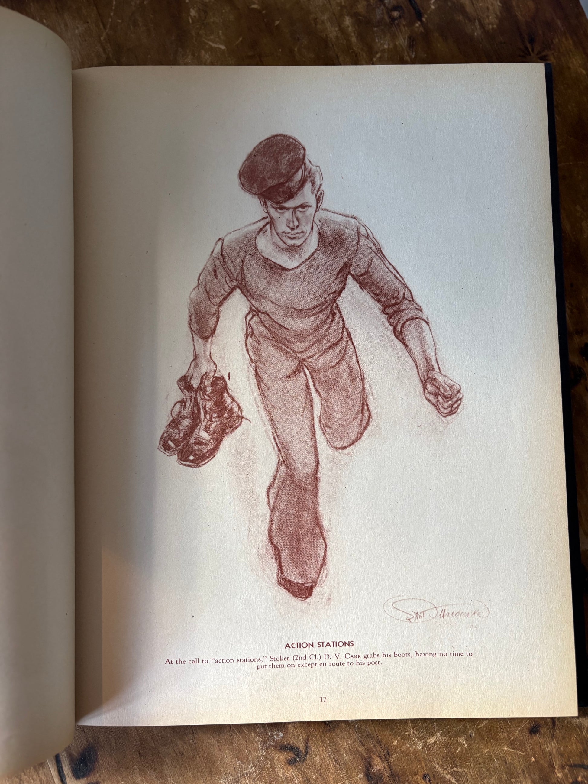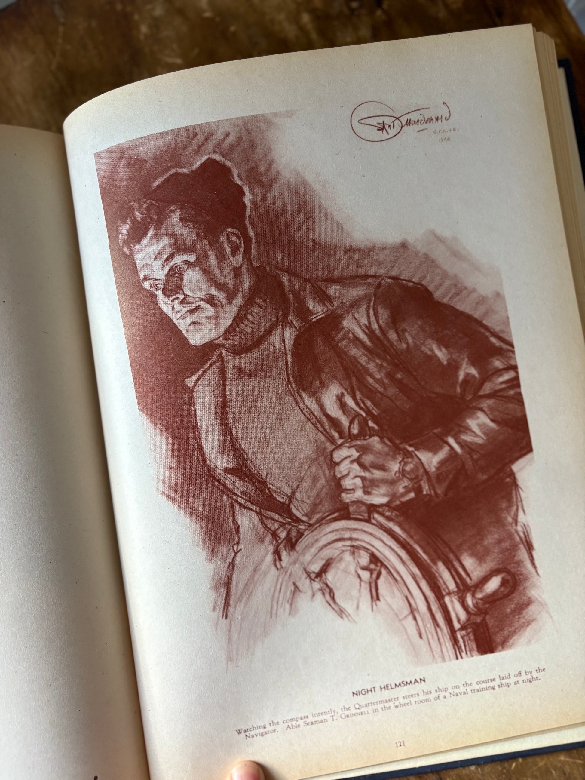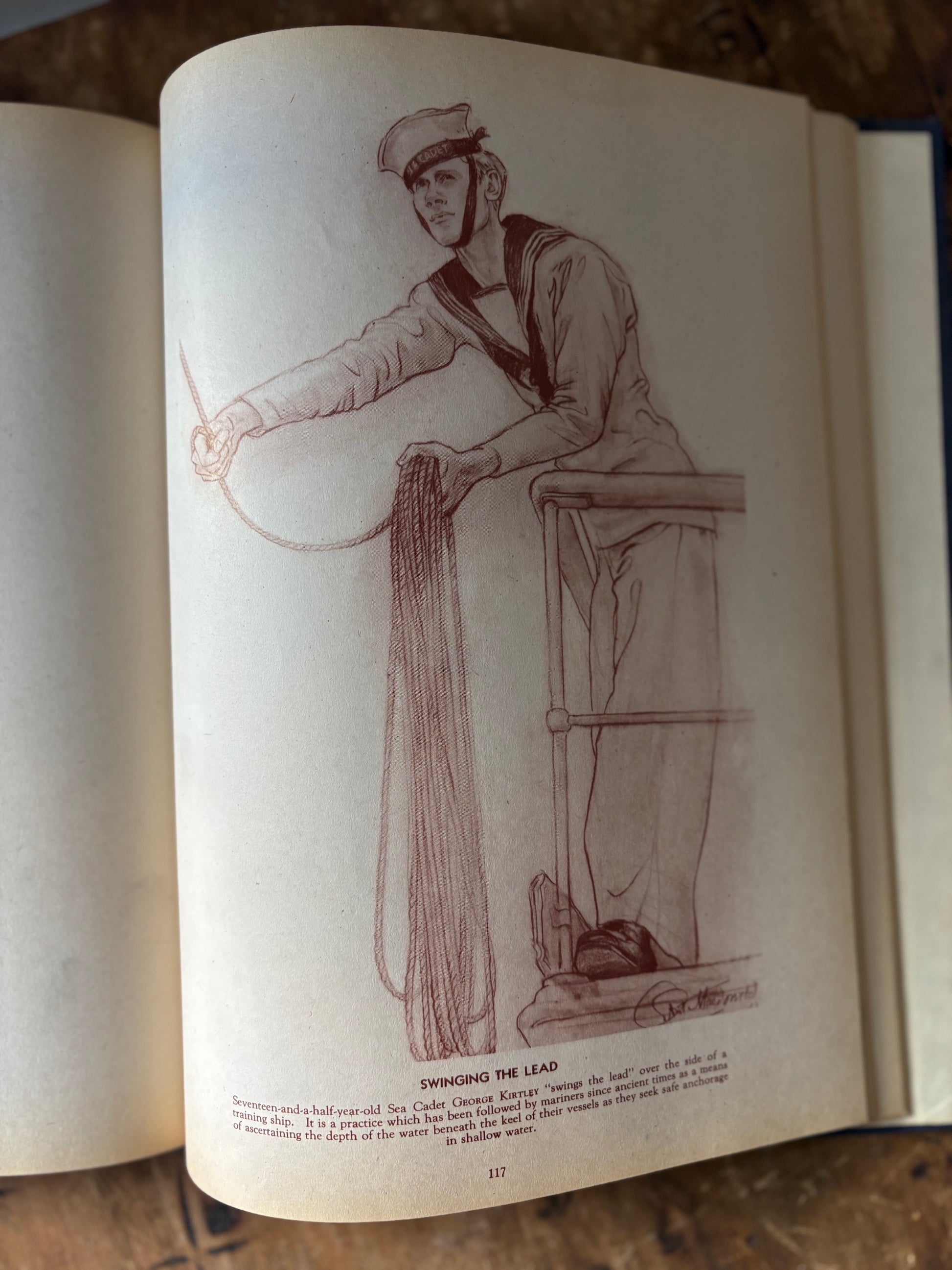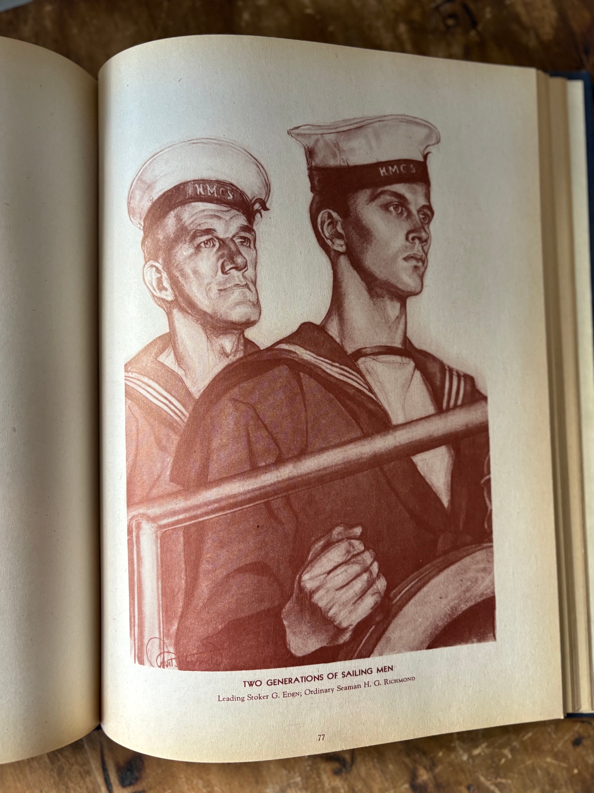 A unique vintage hardcover book filled with captivating illustrations of Canadian Navy Sailors. A mix of portrait and action, sepia toned illustrations. Blue hardcover with gold print. These illustrations would be fabulous framed as art.
