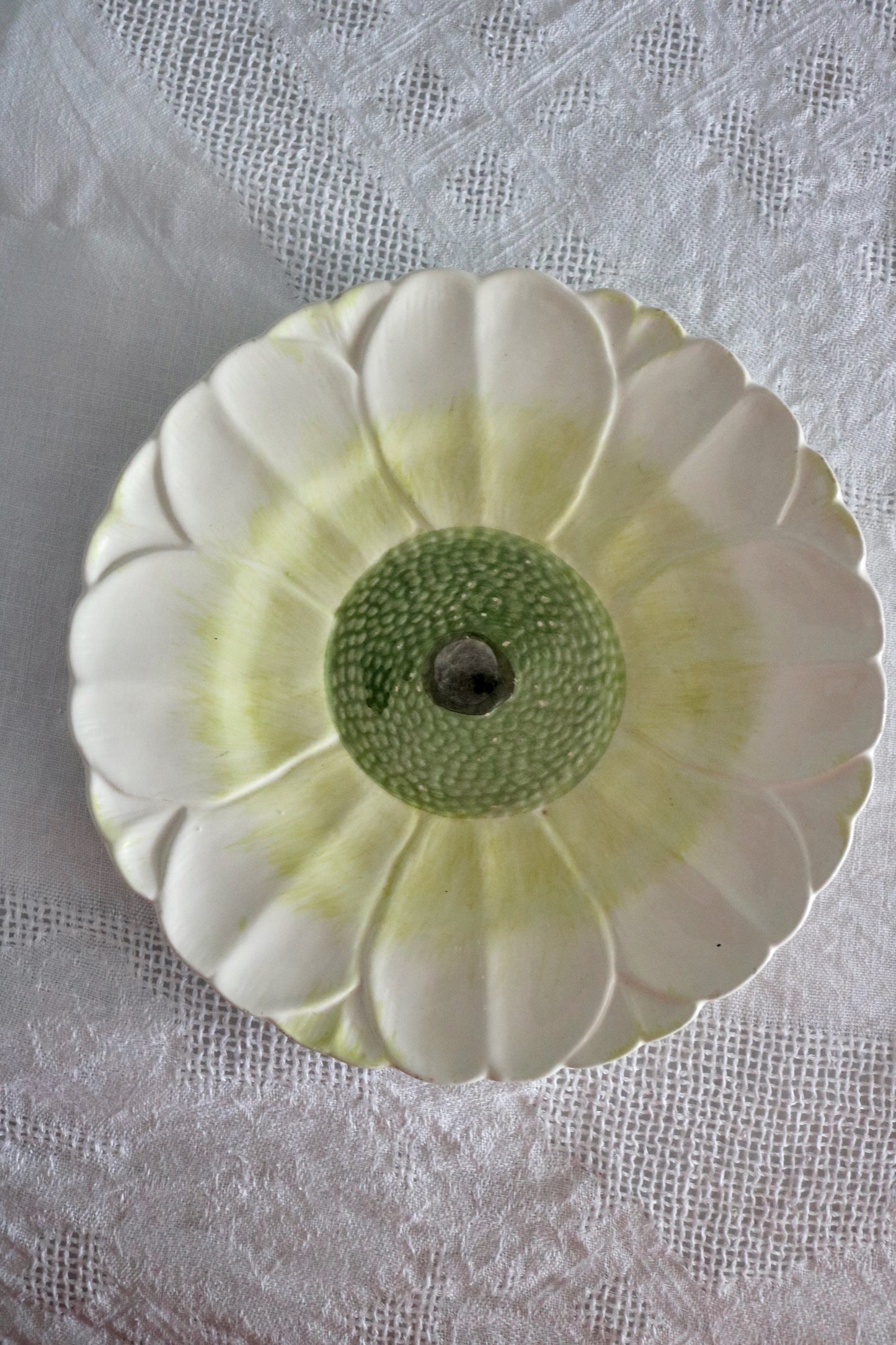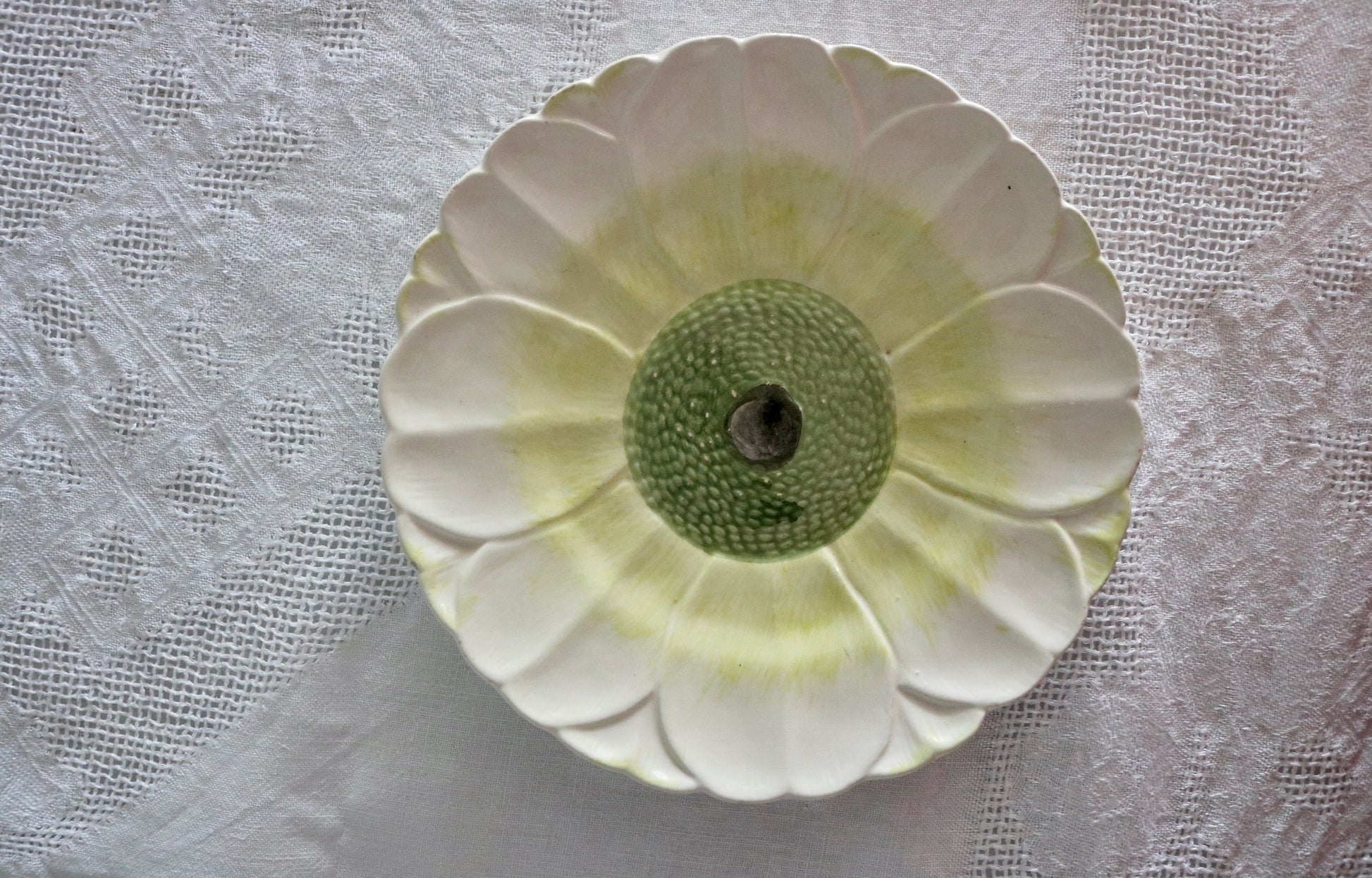 A flower shaped ceramic plate made by Bordallo Pinheiro in Portugal in sunny yellow, green and white.