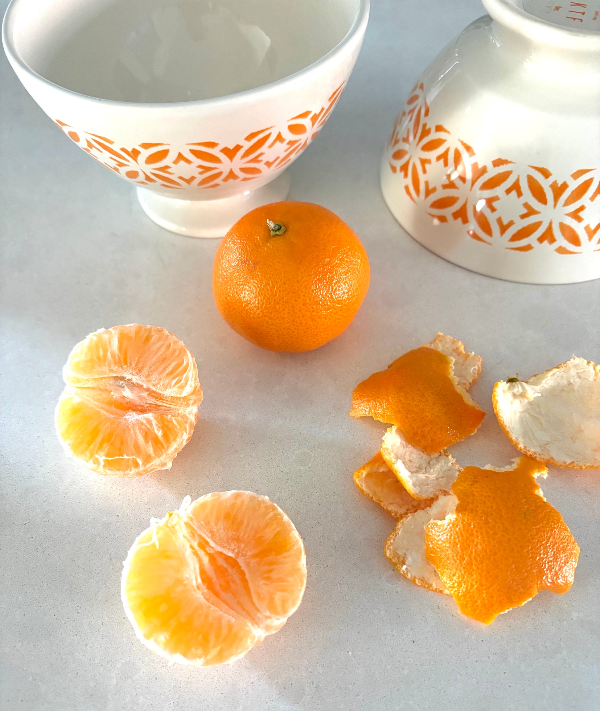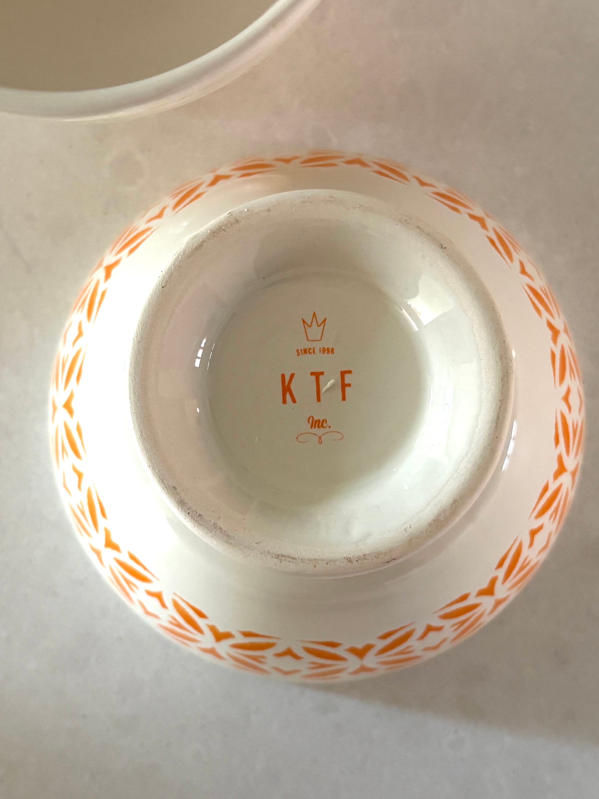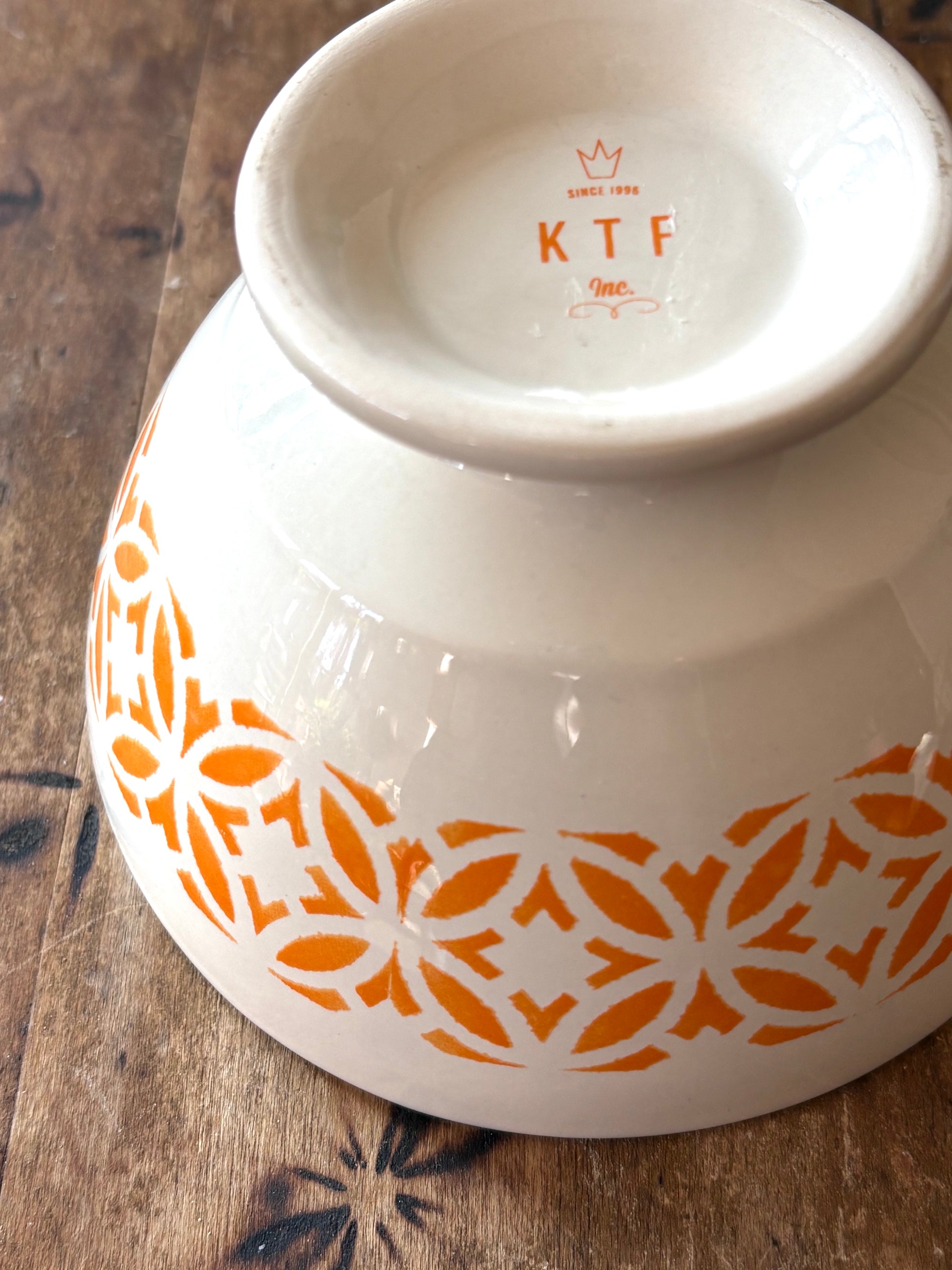 cafe au lait bowls - set of two. A cheerful orange geometric design on white.