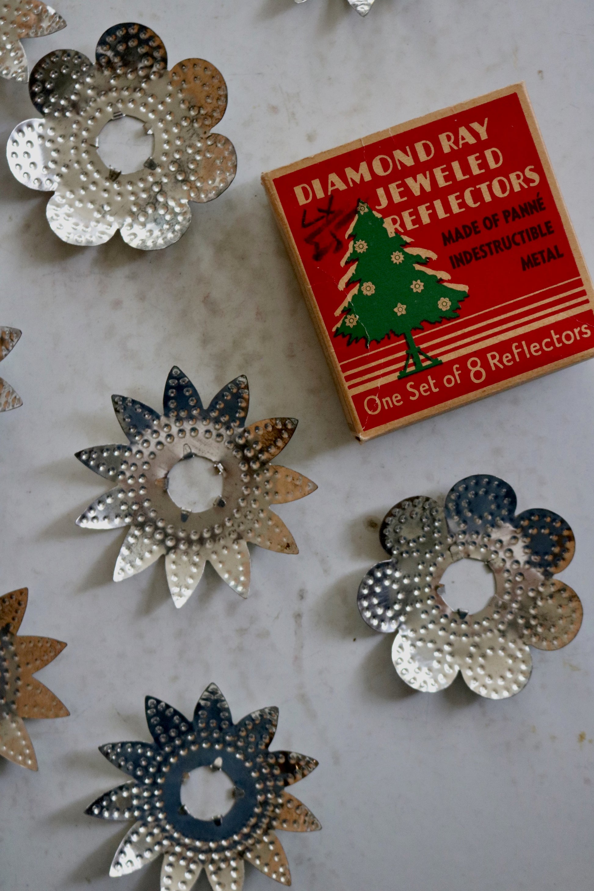 A set of vintage punched metal Diamond Ray Christmas tree light reflectors in its original box.