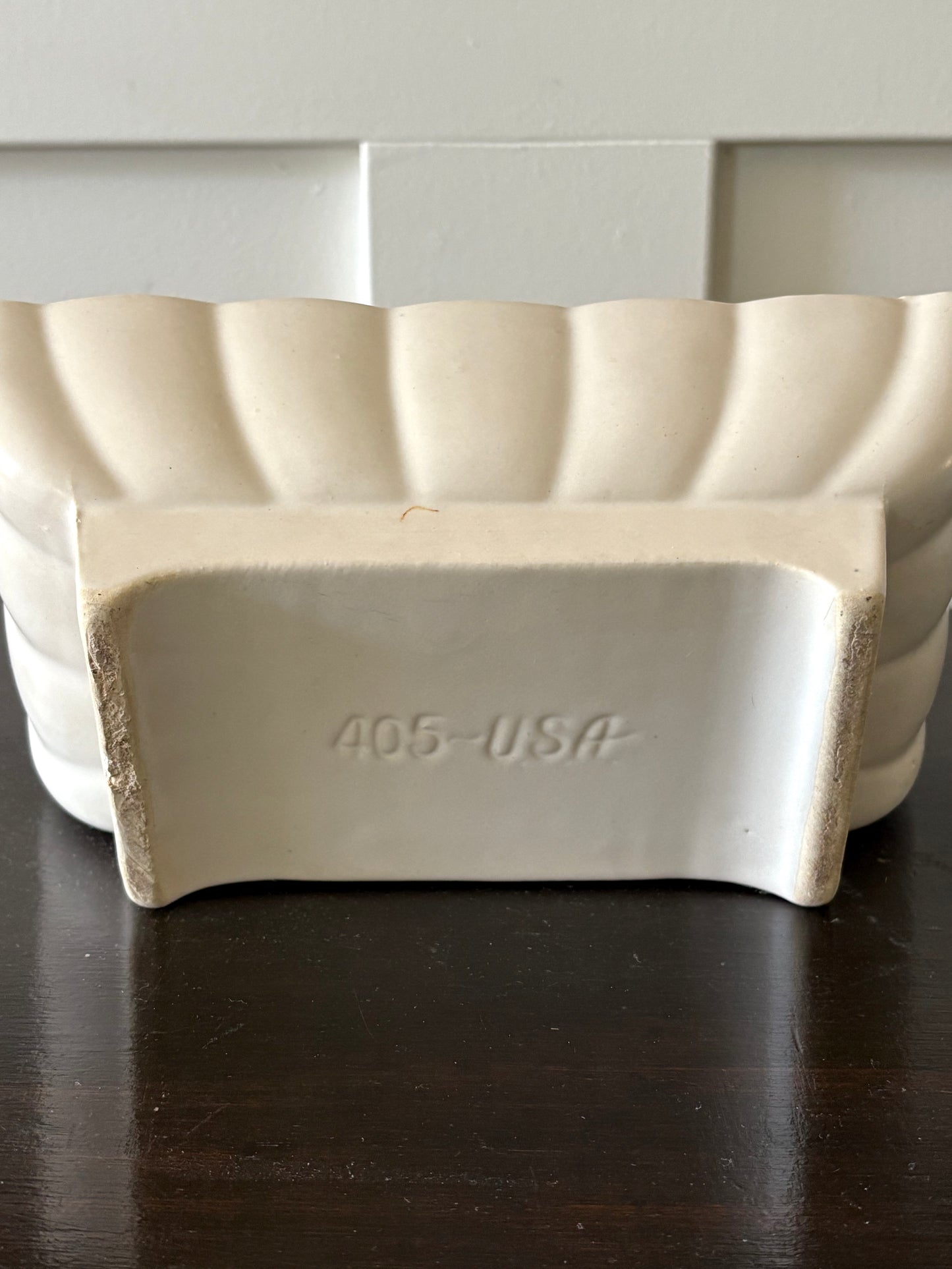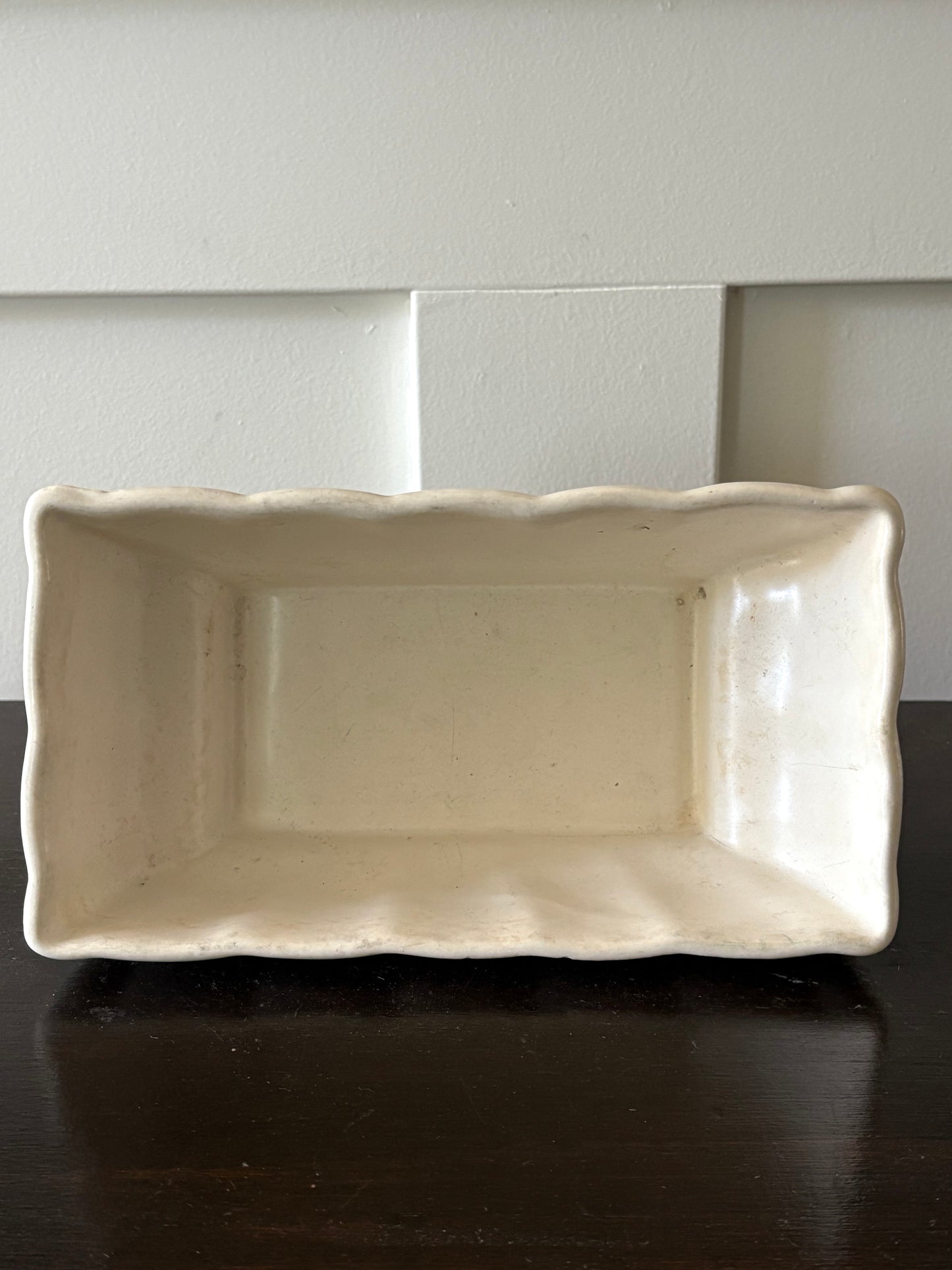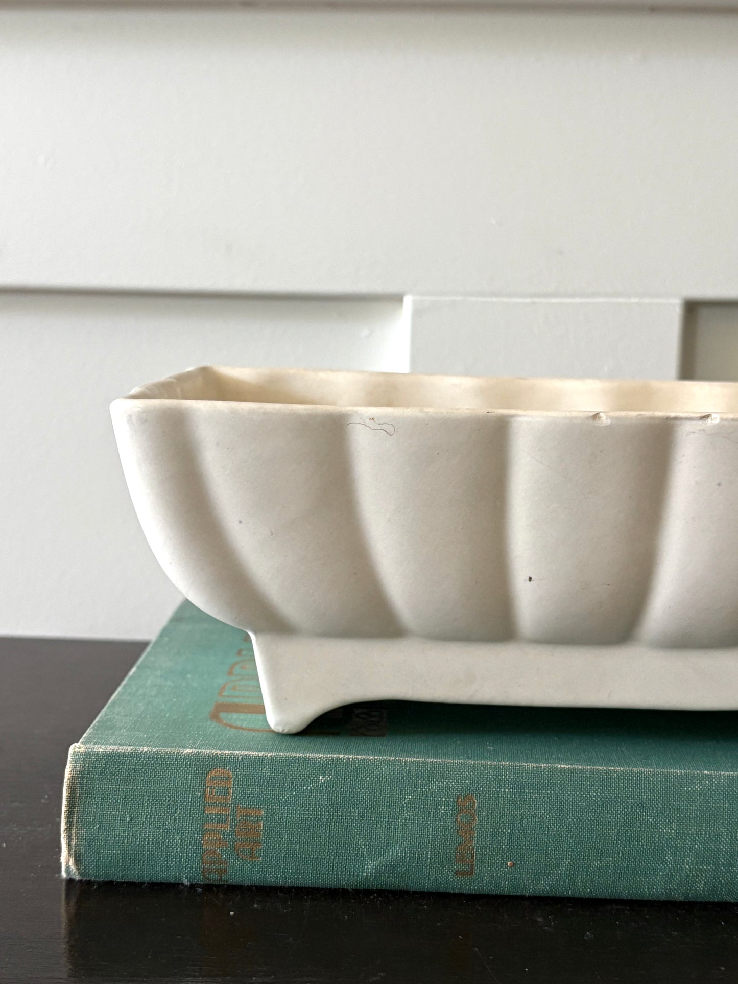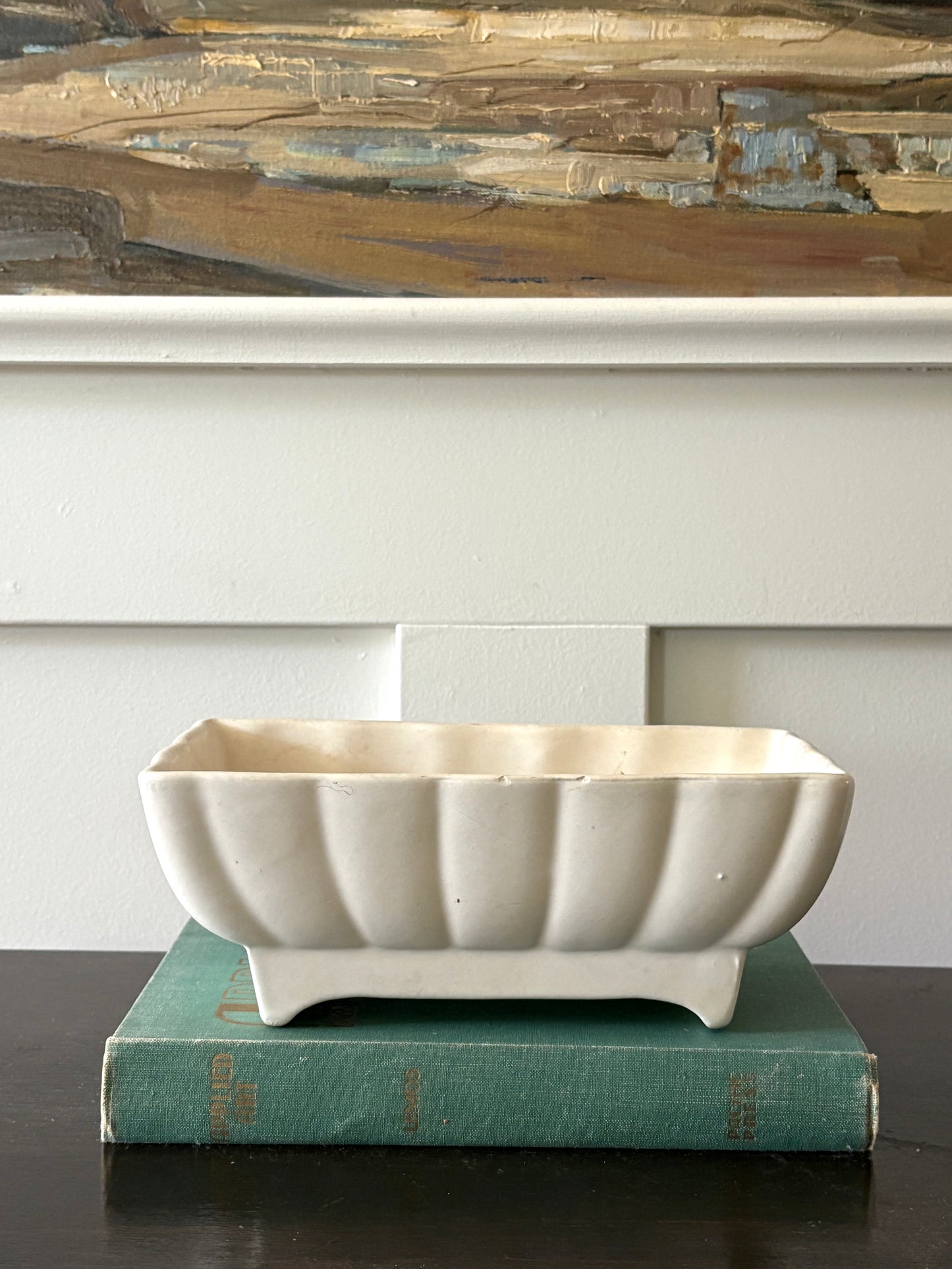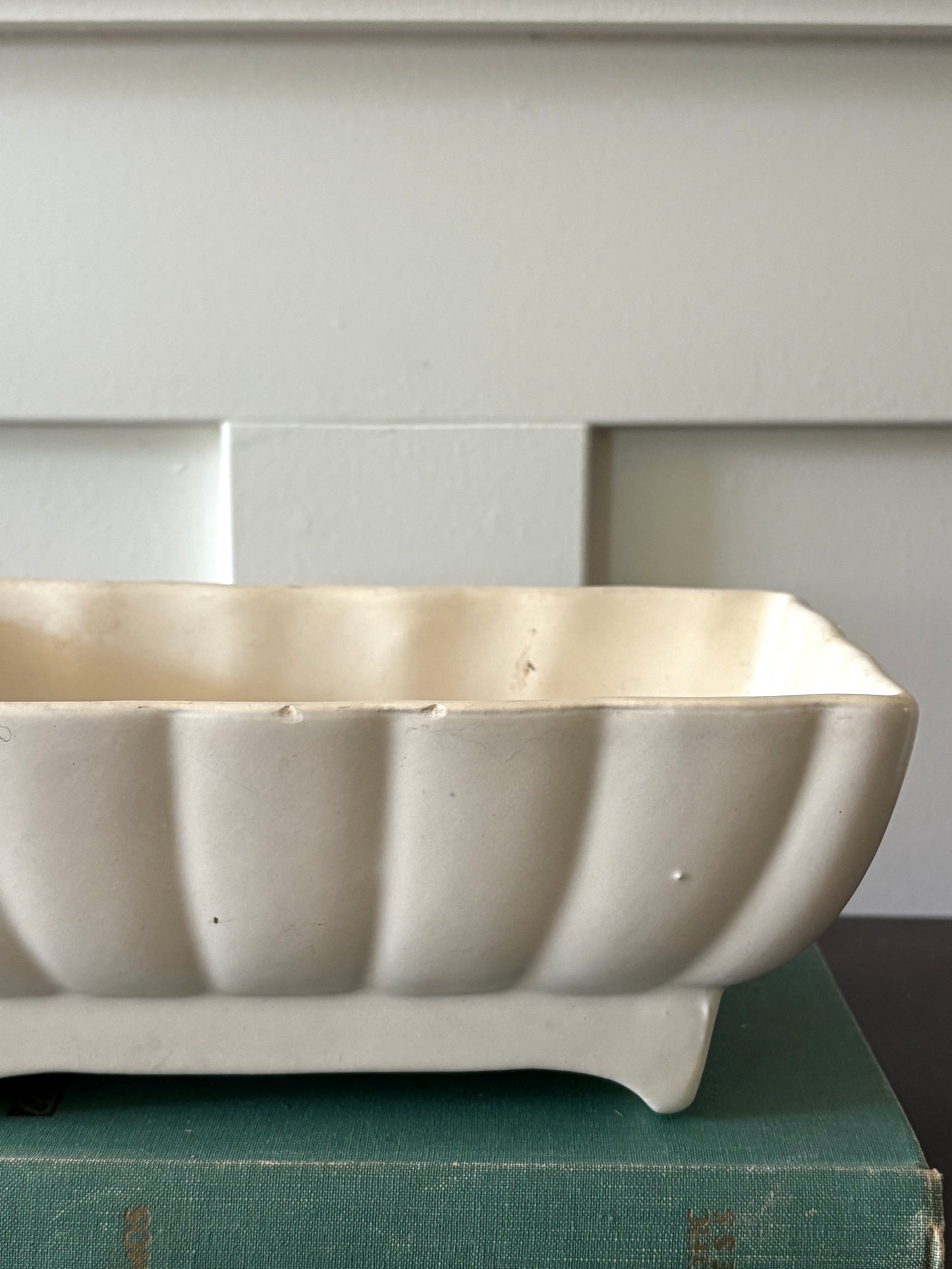 Rectangular cream white footed planter in a rectangular shape with scalloped design in matte cream white glaze. It is a great size for a favourite plant, succulent or small window herb garden.