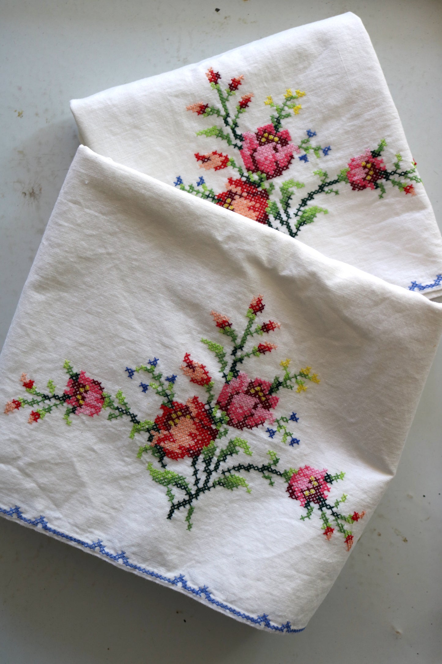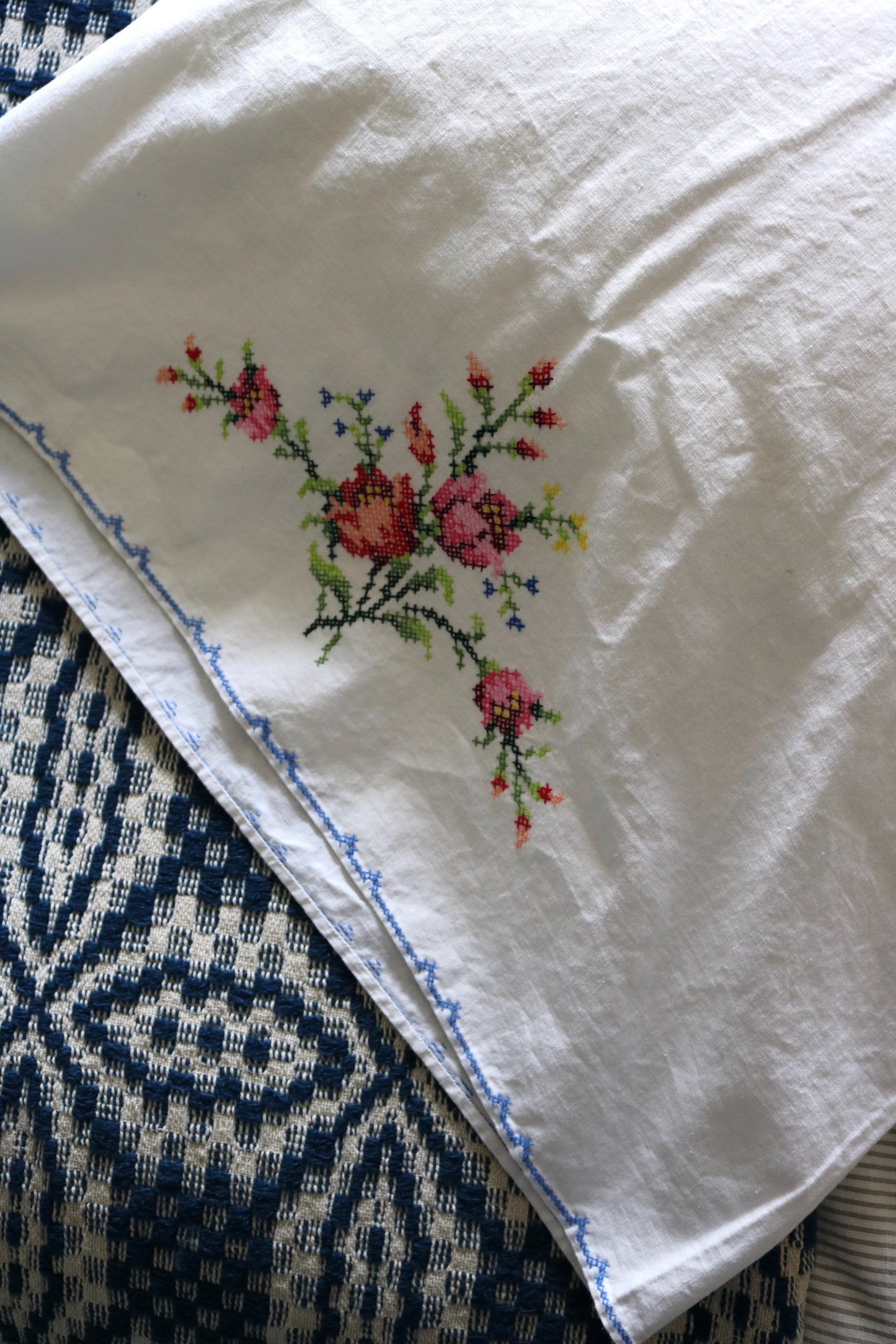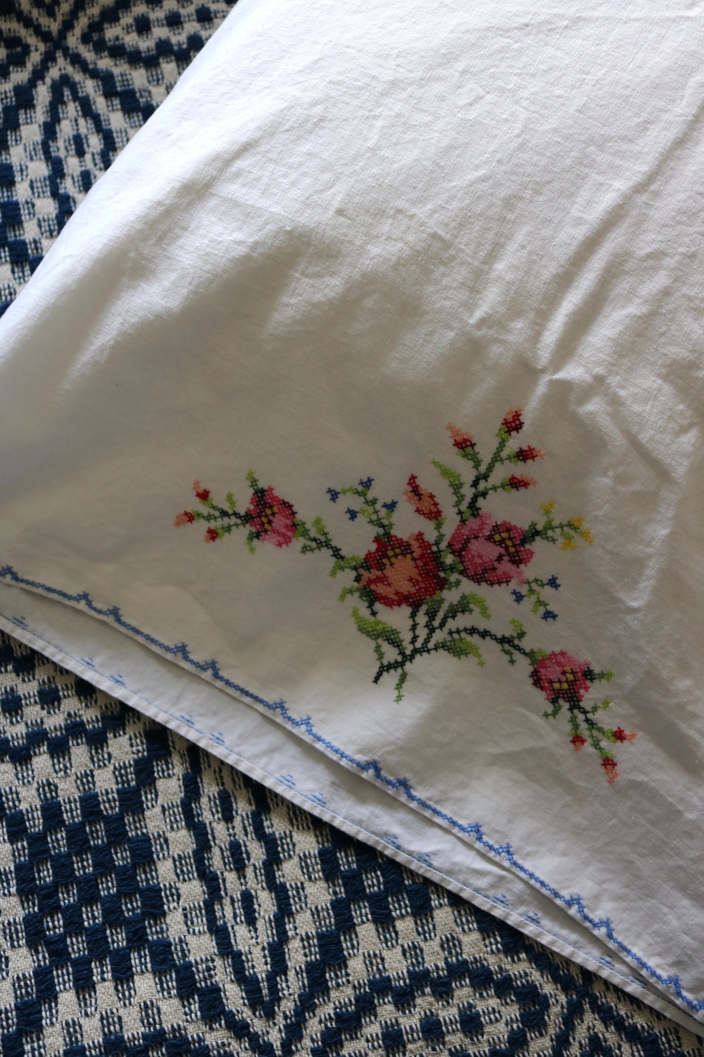 A set of two cross stitched white cotton pillow cases. Such a lovely addition to a bed with the pretty cross stitch floral design and blue trim. Fits standard pillows.