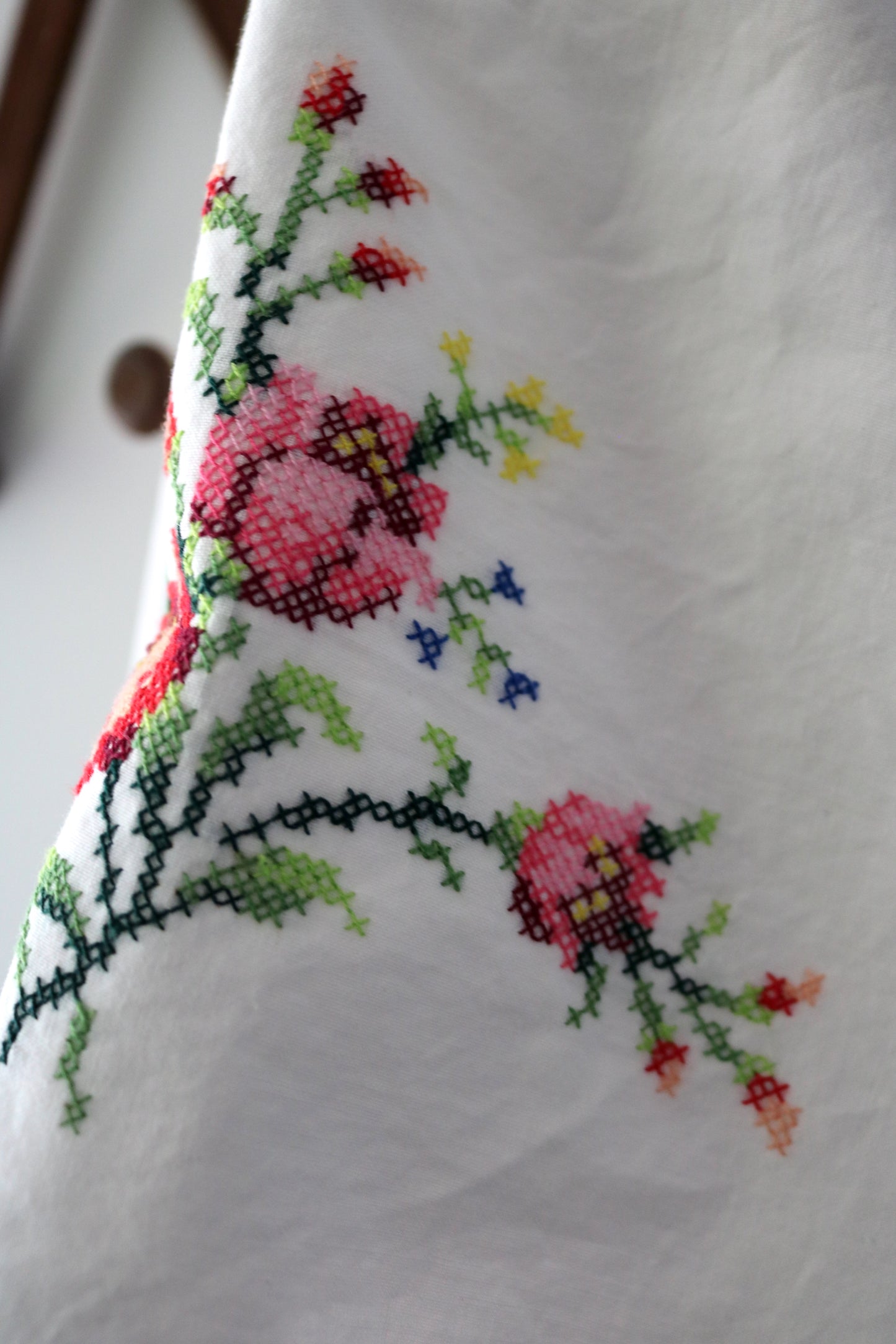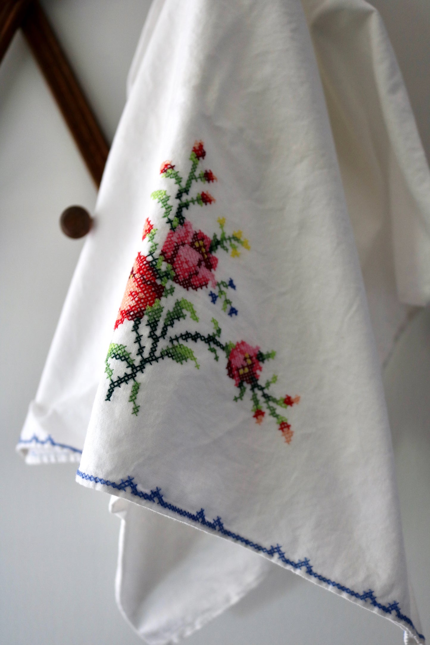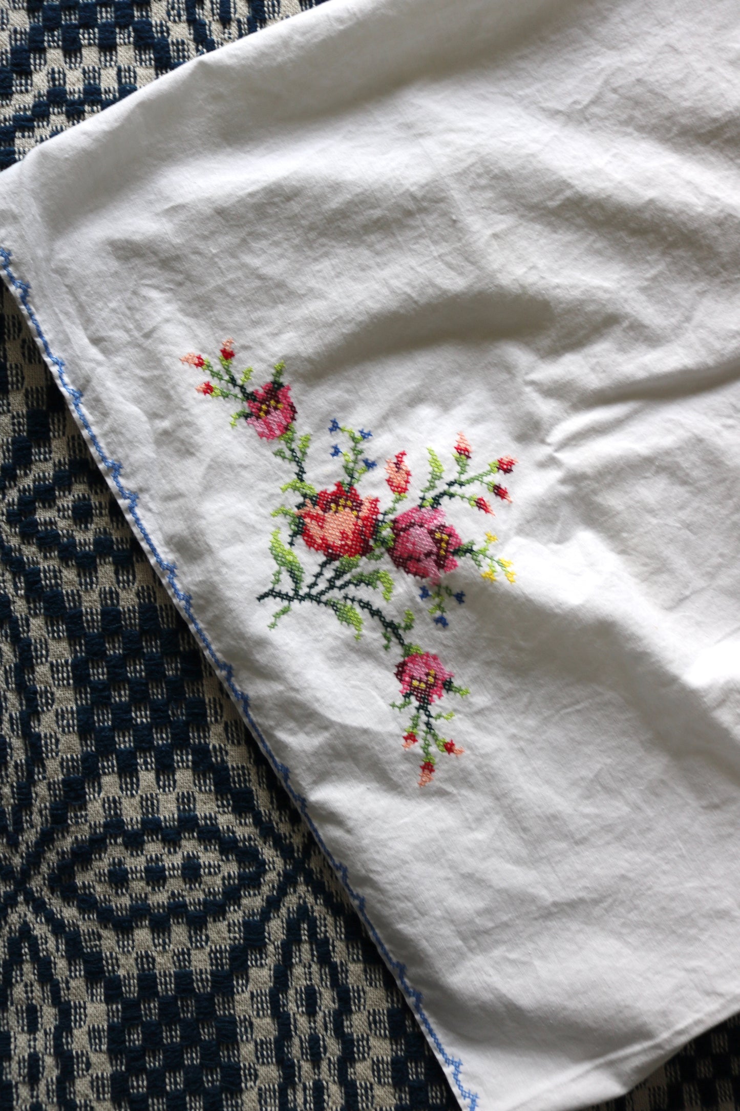 A set of two cross stitched white cotton pillow cases. Such a lovely addition to a bed with the pretty cross stitch floral design and blue trim. Fits standard pillows.