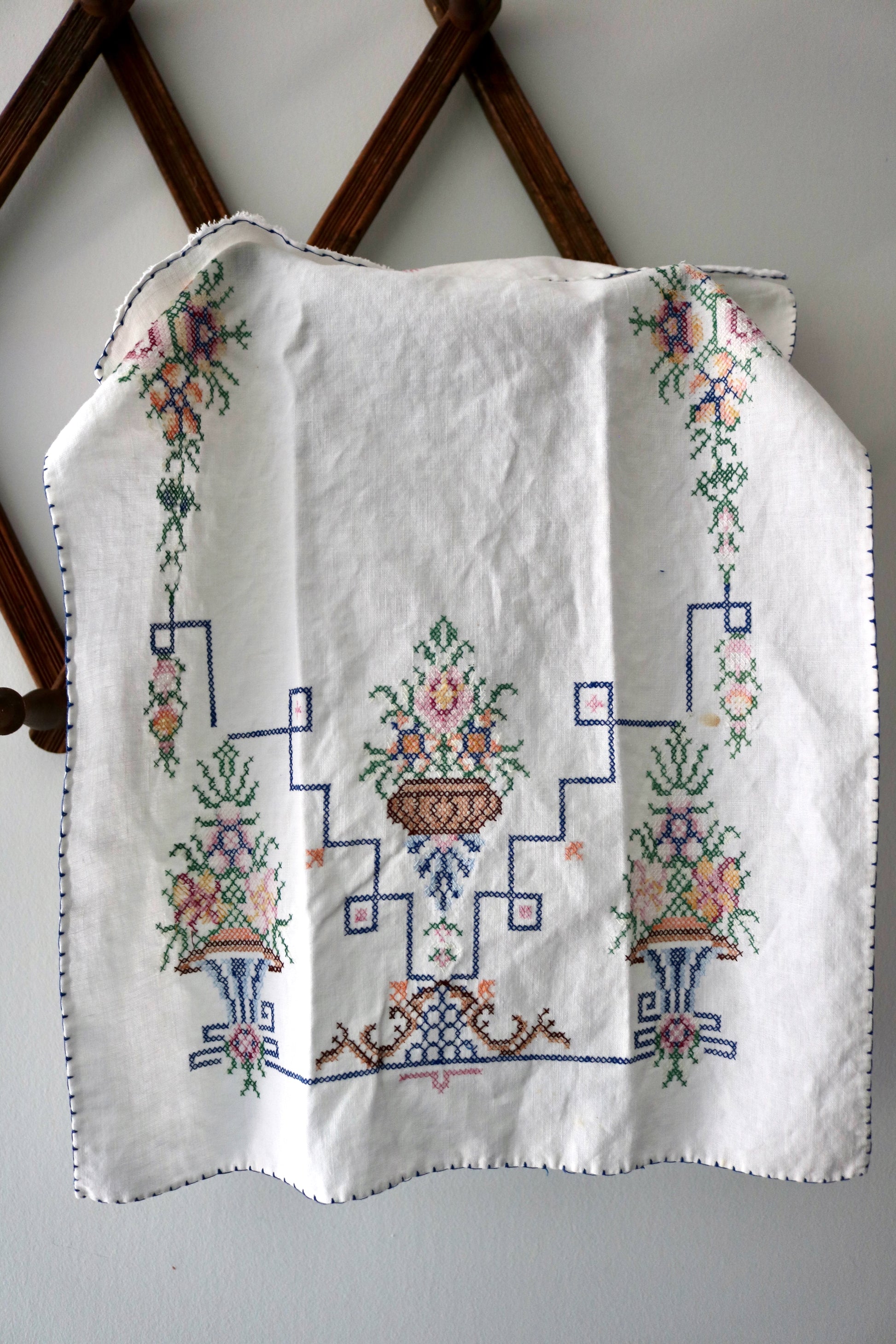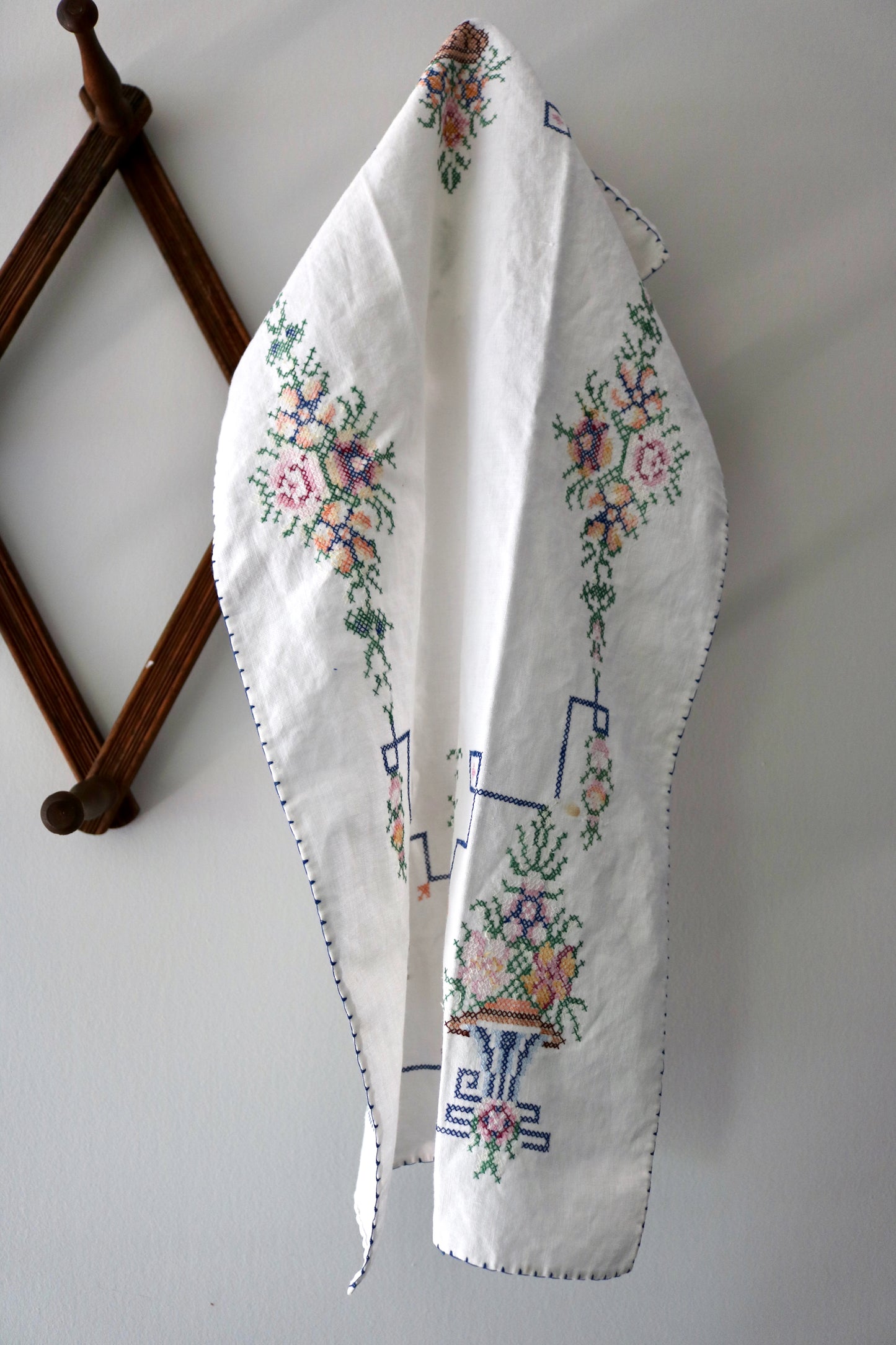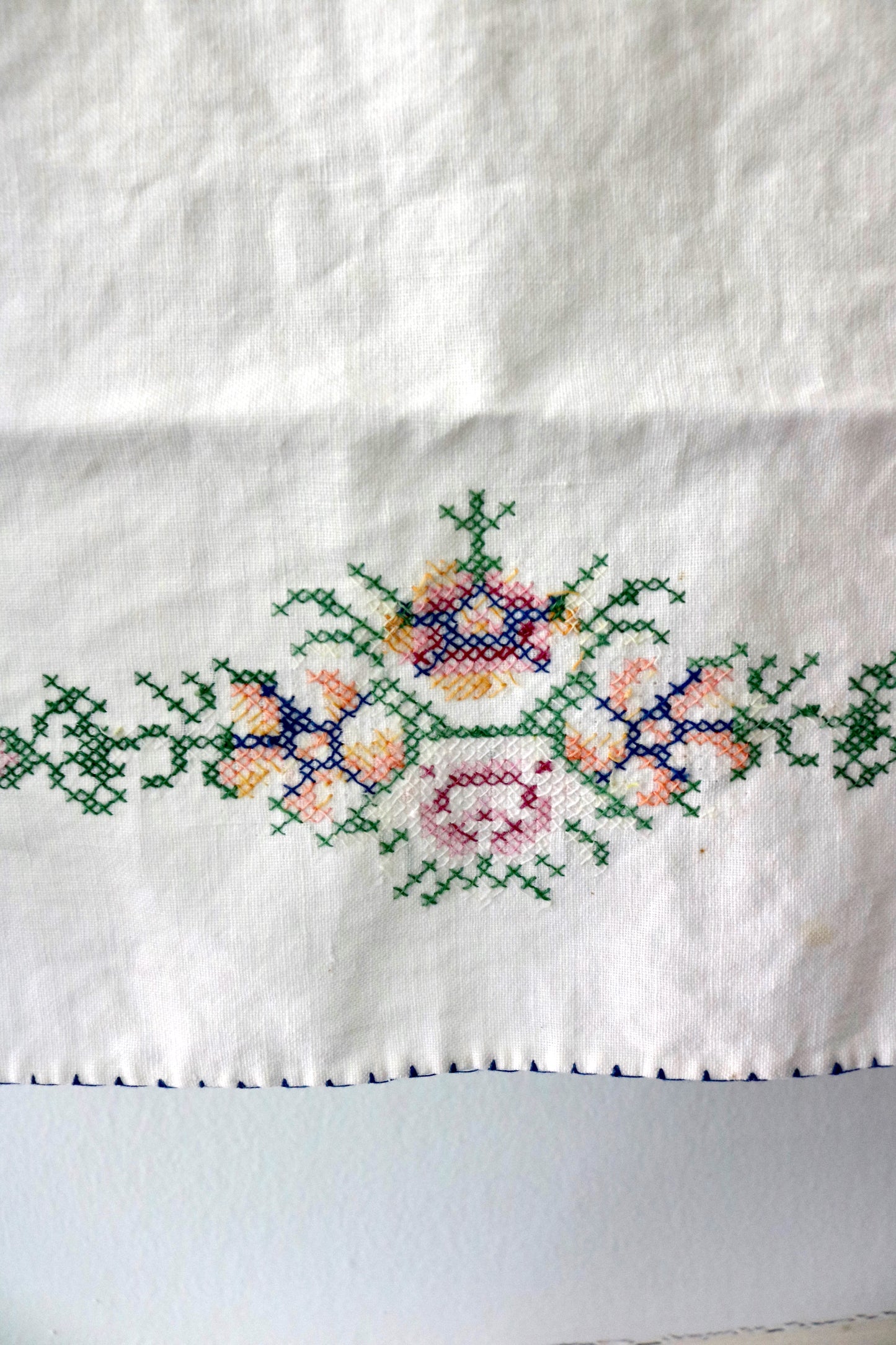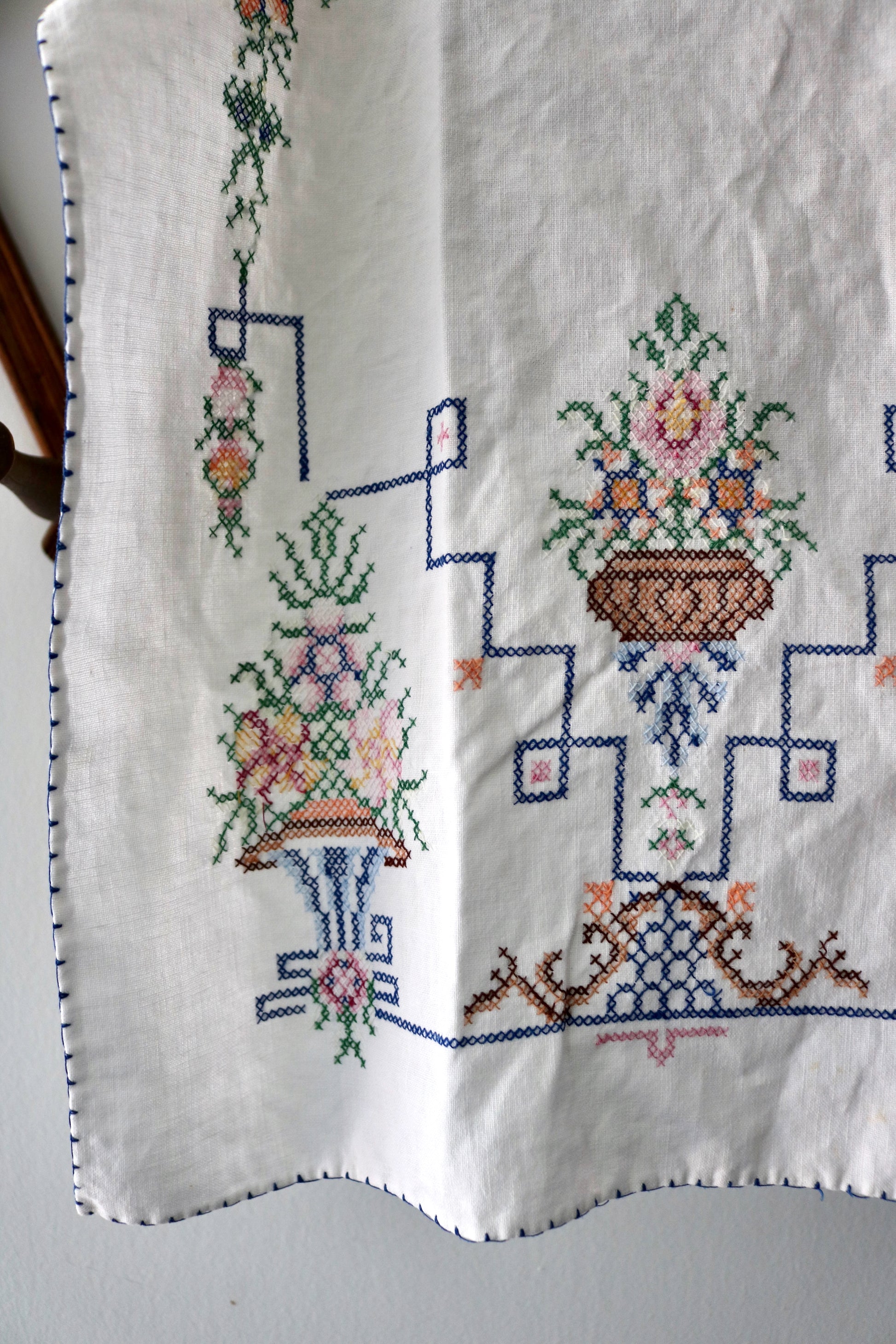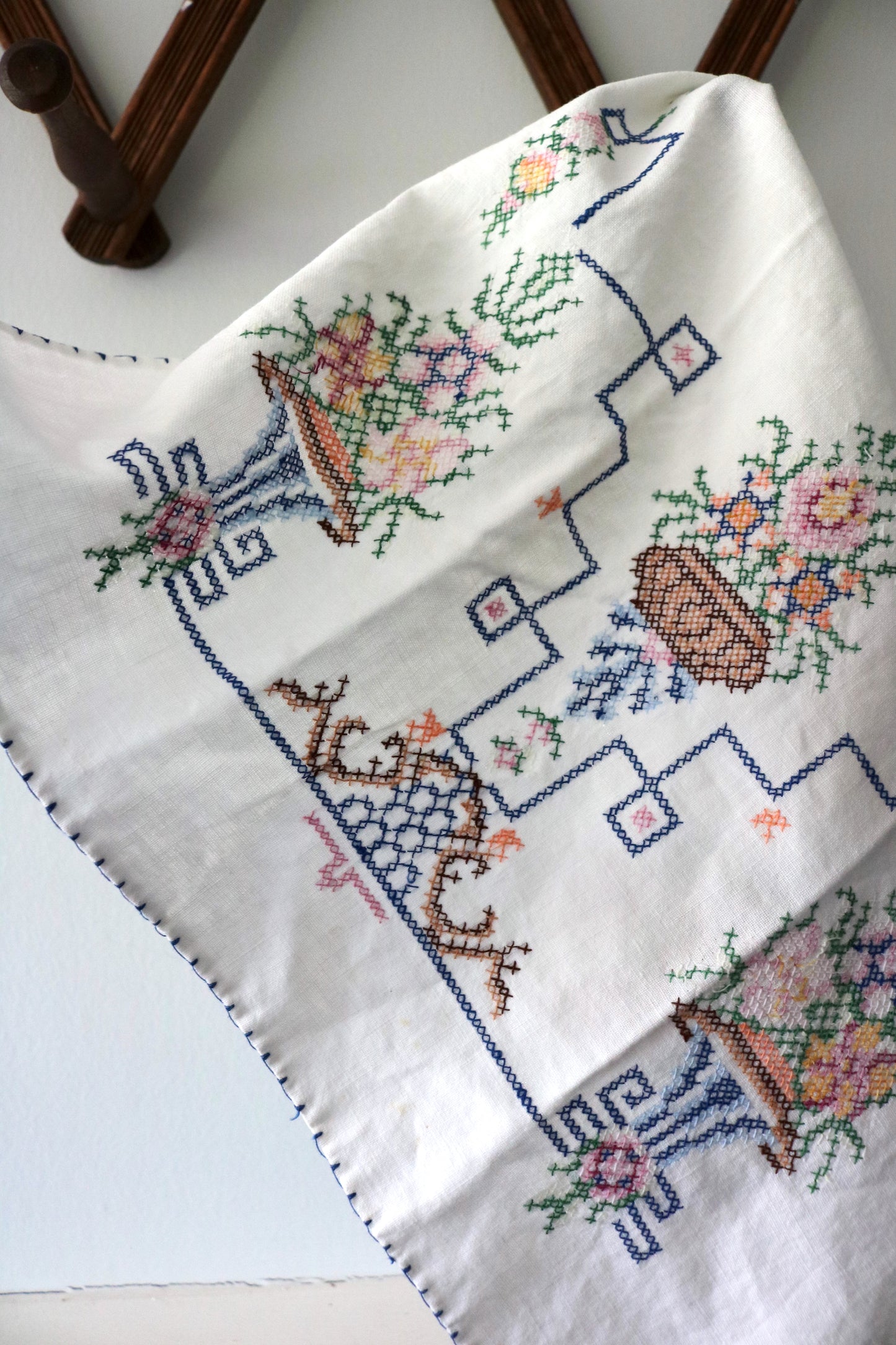 A charming hand crafted cross stitch cotton table runner with floral design and a pretty blue edge. Freshly laundered. May have originally been used as a dresser cloth.