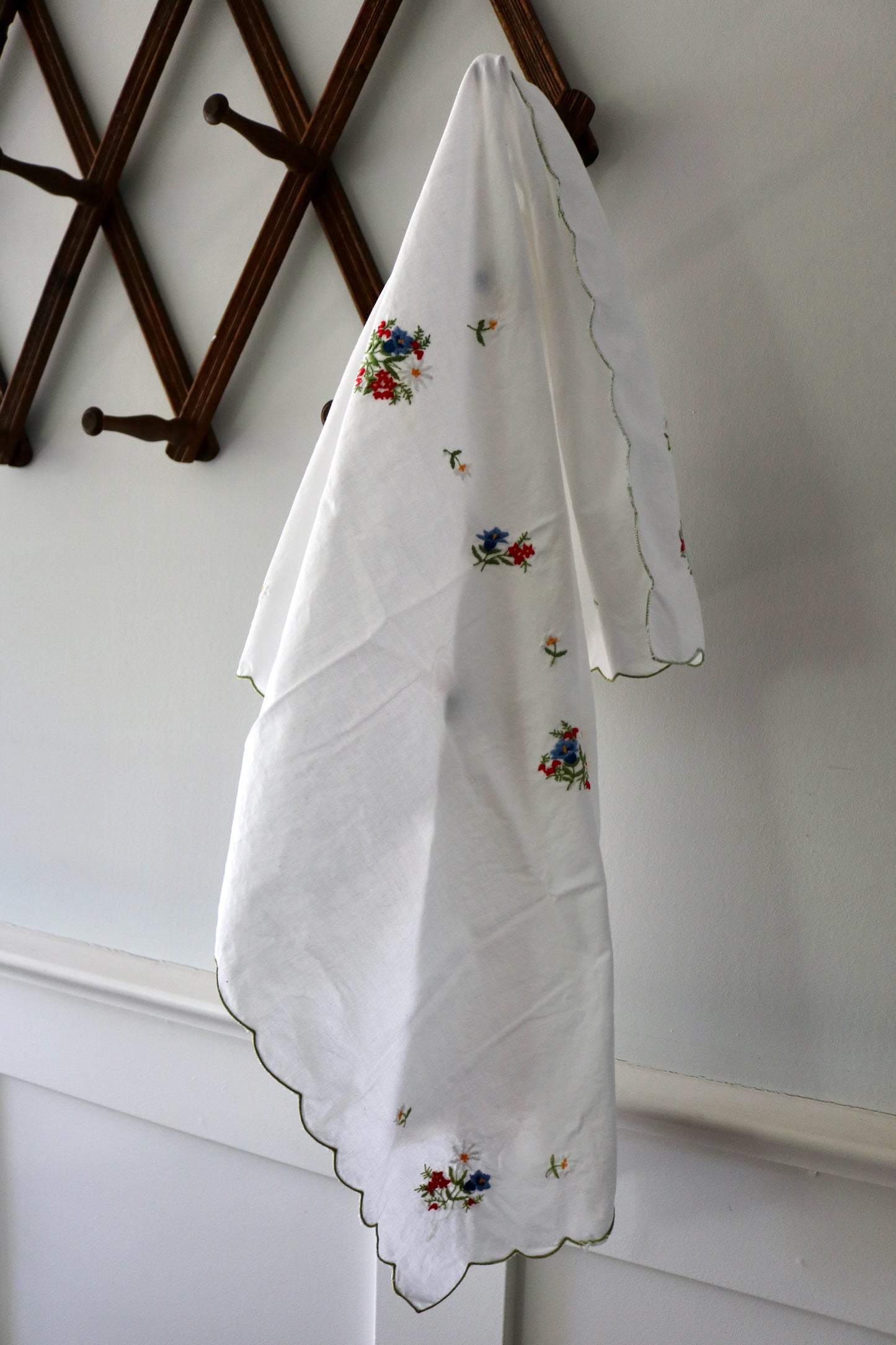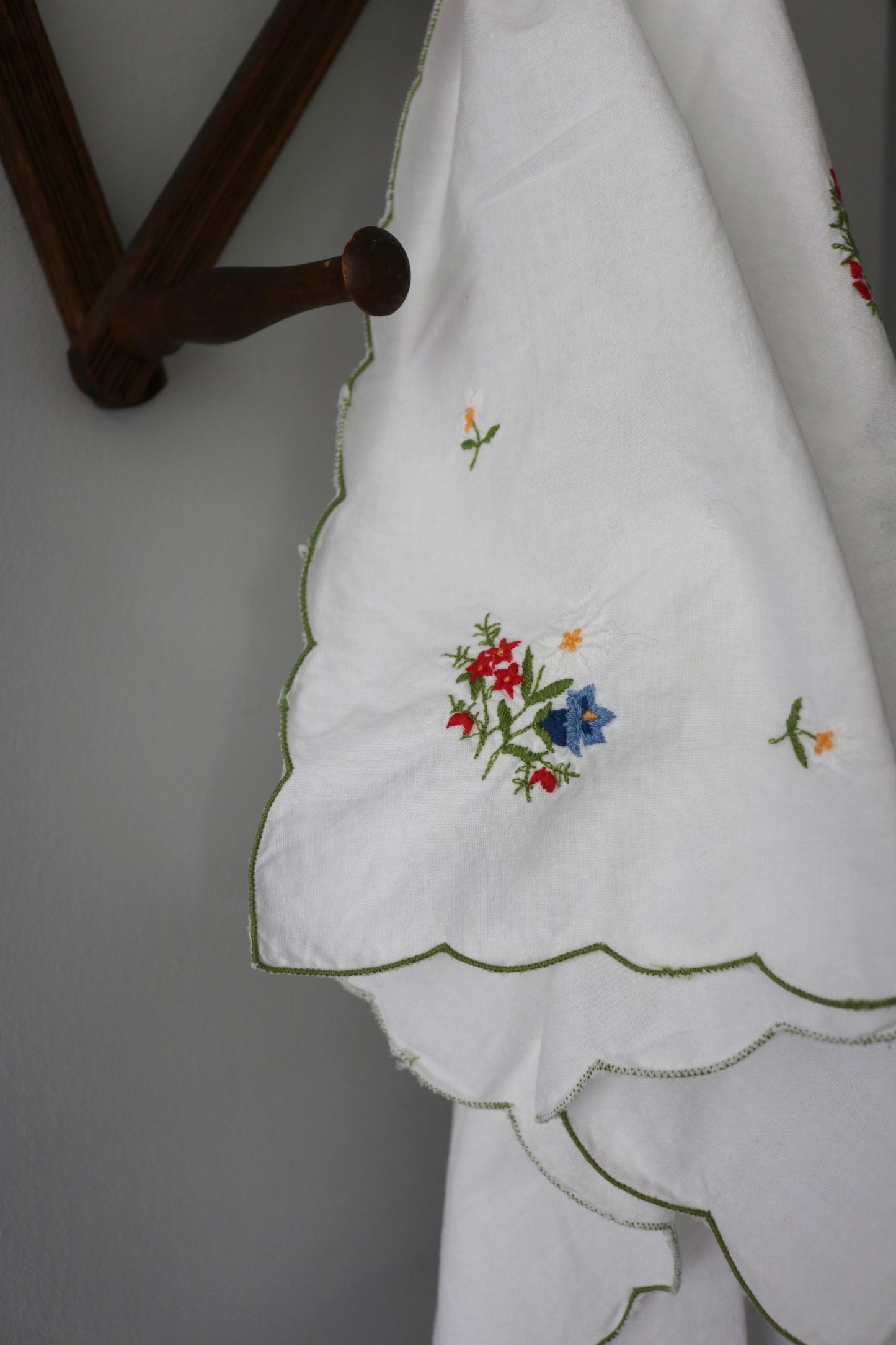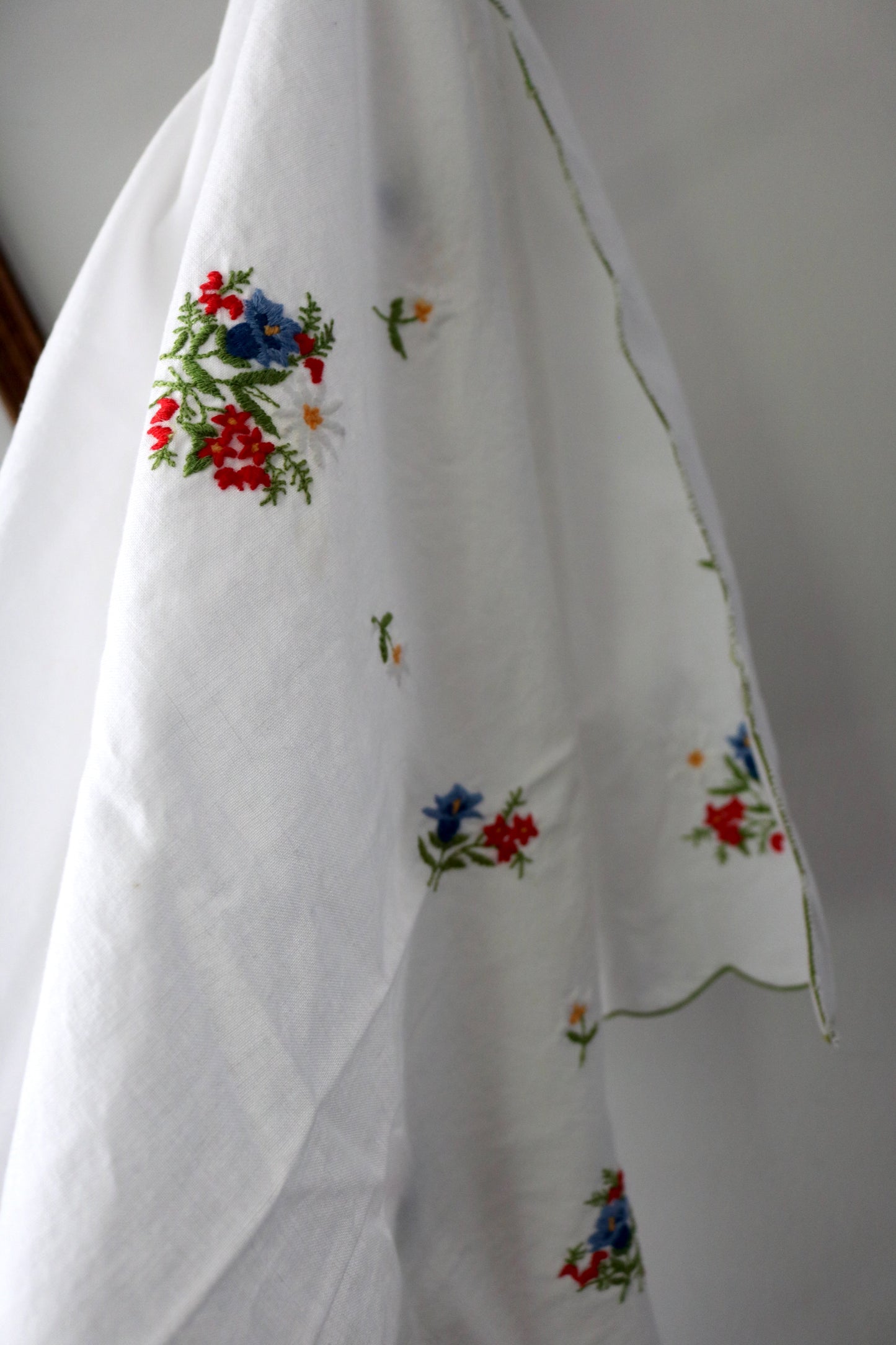 A charming vintage handmade cotton tablecloth with pretty embroidered flowers and green scalloped edge. The flowers are embroidered on each corner and in centre of the tablecloth.
