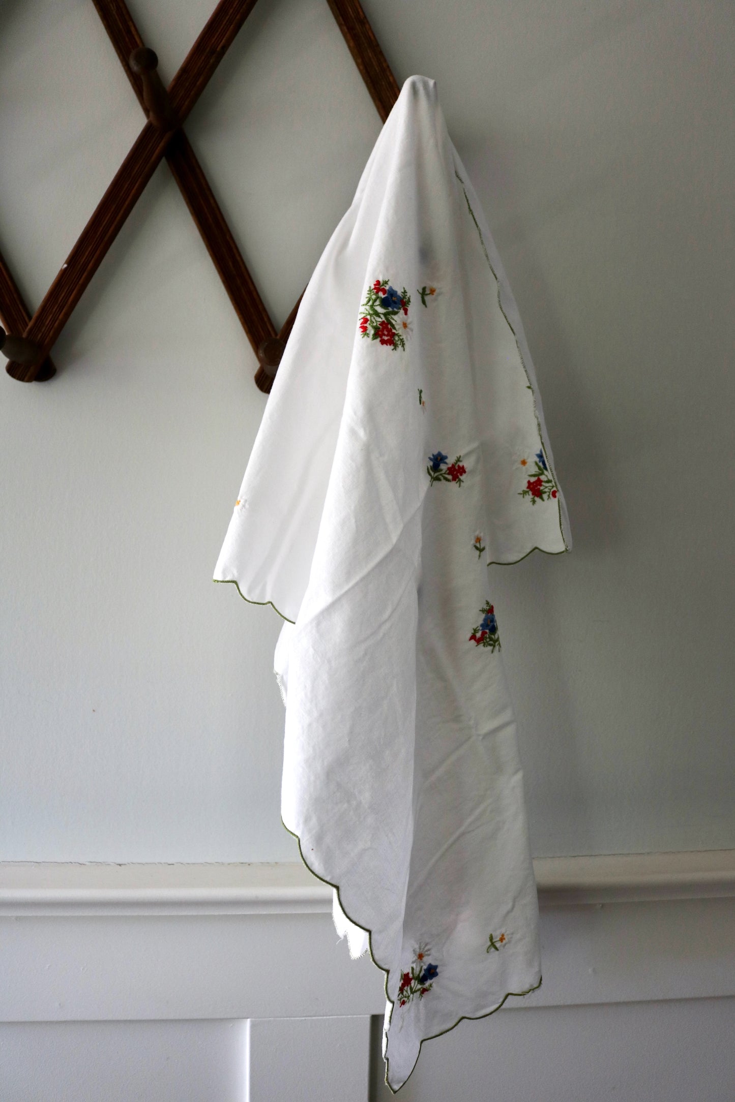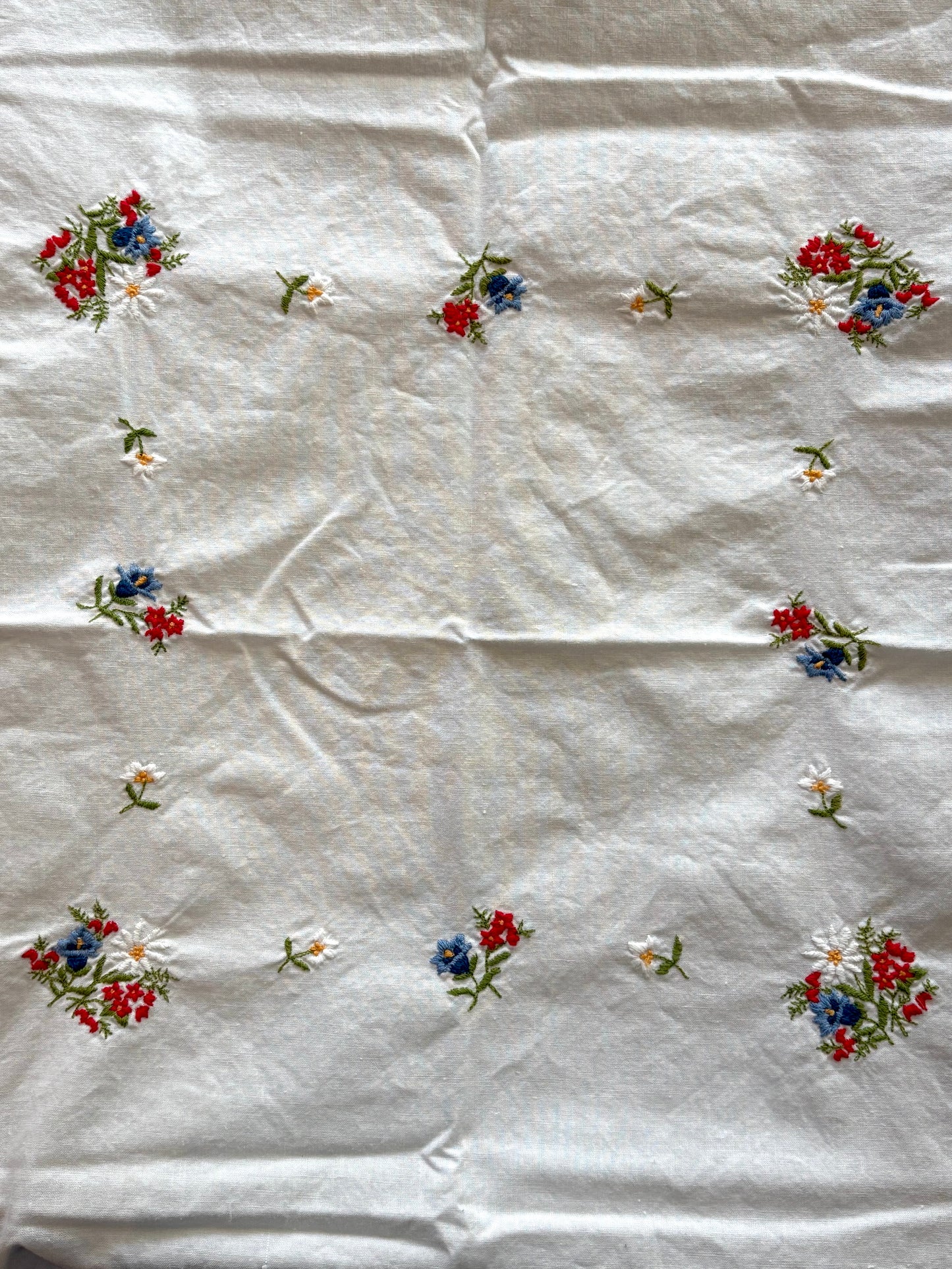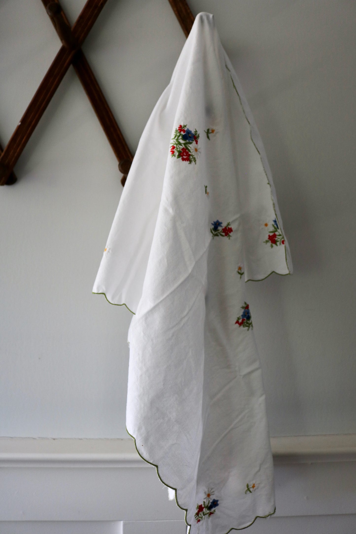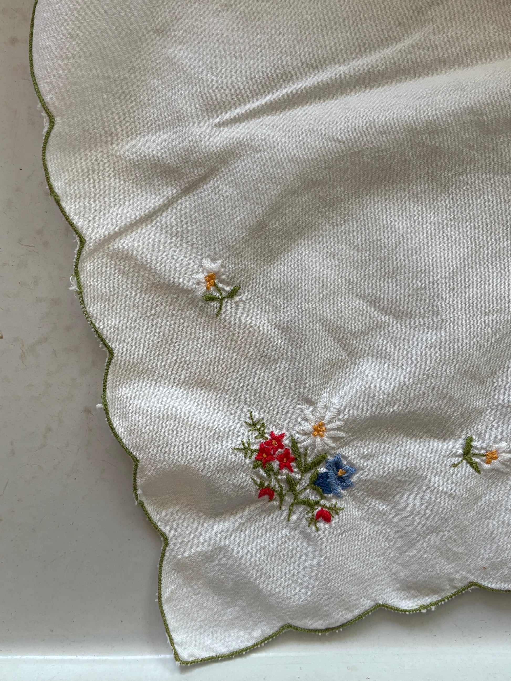 A charming vintage handmade cotton tablecloth with pretty embroidered flowers and green scalloped edge. The flowers are embroidered on each corner and in centre of the tablecloth.