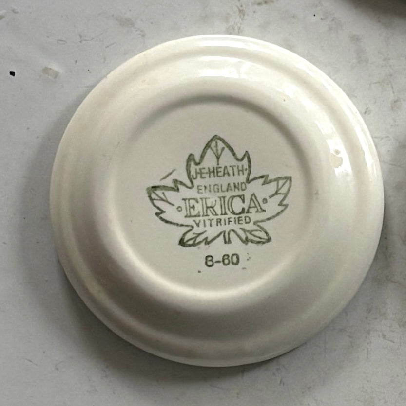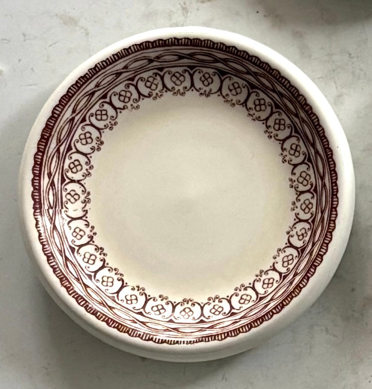 Vintage English butter pat made of vitrified china by J.E. Heath. Deep red or burgundy floral design on white background. Use as intended or as a pinch dish for salt on the table.