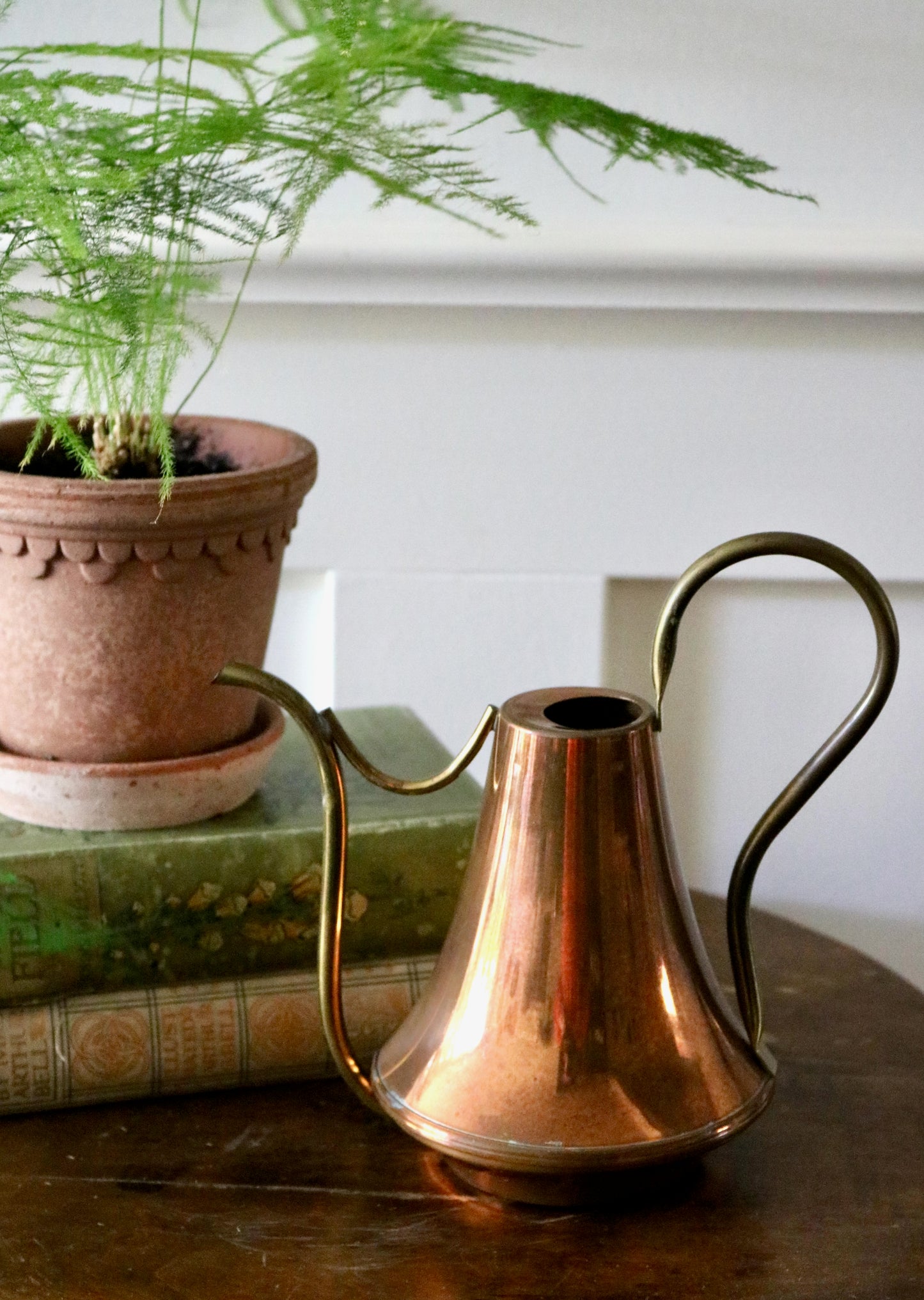 Handsome antique English copper and brass watering can with lovely silhouette including a curved brass handle and spout. Perfect for watering indoor house plants or houseplant styling piece.