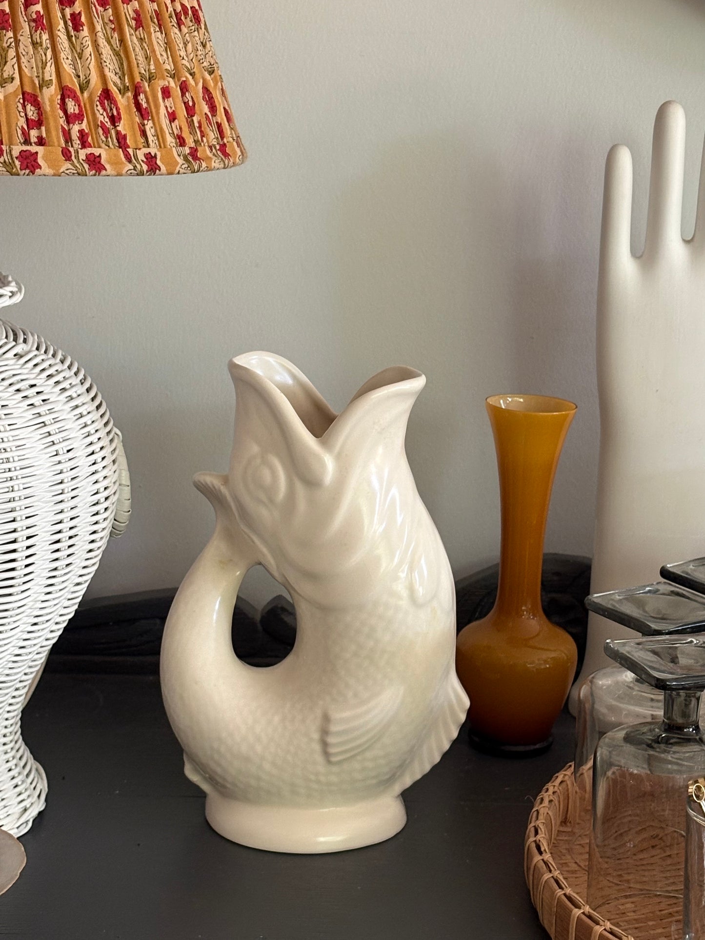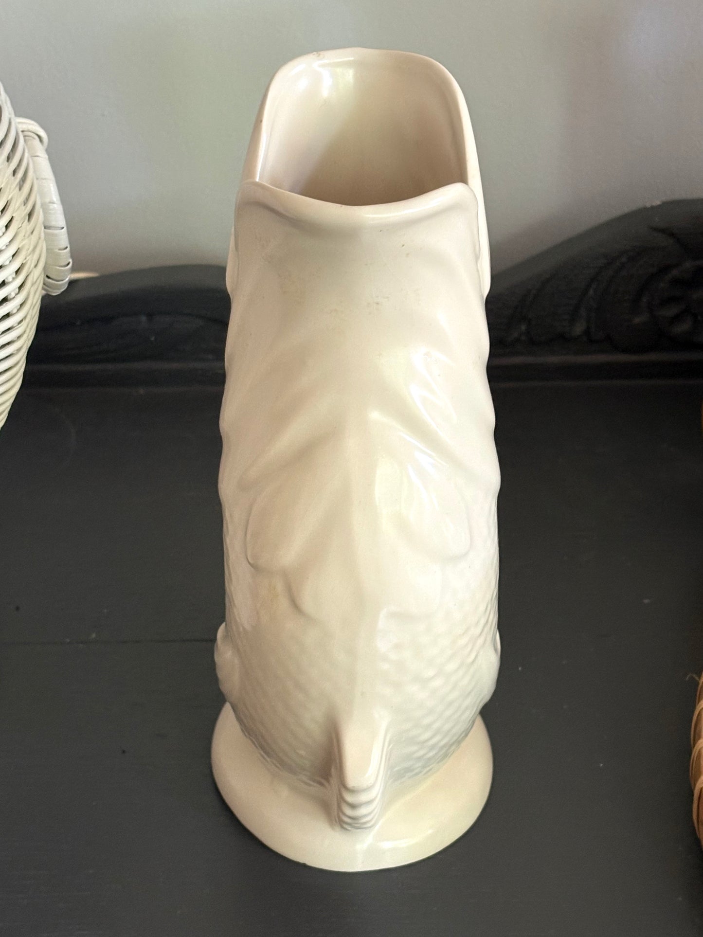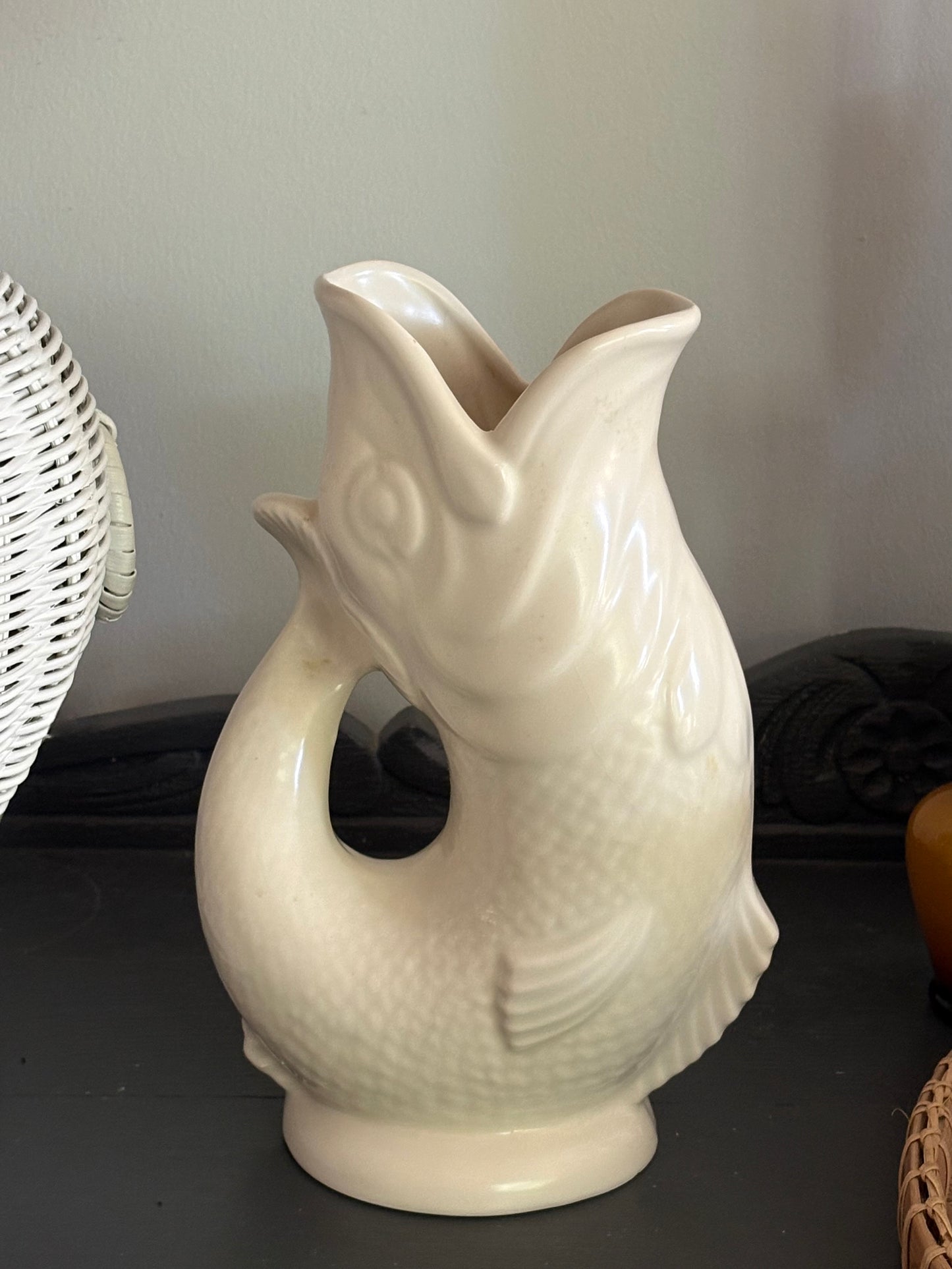 A fabulous vintage English Dartmouth Fish Gurgle Jug in cream white colour. Would make a great vase or display piece. This piece dates to the 1940's/1950's.