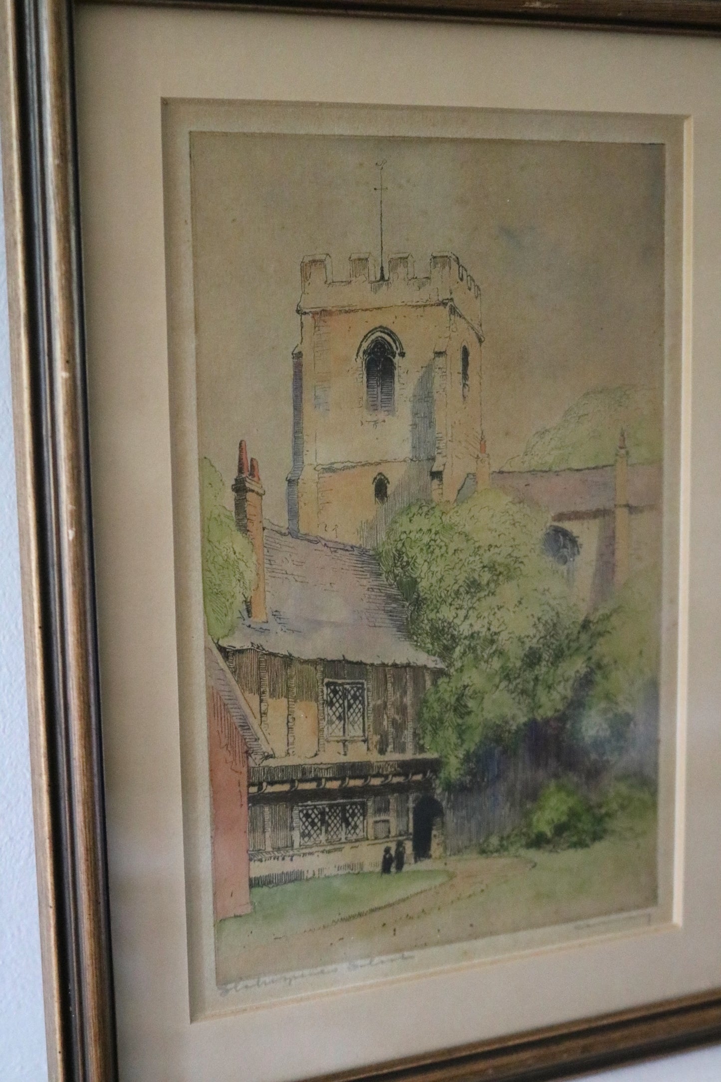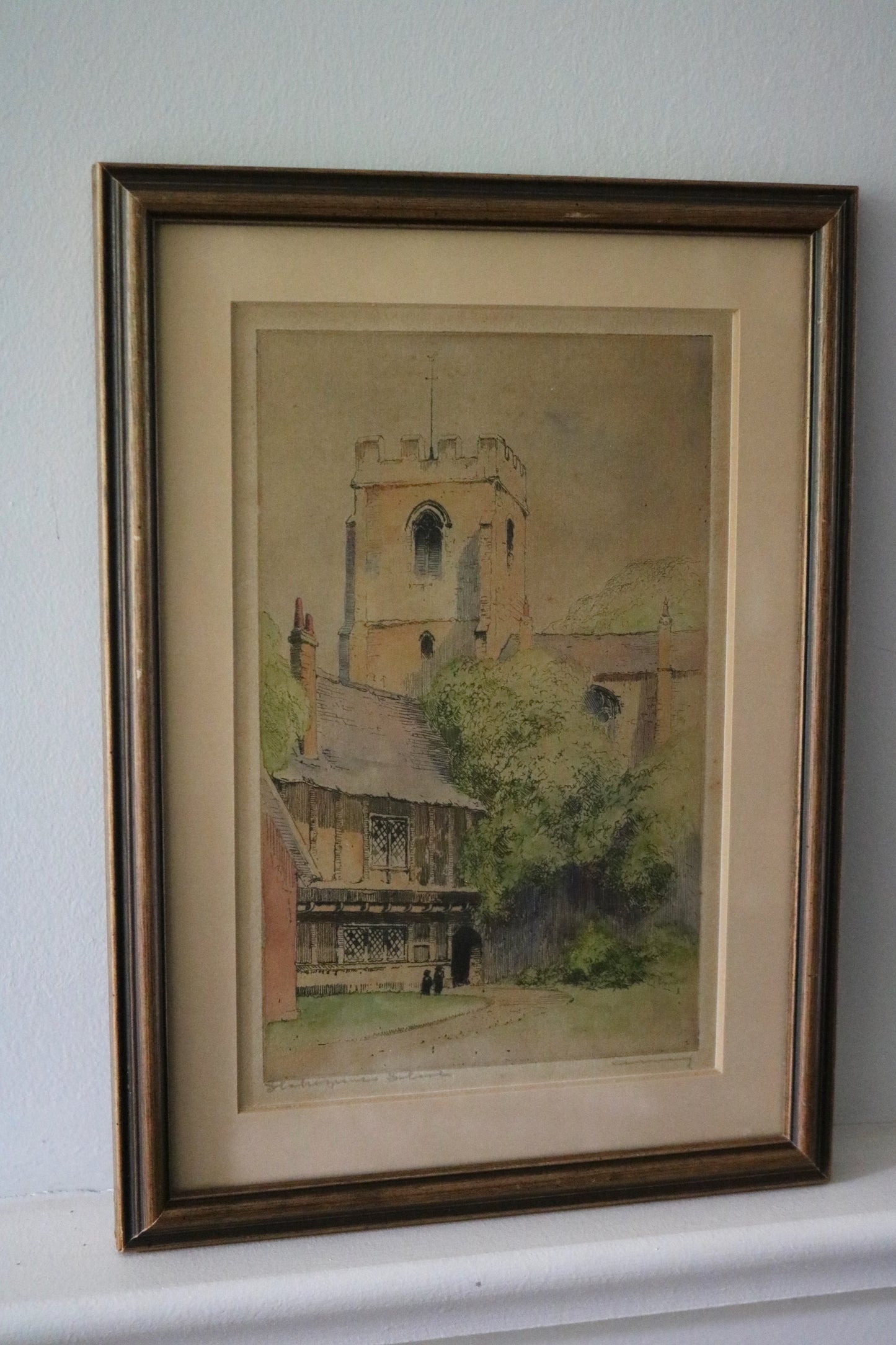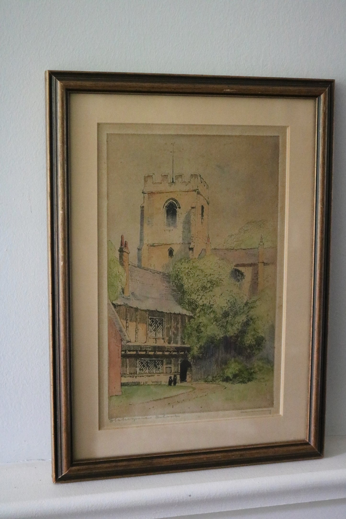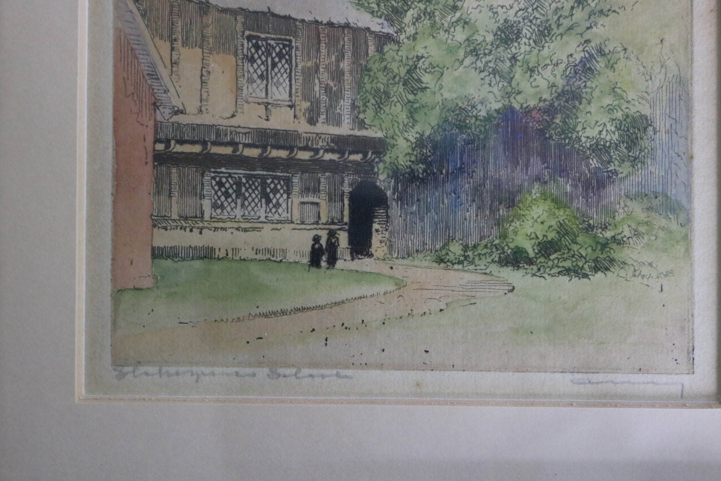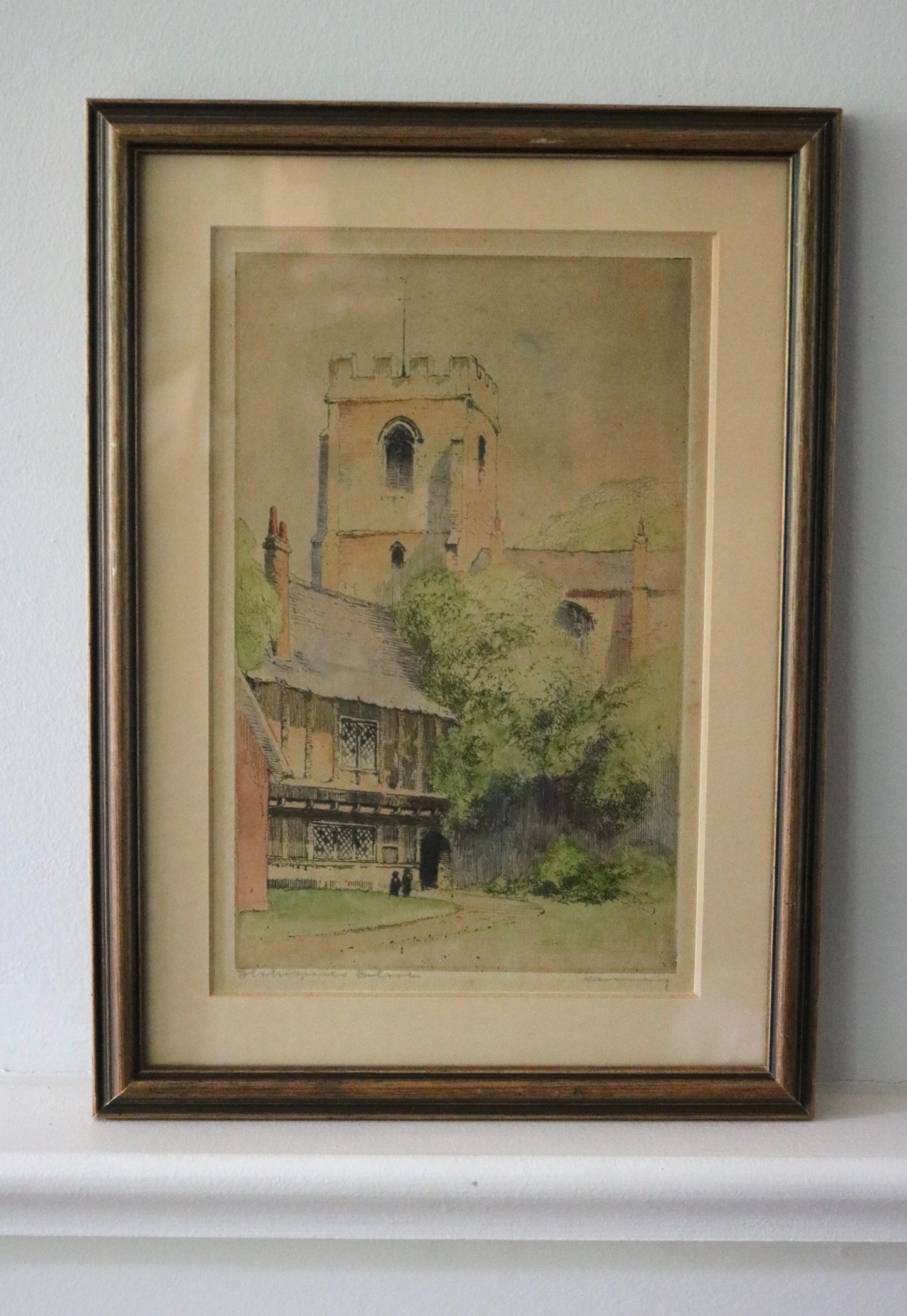 A charming hand coloured etching of Shakespeare's School- The Kings New School and Guild Hall in Stratford-Upon-Avon, England. This art is attributed to the listed English artist Edgar James Mayberry (1887-1964).