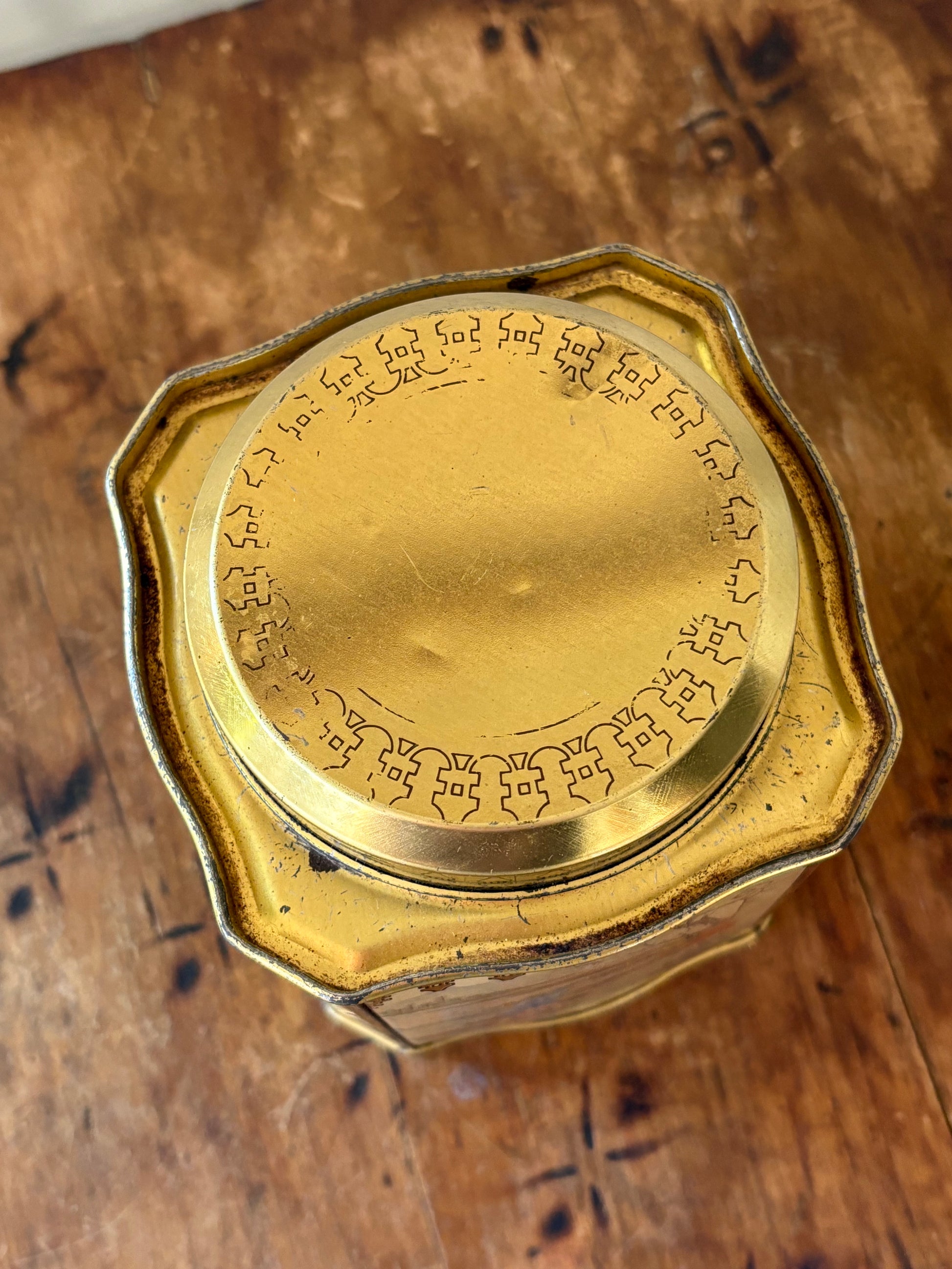 A lovely vintage English tea caddy tin. The artwork depicts people processing tea with each image labelled at the bottom - plucking, sifting, withering, firing. Originally used to store English Breakfast Tea.