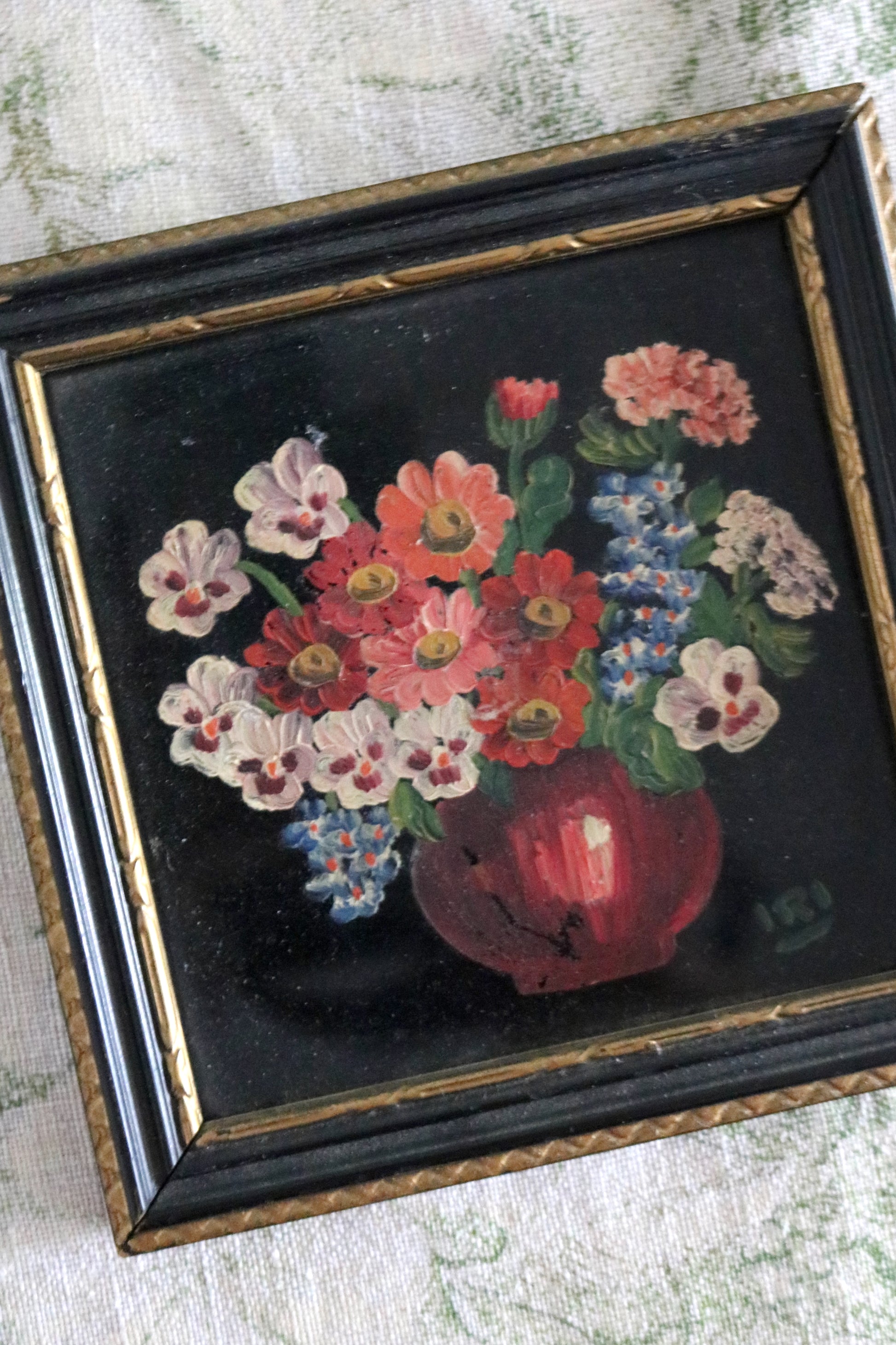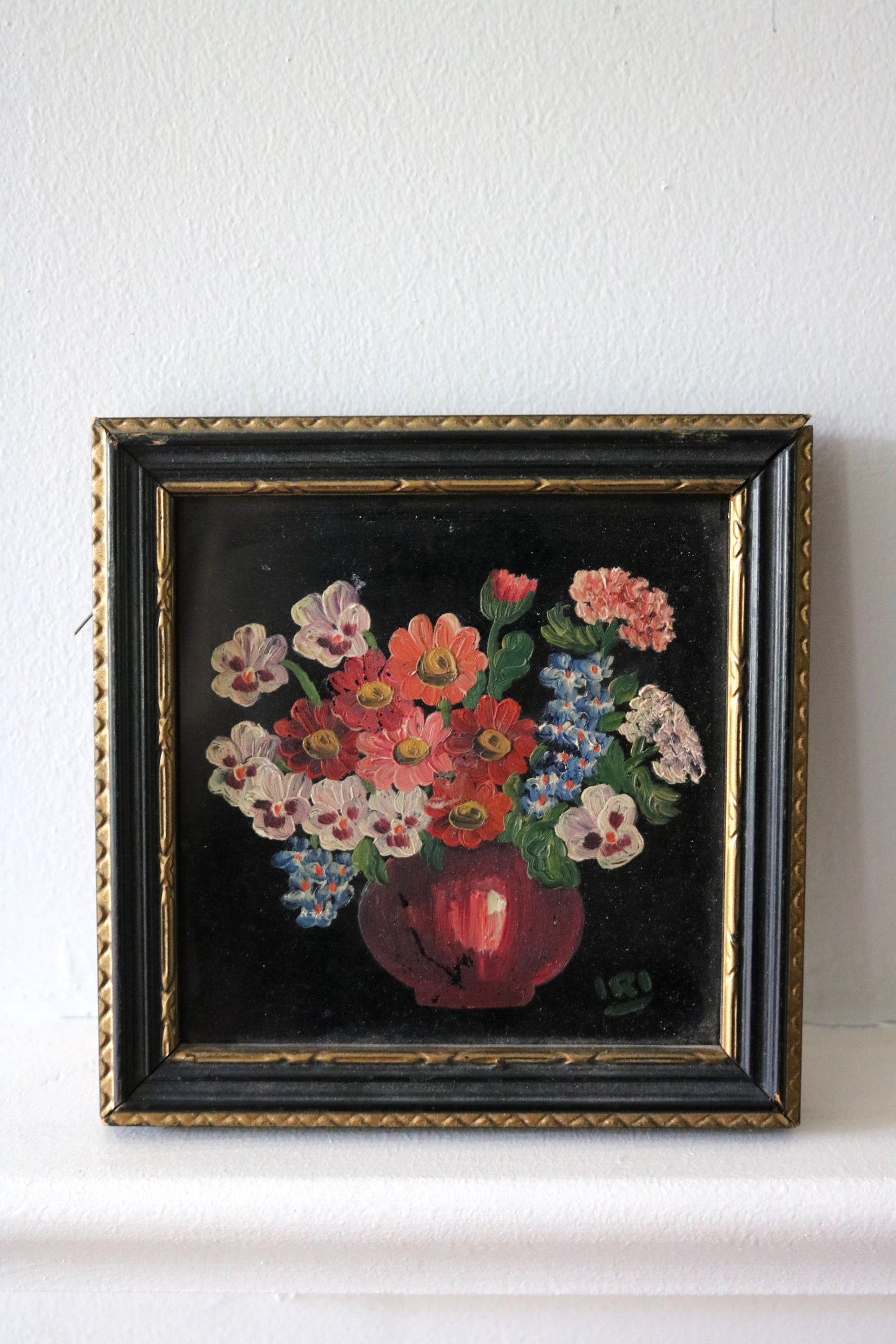 A charming vintage floral painting on a moody black glass background, signed Iri.