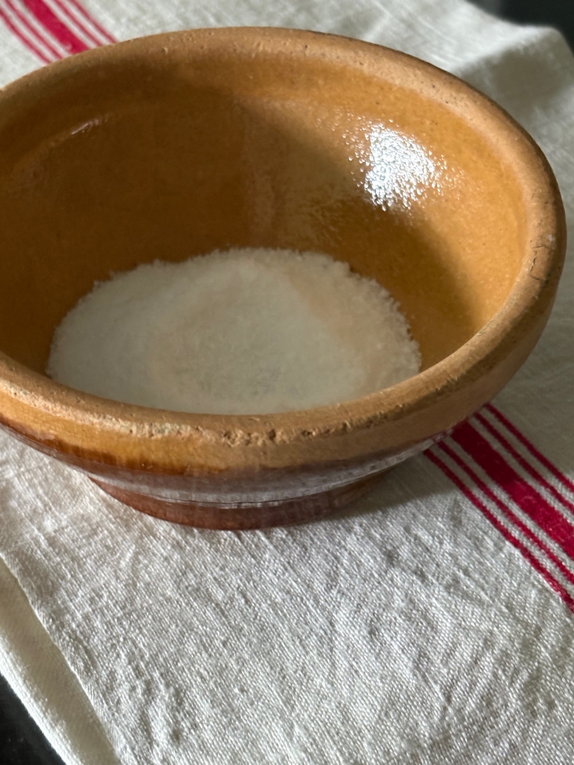 A lovely old glazed French stoneware bowl, perfect as a salt pinch bowl on your counter, sourced at a brocante in Brittany, France. A great brown glaze on exterior, the interior is a caramel/ochre colour.