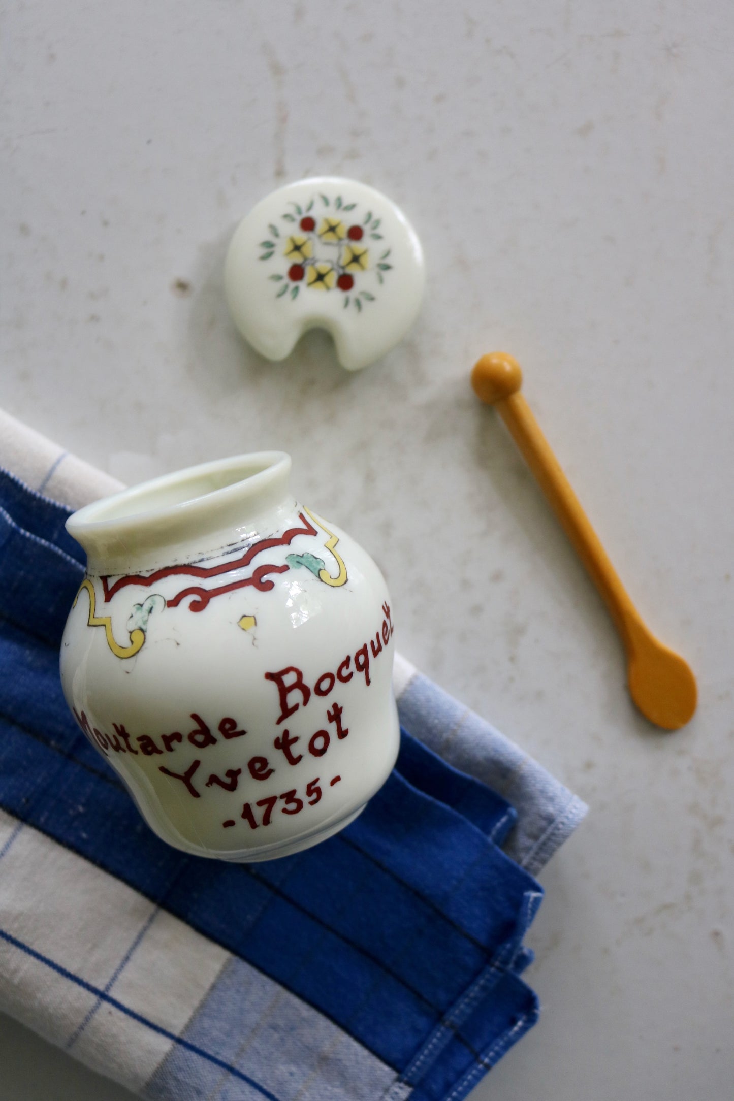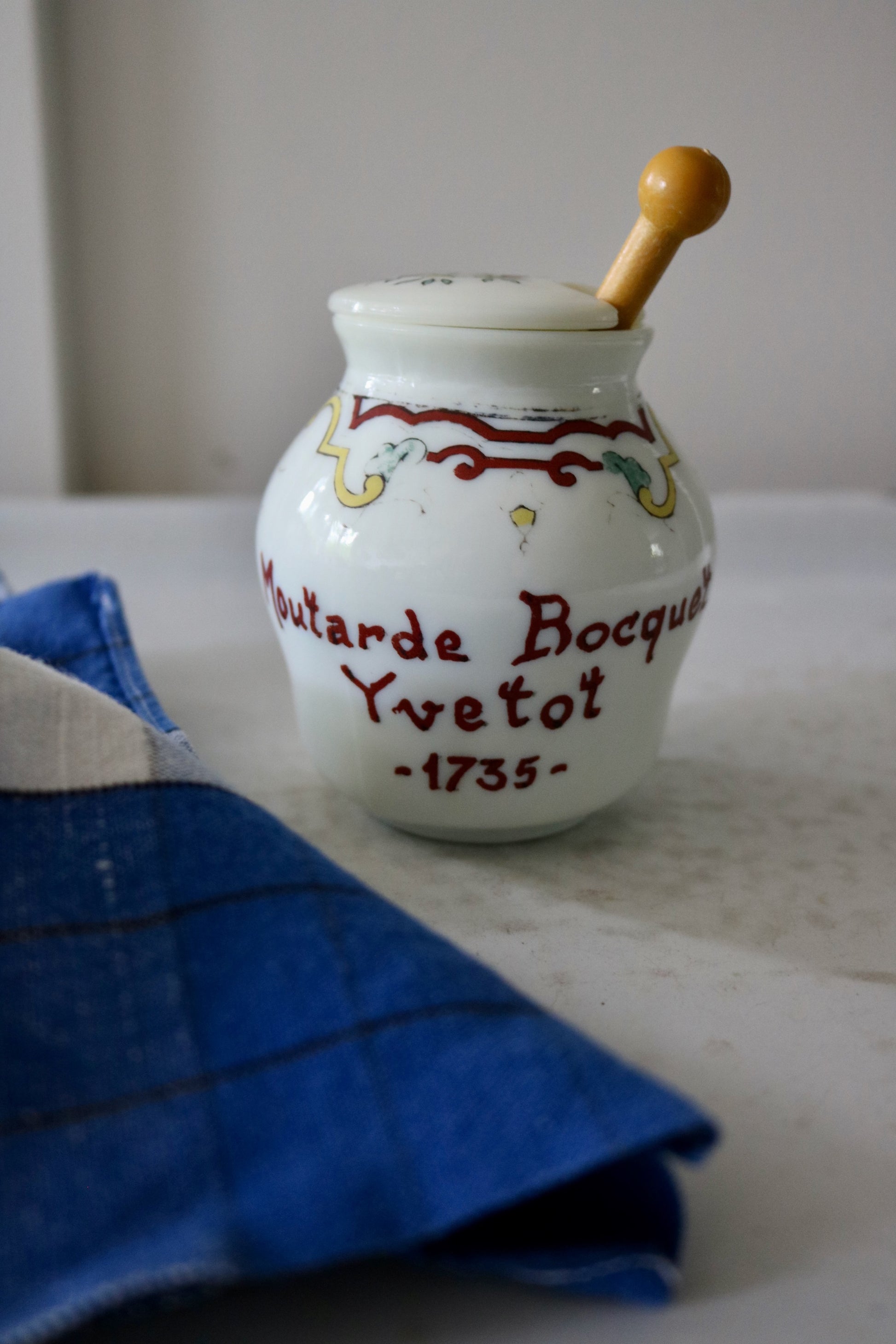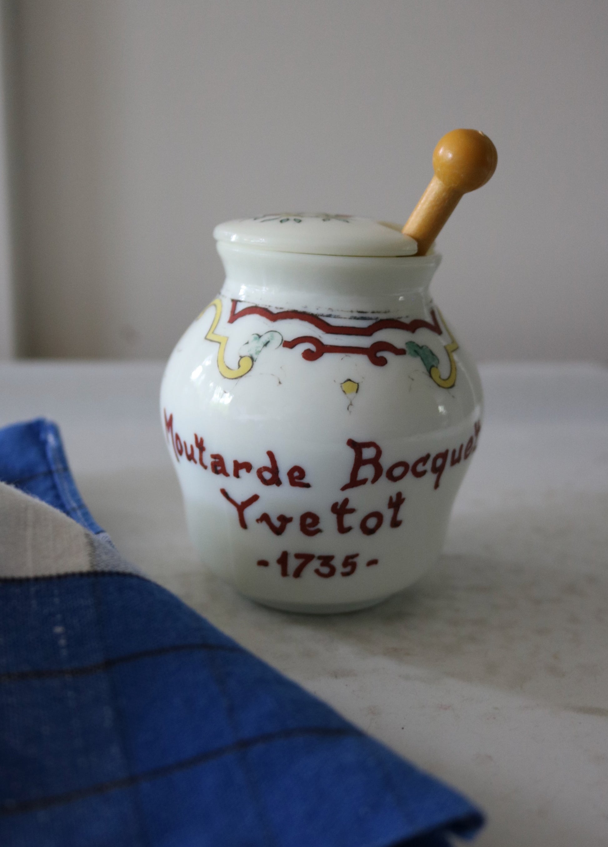 Vintage French mustard jar from 'Moutarde Bocquet Yvetot 1735' with lid and yellow spoon. Charming hand-painted design in red, yellow and a hint of blue on Opalex milk glass. Perfect little condiment jar.