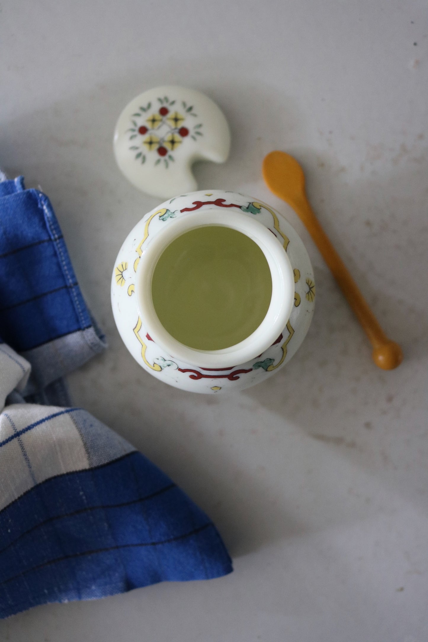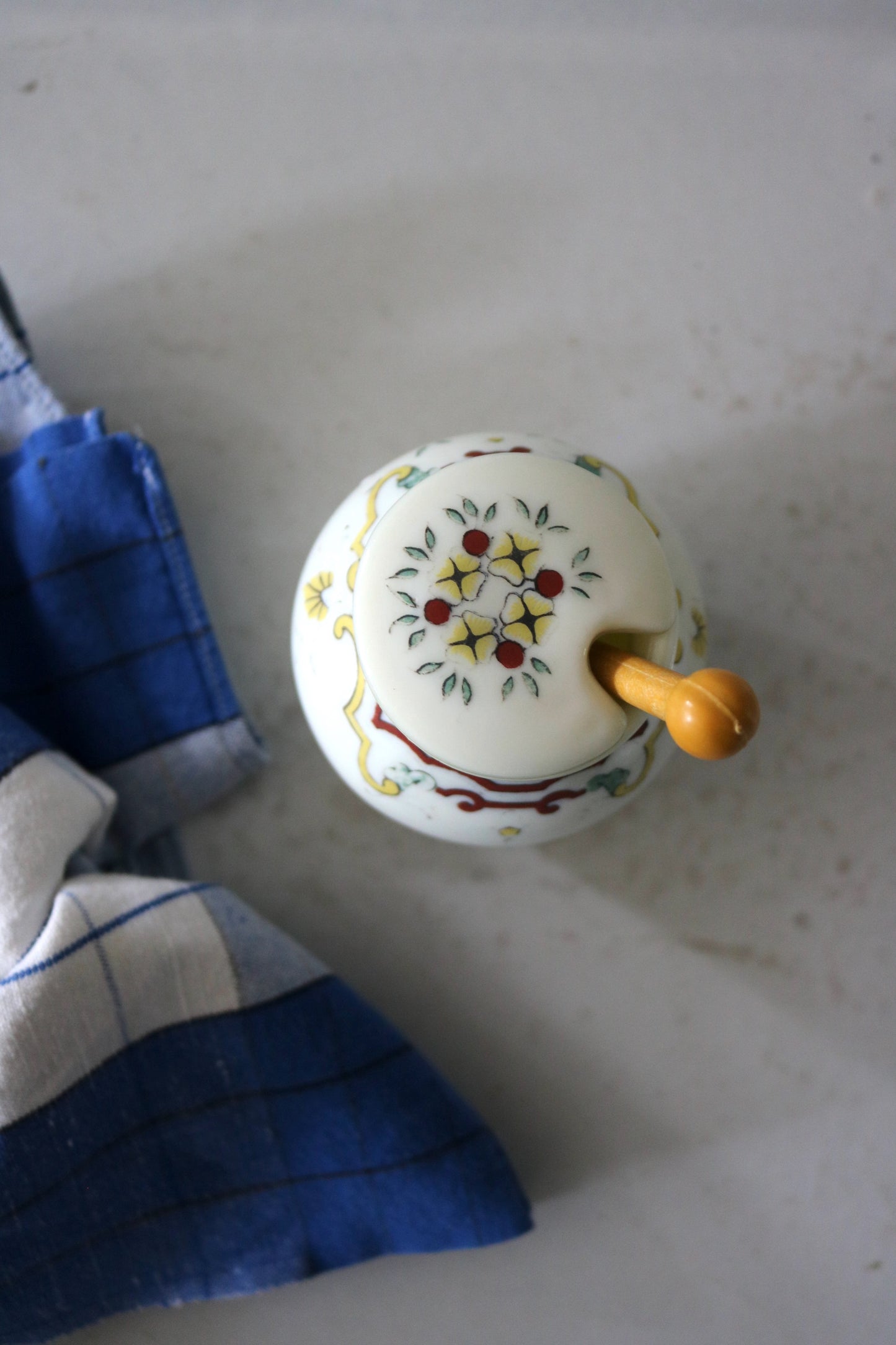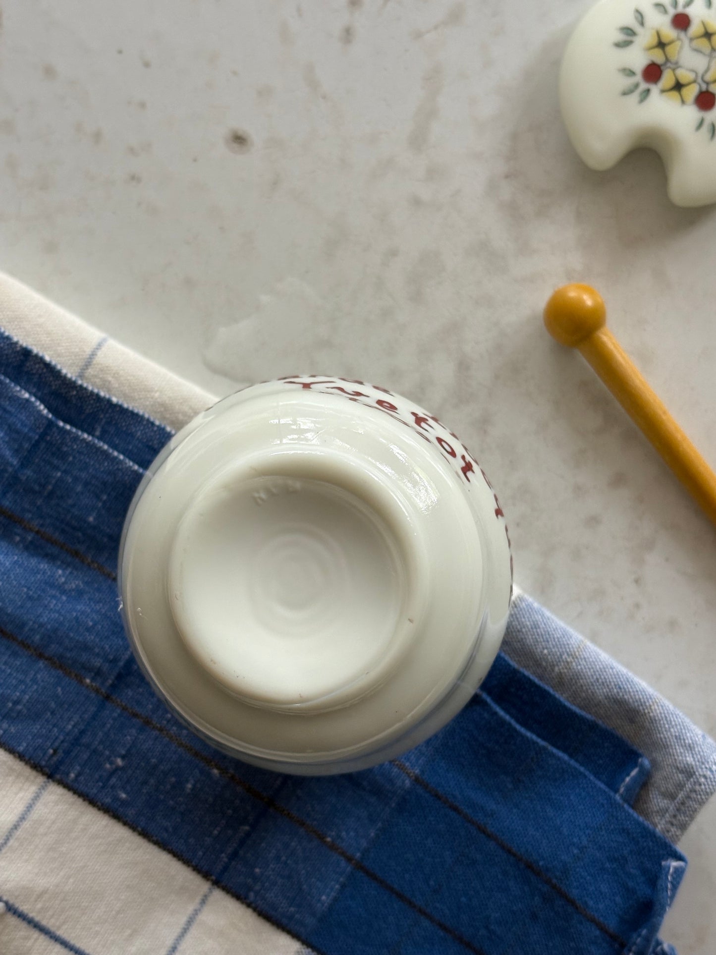 Vintage French mustard jar from 'Moutarde Bocquet Yvetot 1735' with lid and yellow spoon. Charming hand-painted design in red, yellow and a hint of blue on Opalex milk glass. Perfect little condiment jar.