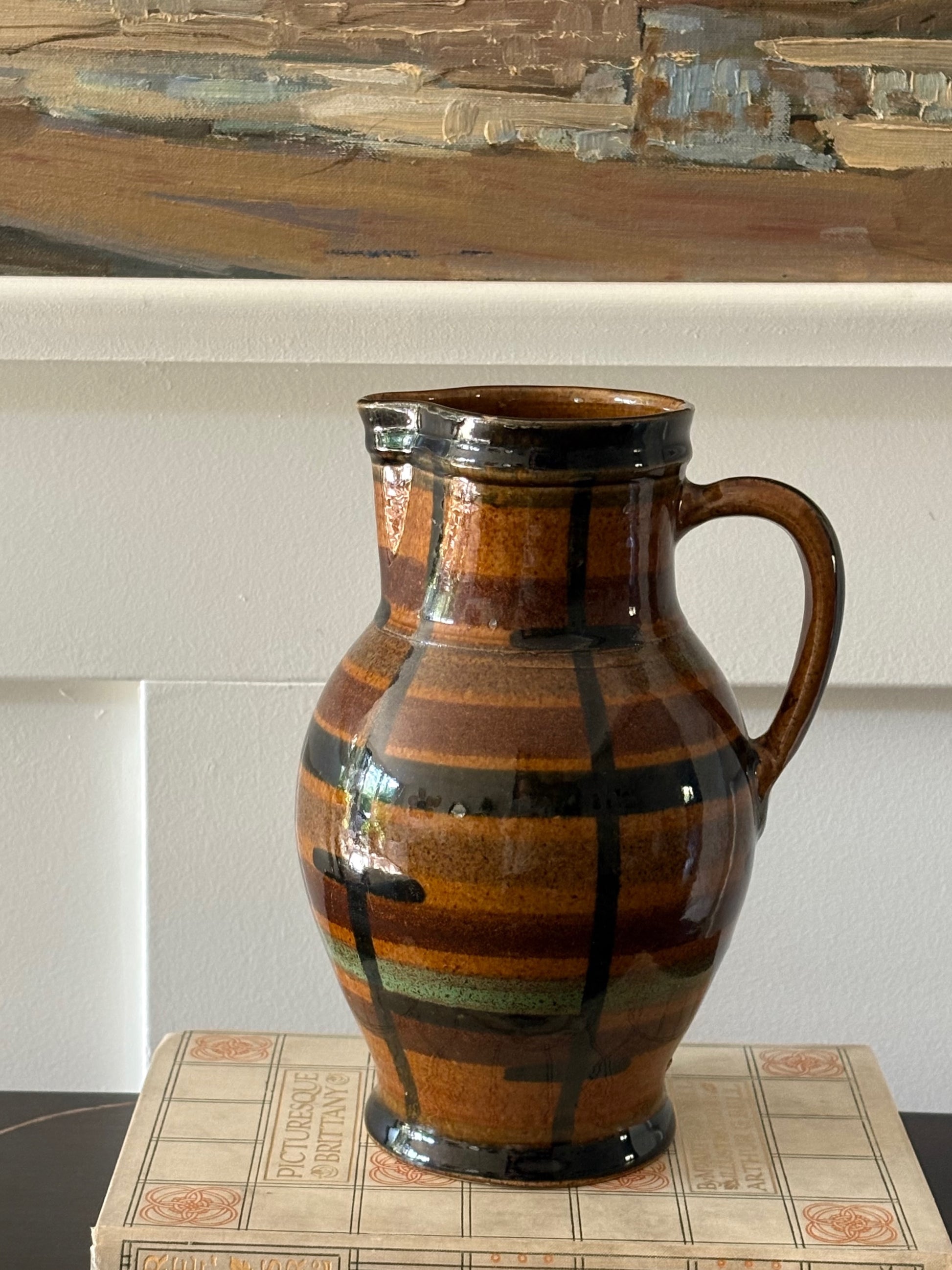 A gorgeous hand painted vintage German earthenware jug. Rich, toasty warm autumn colours - browns, black and green in a striped, almost checkered or plaid like design. Fully glazed inside and out. Makes a lovely floral vase.