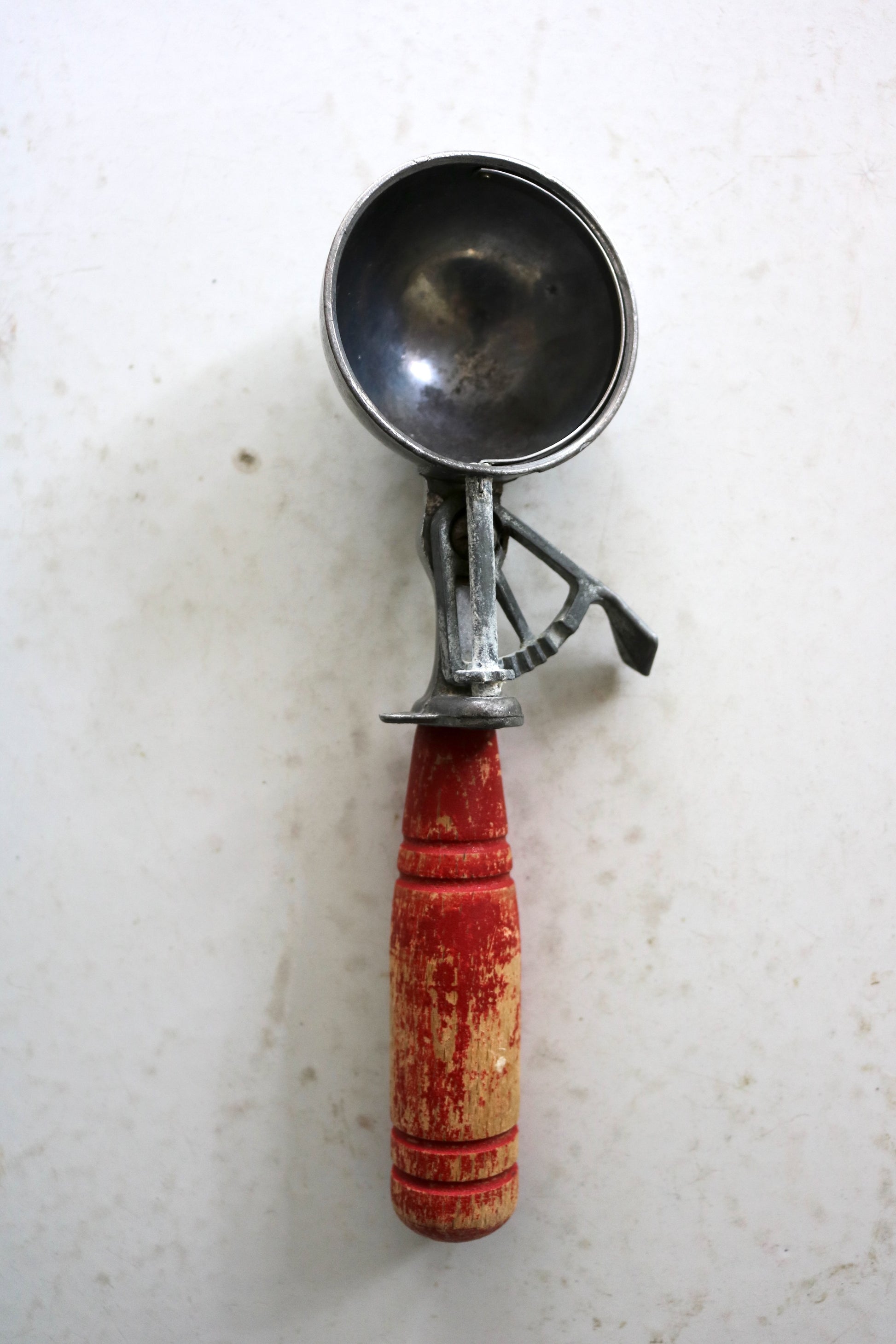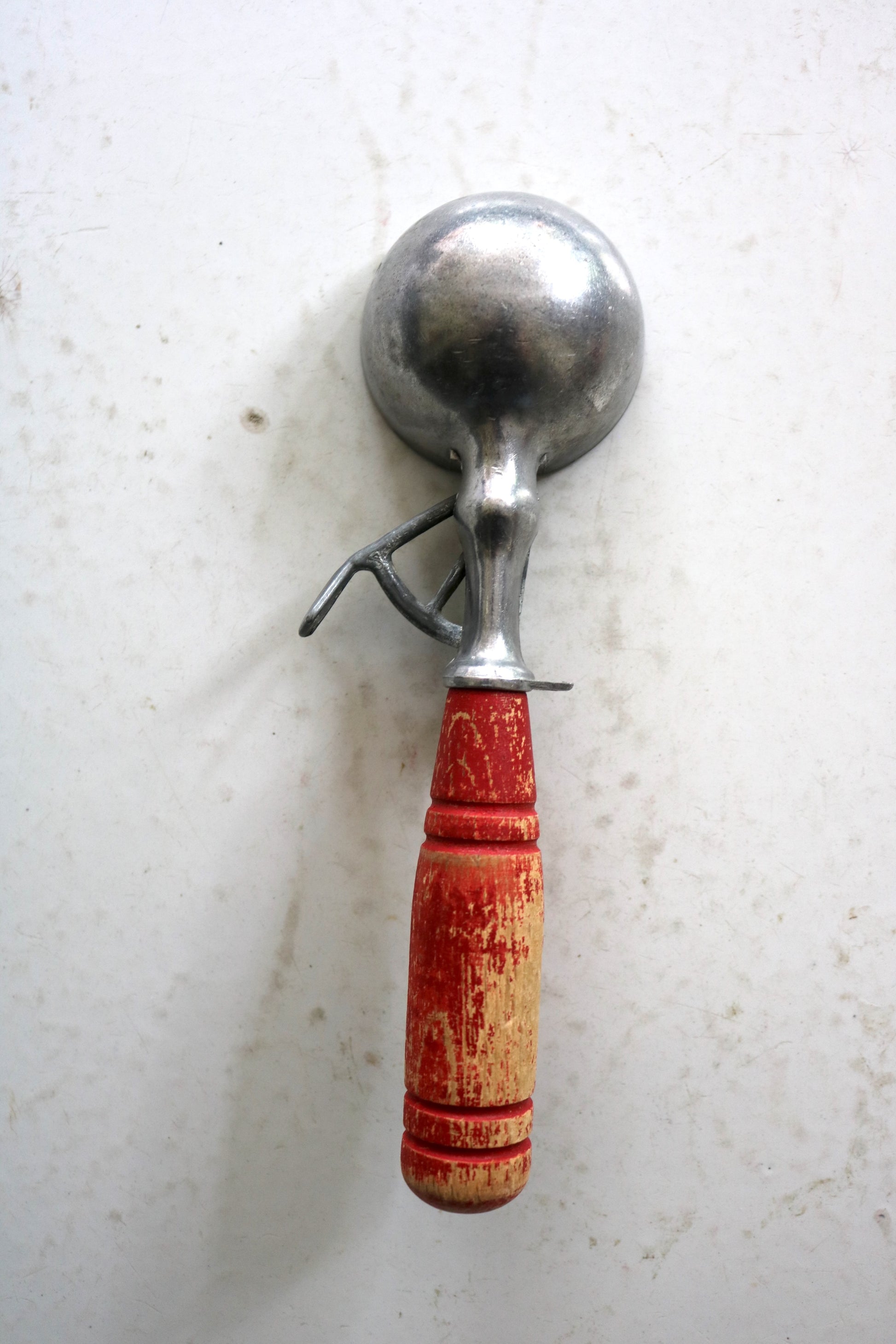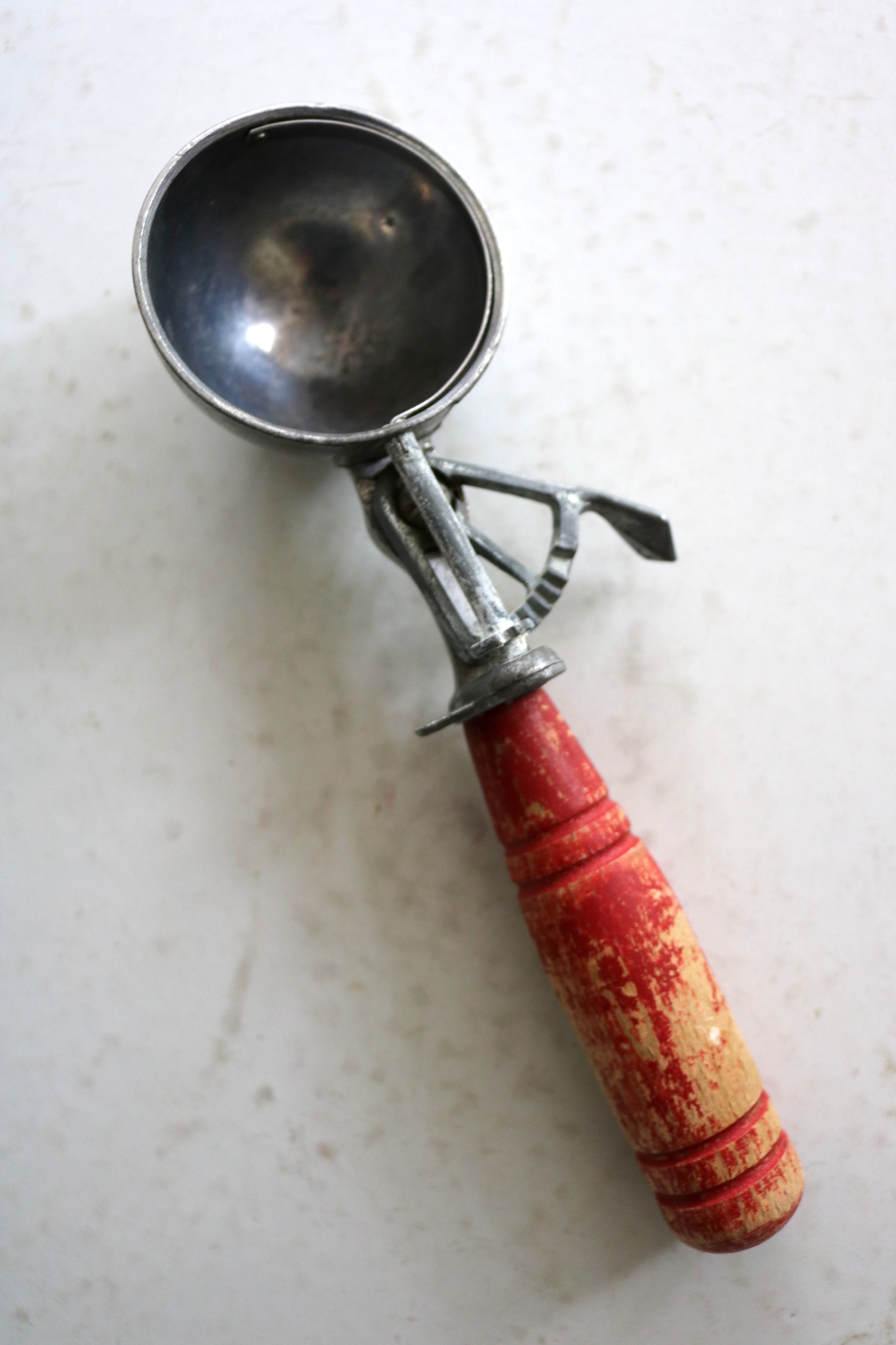 Charming vintage ice cream scoop with red wood handle. Fun for summer entertaining, photo props.