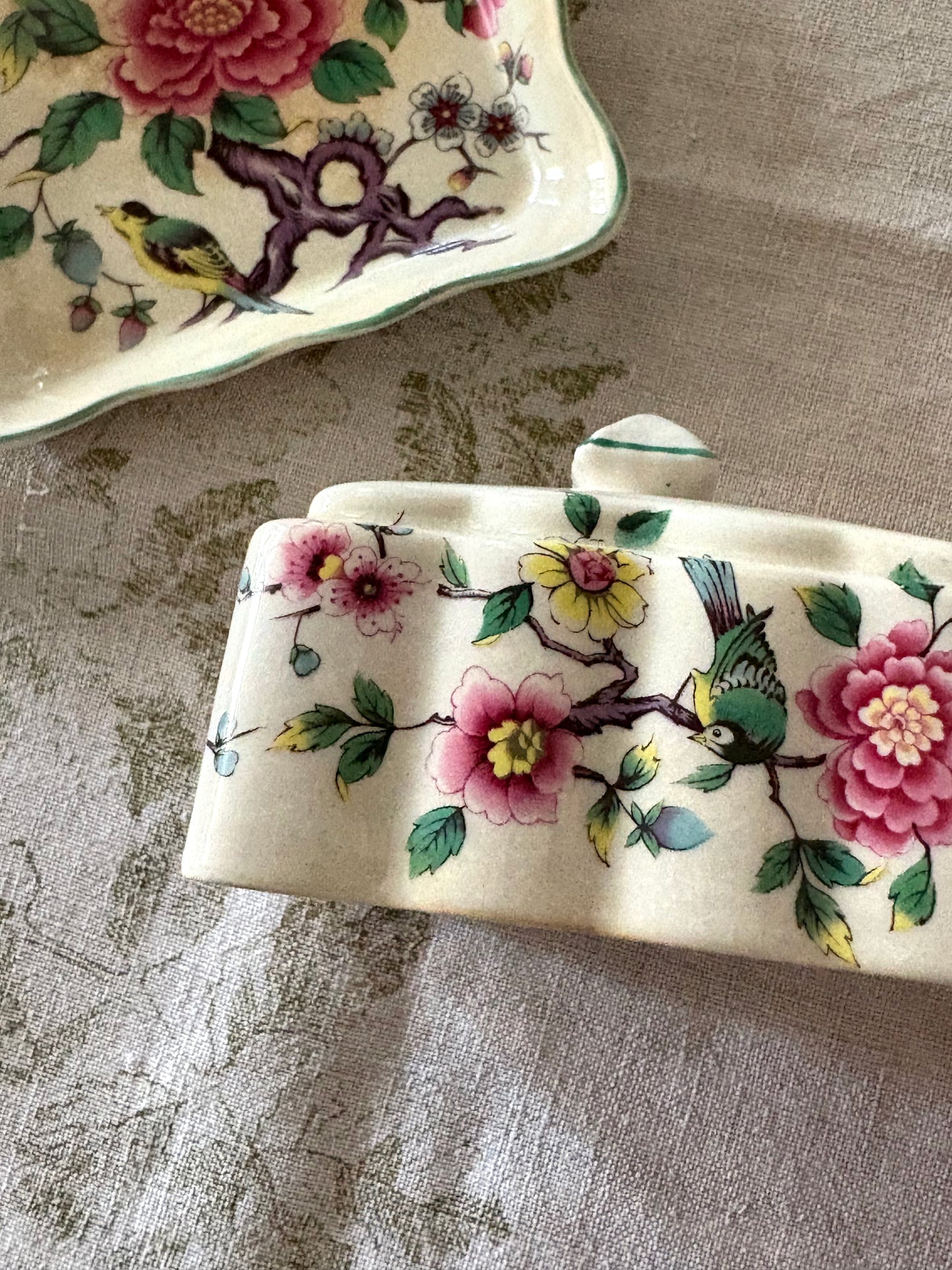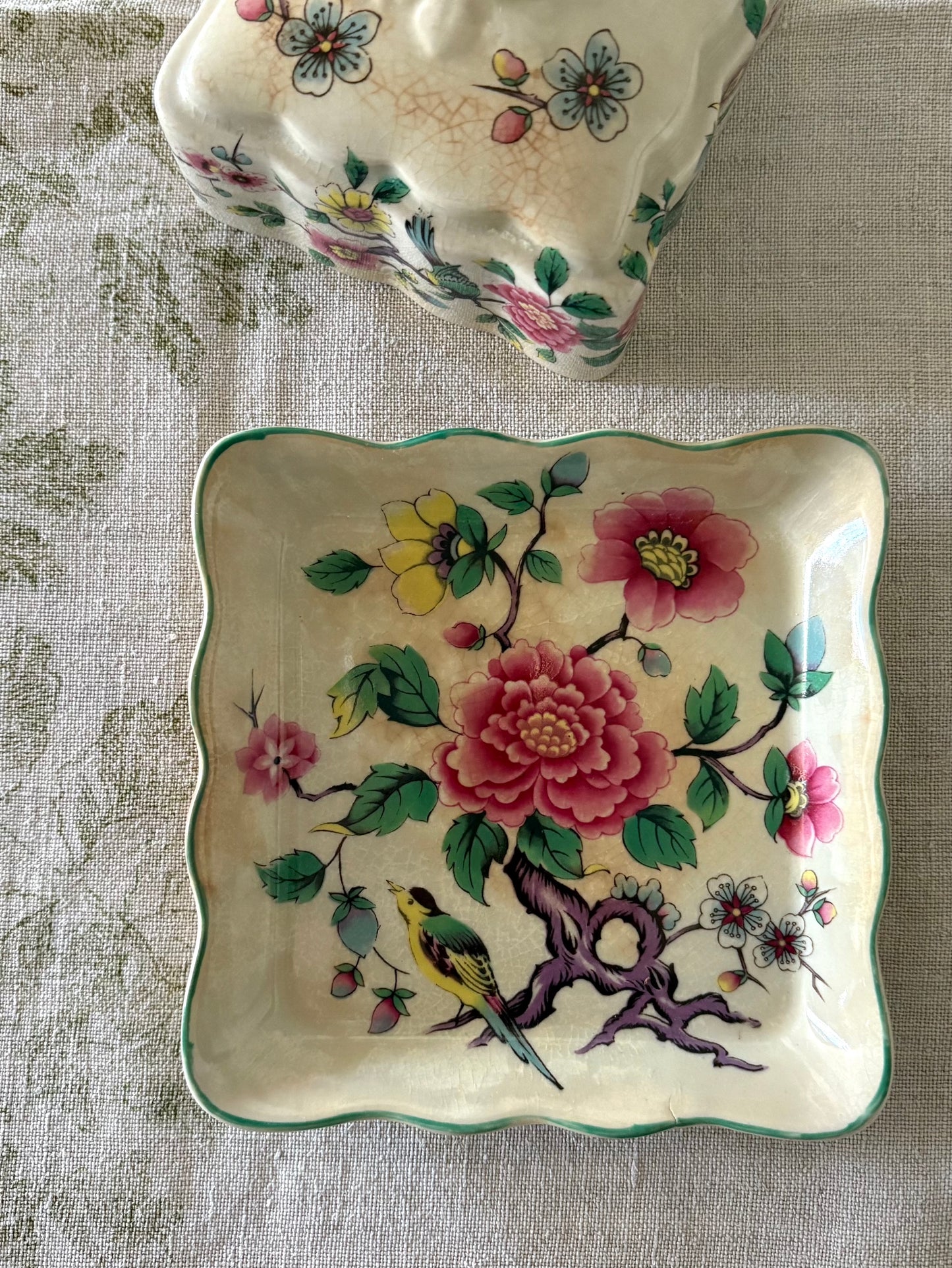 A lovely antique lidded dish featuring a pretty floral and bird design. A lovely piece for a vanity to hold jewelry.