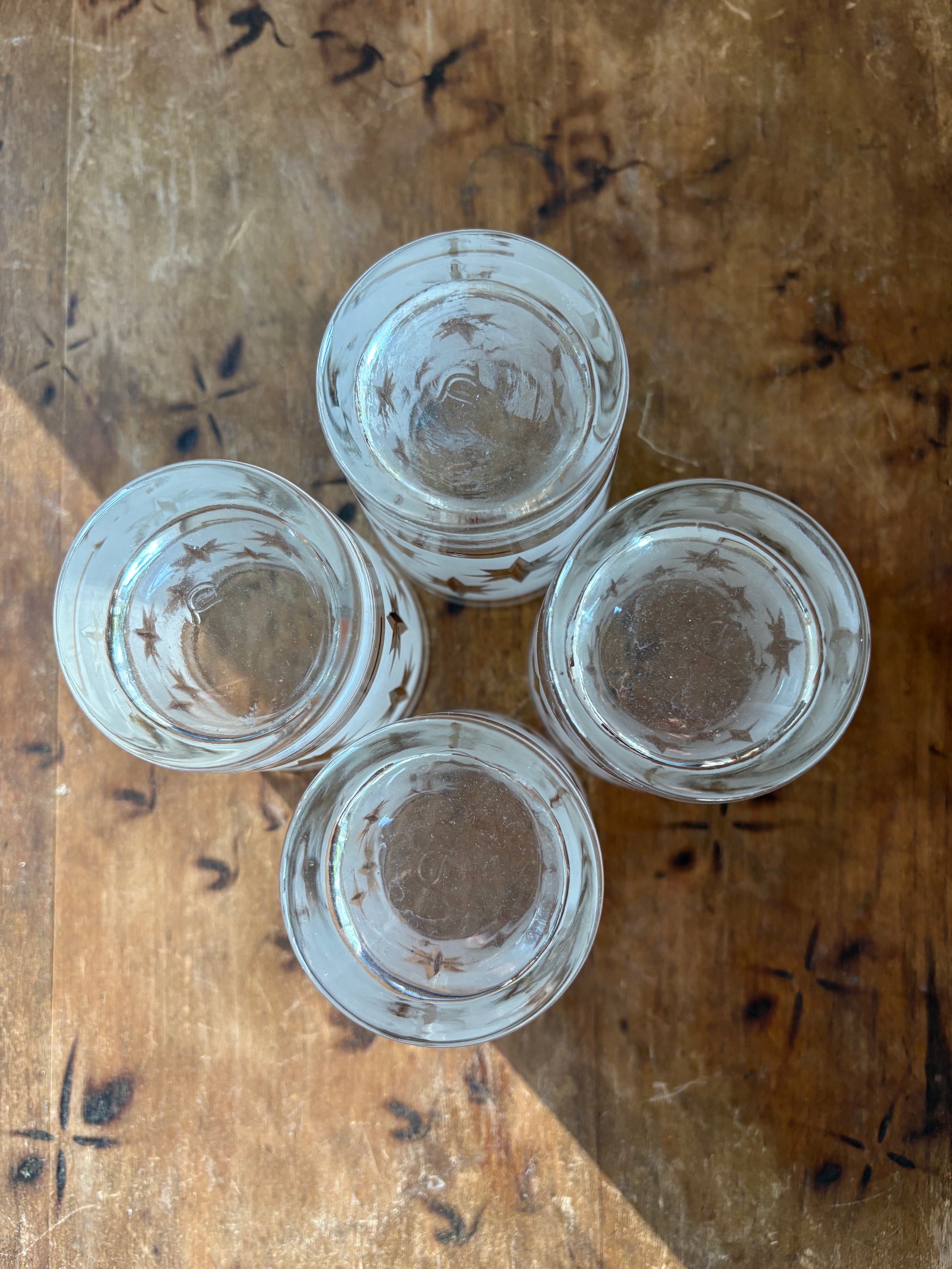 A fabulous set of mid century era frosted glassware tumblers with gold starbursts.