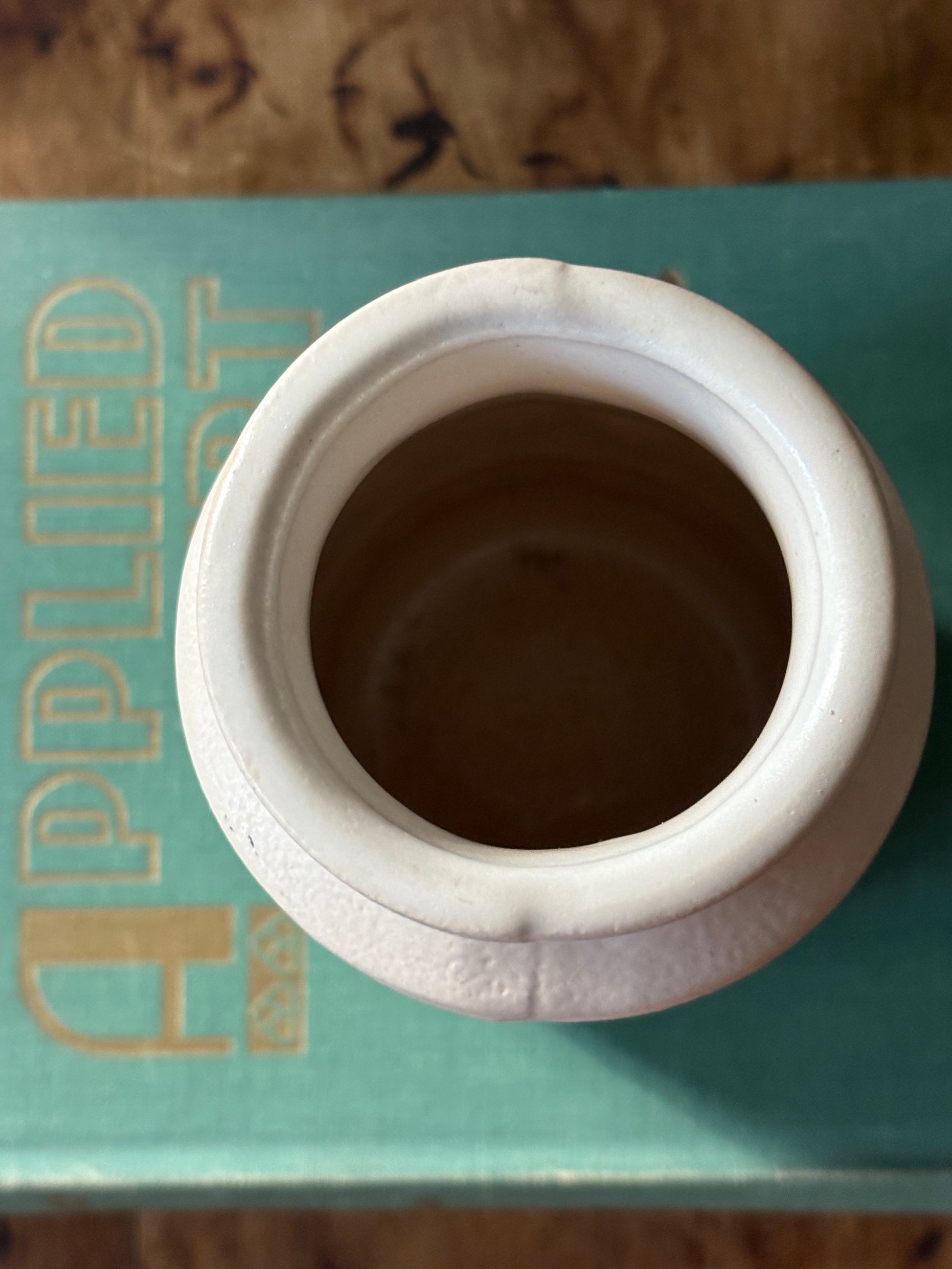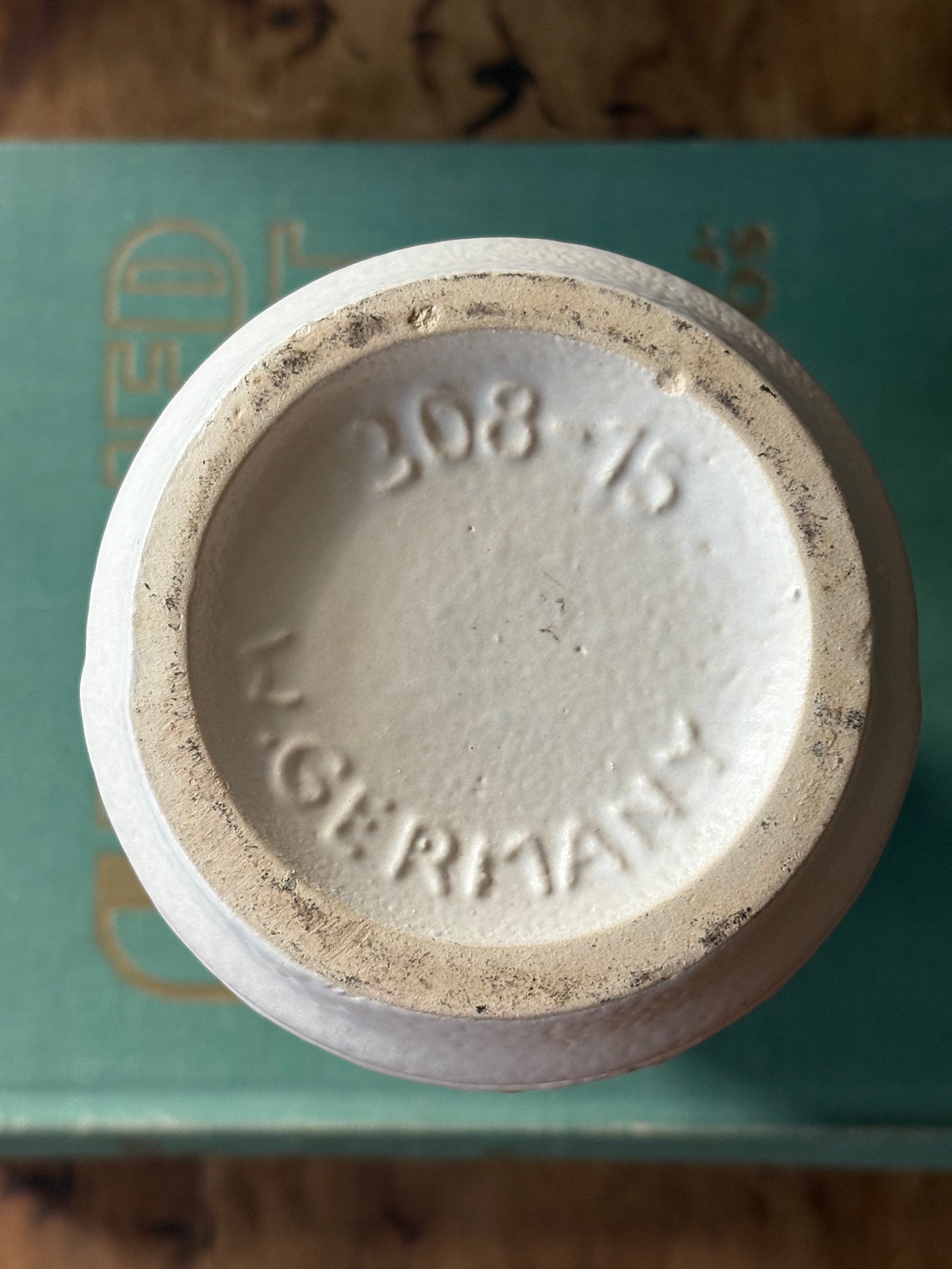 Vintage mid century West German vase made by Scheurich. Features a matte white glaze and geometric relief pattern. A lovely display piece and floral vase.