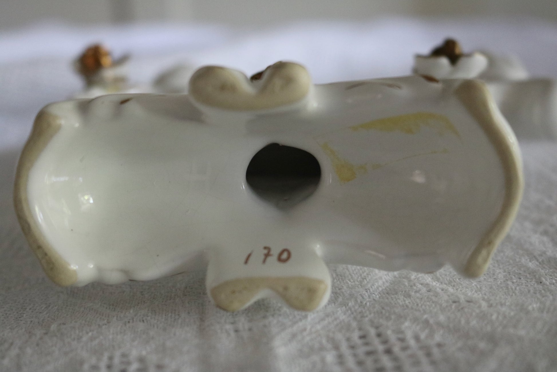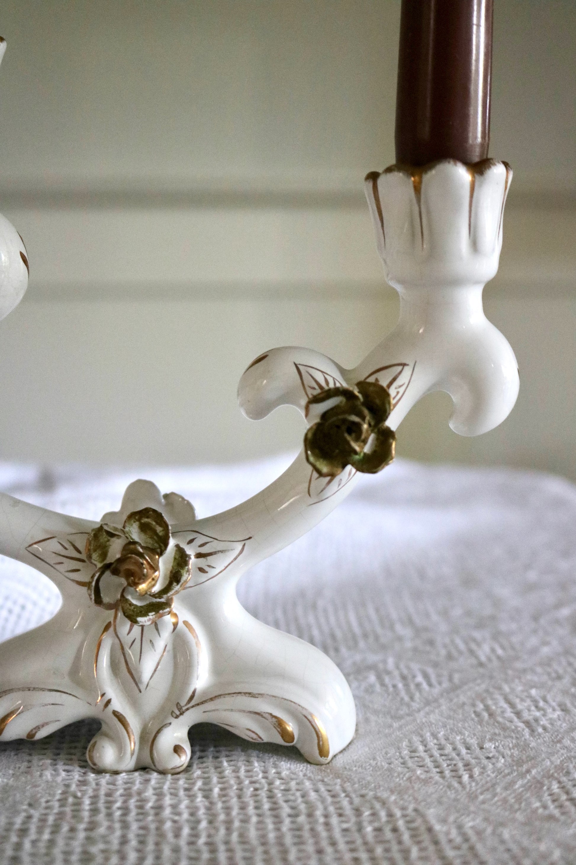Pretty rococo style porcelain candleholder / candelabra decorated with gold gilding and rose accents. In the Portuguese ELPA Alcobaça style. Holds two pillar candles.