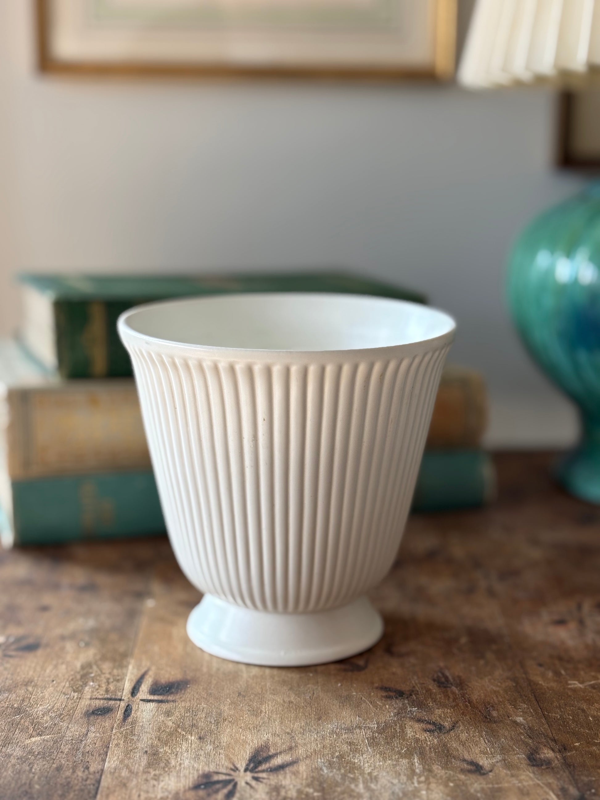 A lovely vintage mid-century Wedgwood footed planter with ribbed design in a satin creamy white glaze known as Moonstone.